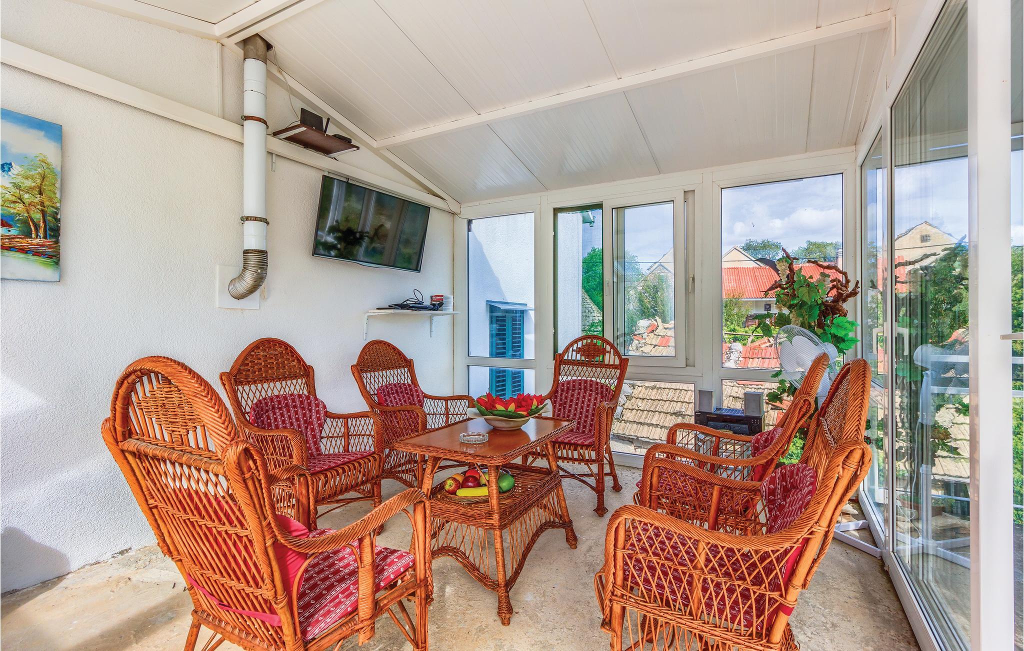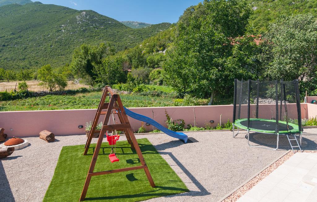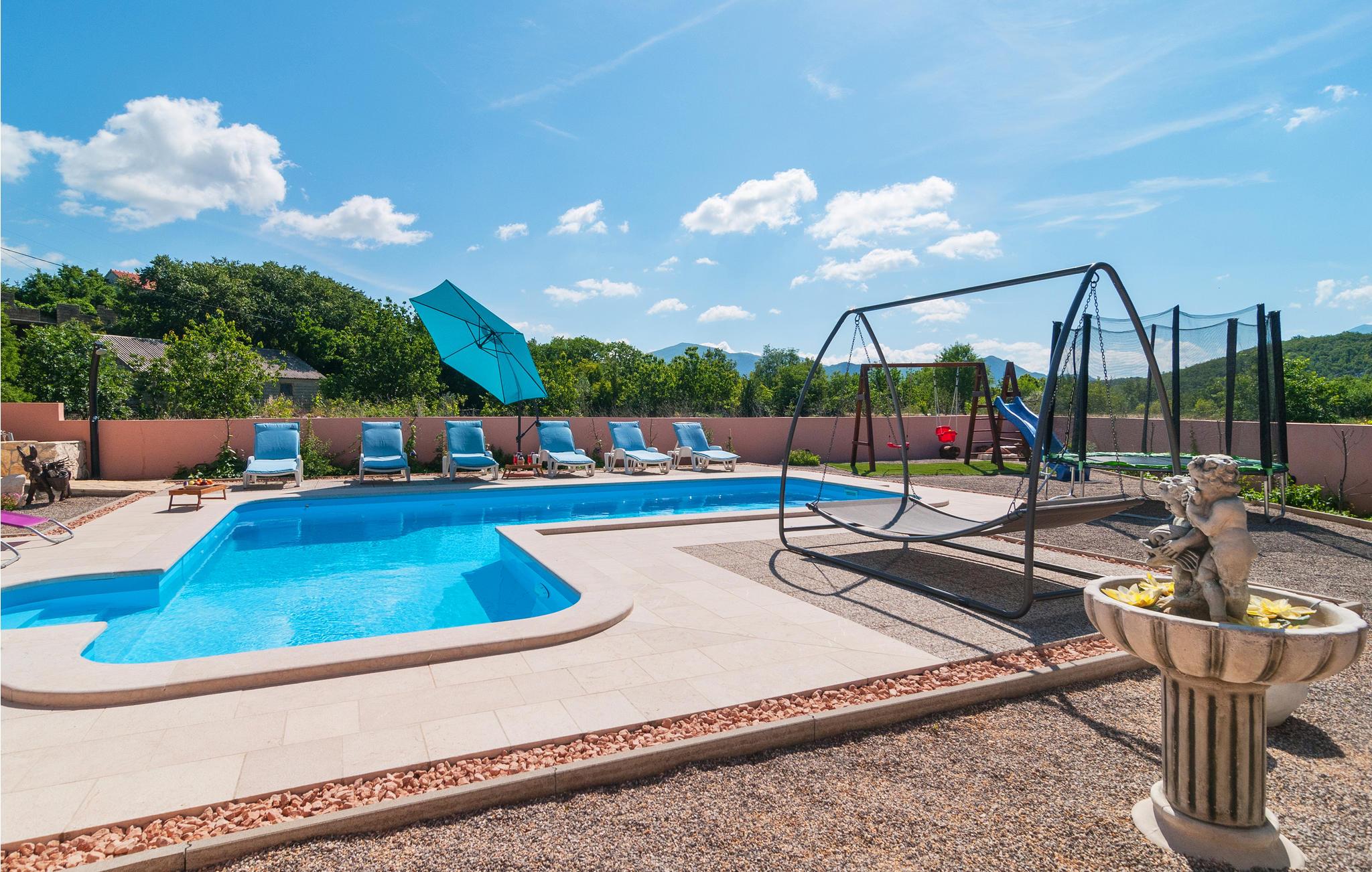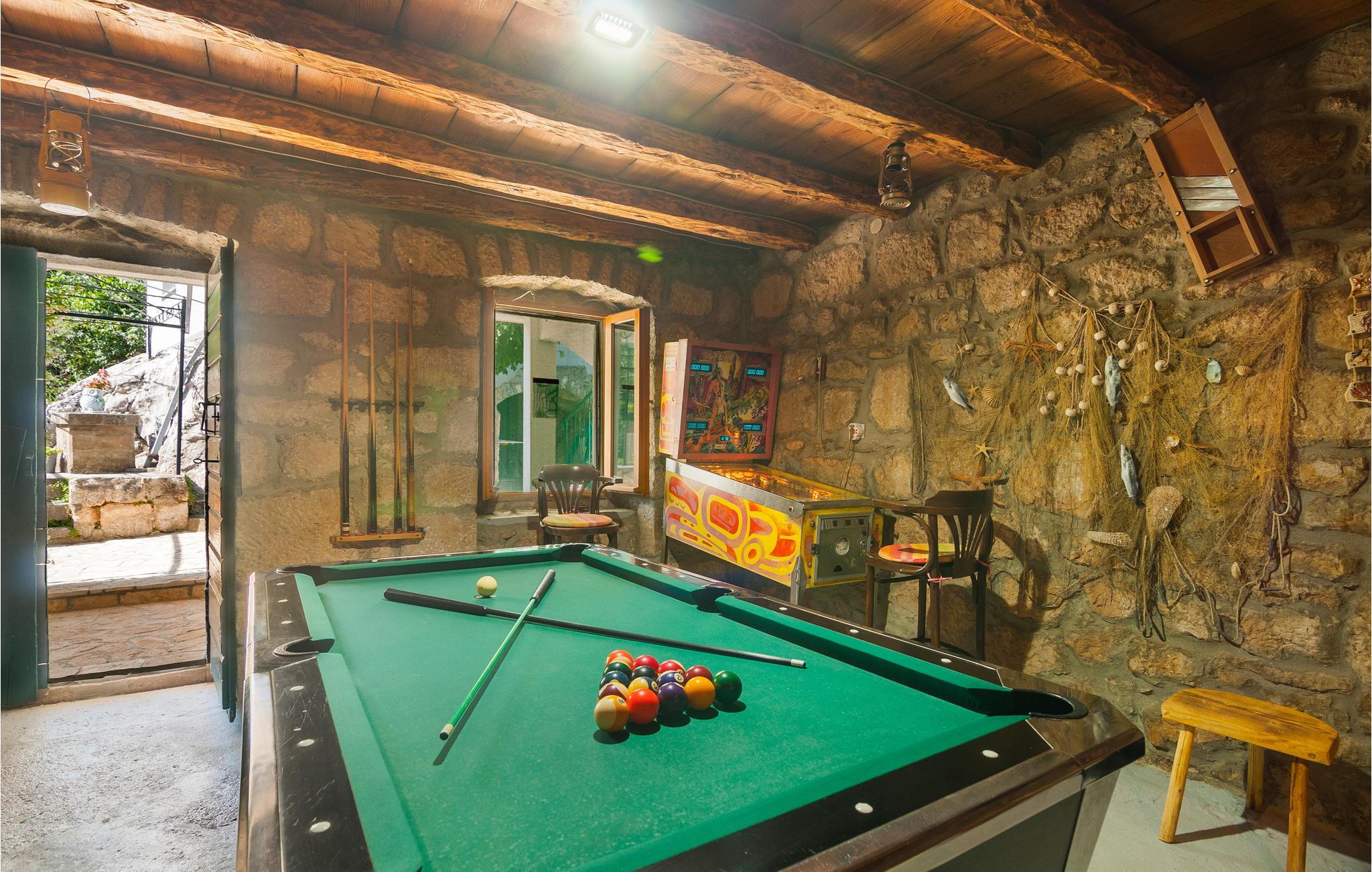 Denne bebyggelse består af to huse på en lukket grund. Et skønt sted at holde ferie i autentiske og rolige omgivelser, men også tæt på Makarska rivieraen. Det store hus er indrettet i traditionel dalmatisk stil. På tageetagen skråner væggene 1 m fra gulvet, og her er der soveværelse med 2 badeværelser. På første sal er der et traditionelt køkken og i stueetagen er der aktivitetsrum med den dalmatisk kamin. I det lille hus er enkelt og moderne indrettet og rummer to soveværelser, et køkken og et badeværelse med separat indgang. Den store pool har en lavvandet del til små børn. På 30 min kommer I til den skønne landsby Brela med den af Dalmatiens smukkeste kiesstrande