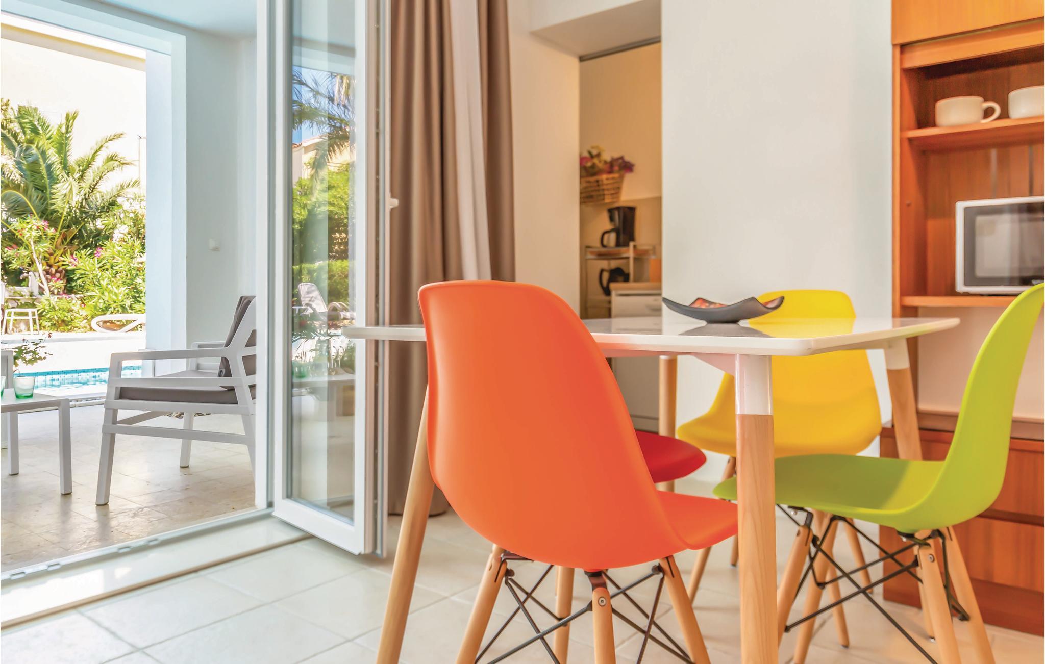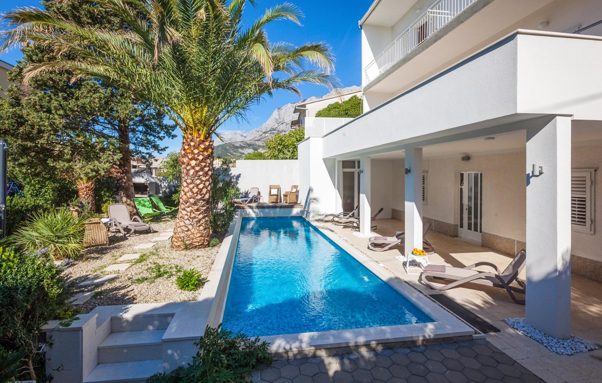 Disse komfortable lejligheder ligger i centrum af det populære turiststed Makarska. I den indhegnede gårdsplads byder den fælles opvarmede udendørs swimmingpool på en forfriskende dukkert i de grønne, frodige omgivelser. Den rummelige ferielejlighed CDE530 er komfortabelt indrettet, og ligger på første sal. CDC221 er en mindre ferielejlighed beliggende i stueetagen. CDE722 ligger på anden sal. En grill og en legeplads står til fælles rådighed for lejlighederne. Centrum ligger ca. 200 m væk, og stranden kan nås på få minutter til fods.