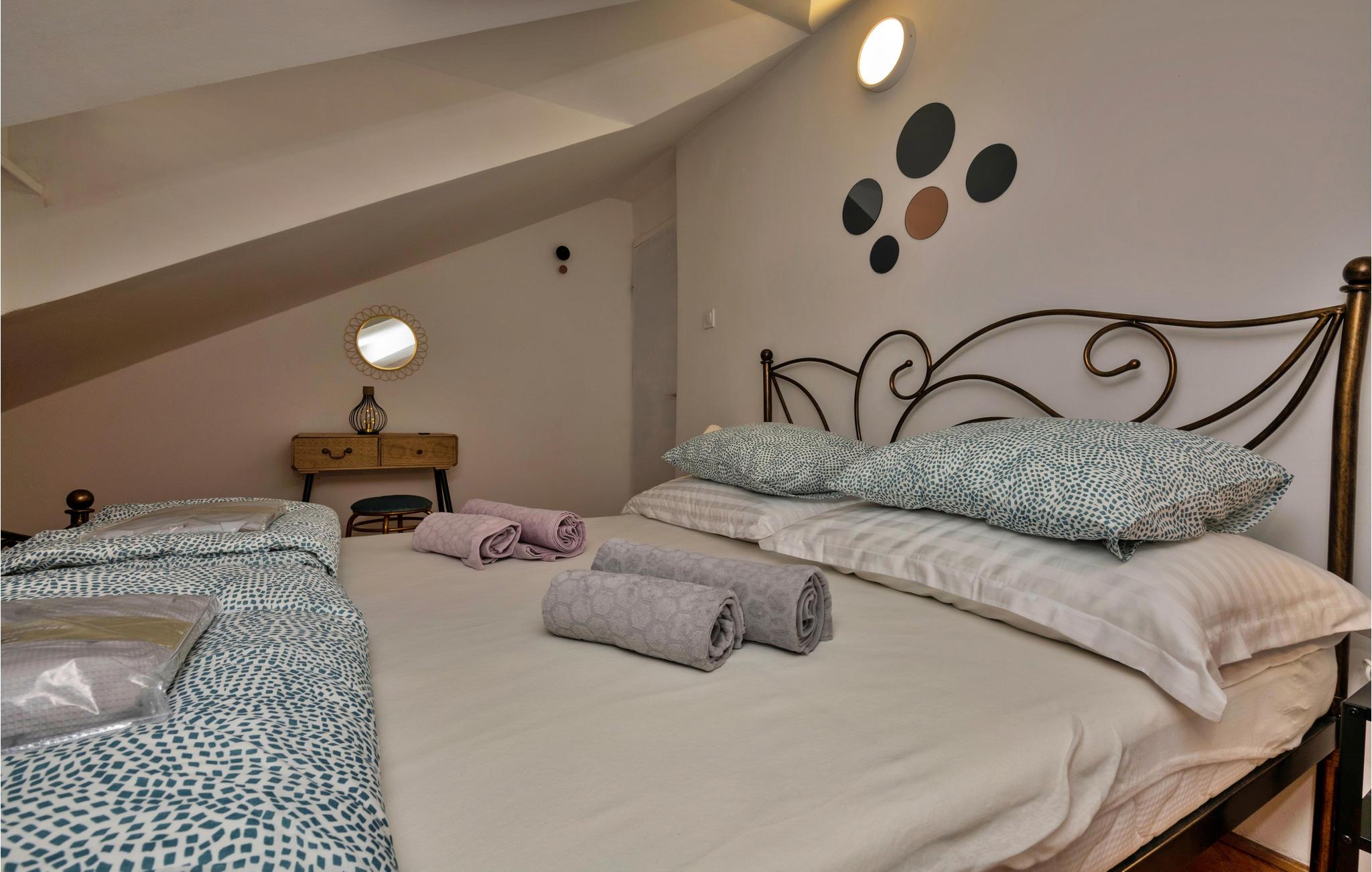 Denne rummelige og moderne lejlighed ligger på femte og øverste etage i en beboelsesbygning og er velegnet til to par. Lejligheden består af to soveværelser med dobbeltsenge og en stue, et køkken, en spisestue og et badeværelse. Lejligheden har delvis udsigt over havet og byen.
