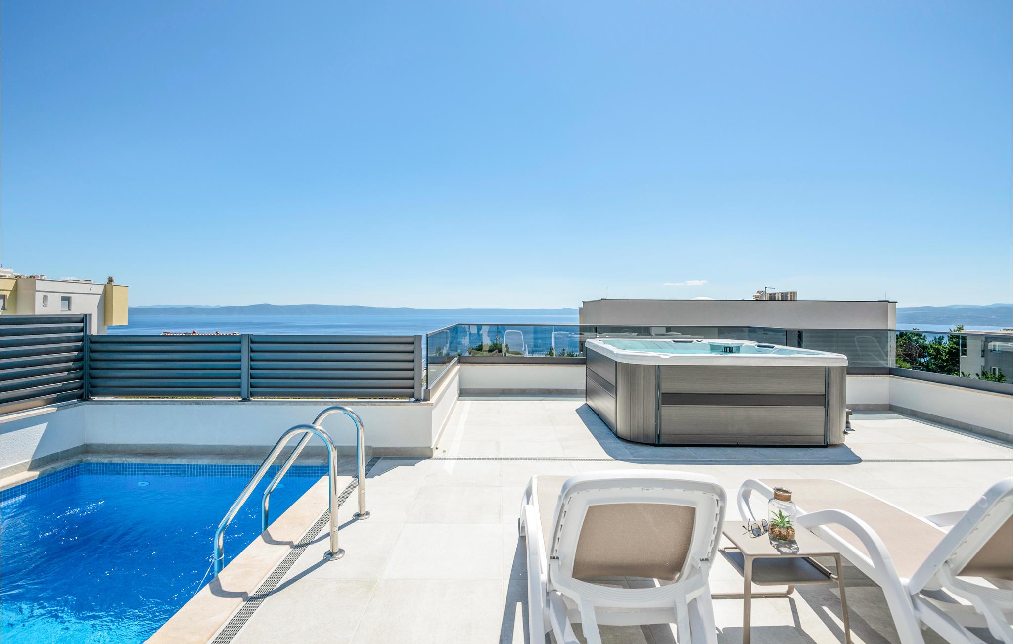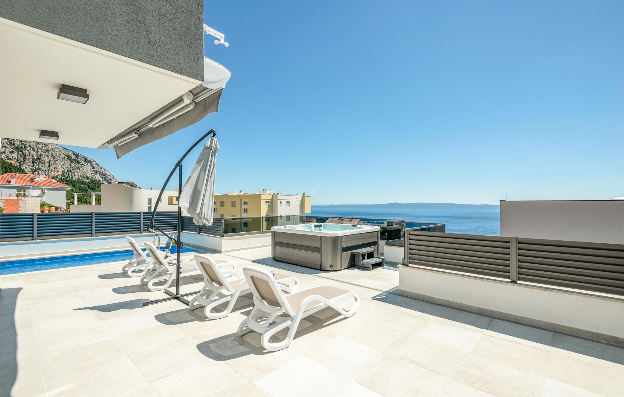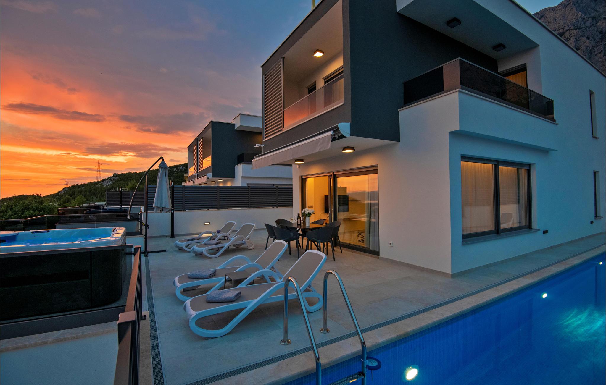 Dette dejlige og veludstyrede feriehus med pool blev bygget i 2021 og ligger i Makarska. Huset har aircondition og er i tre etager. I stueetagen er der fitnesscenter og underholdningsrum med billard, bordfodbold og dart. På 1. sal er der stue, køkken og spisestue. På anden sal er der 3 soveværelser med badeværelser. Alle etager er forbundne med trappe.