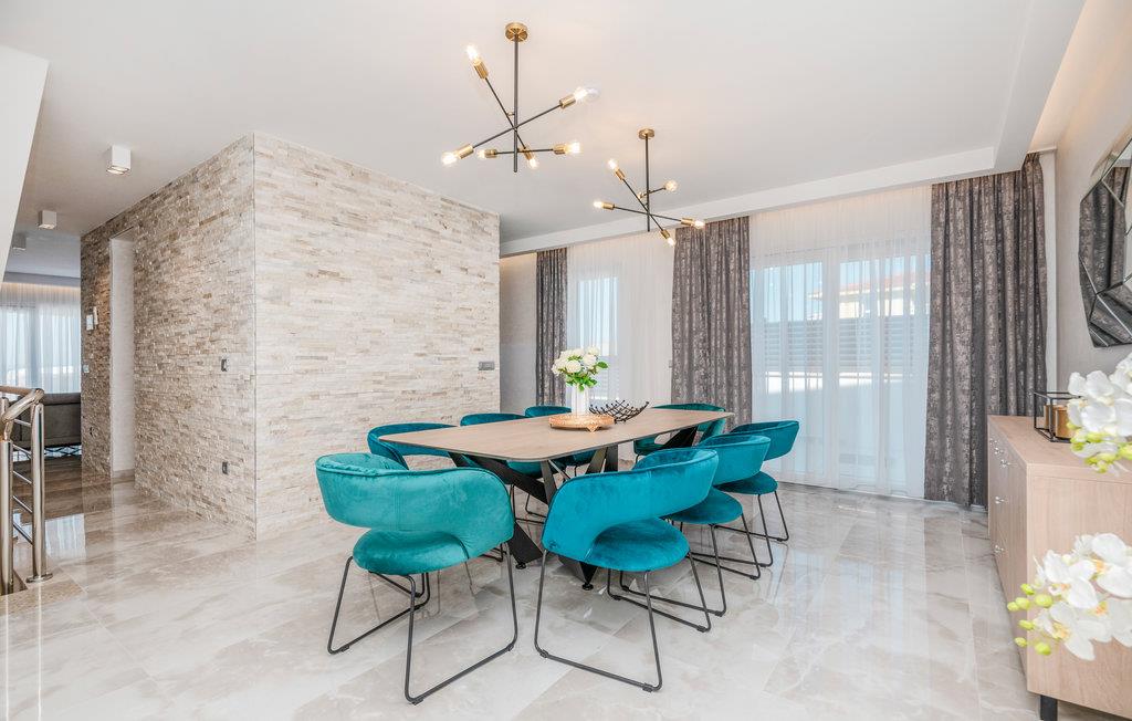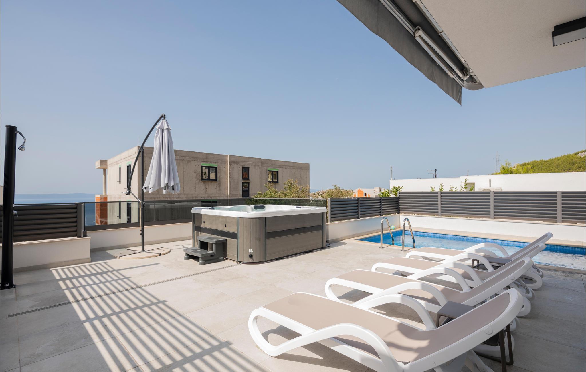 Dette dejlige og veludstyrede feriehus med pool blev bygget i 2021 og ligger i Makarska. Huset har aircondition og er i tre etager. I stueetagen er der fitnesscenter og underholdningsrum med billard, bordfodbold og dart. På 1. sal er der stue, køkken og spisestue. På anden sal er der 3 soveværelser med badeværelser. Alle etager er forbundne med trappe.