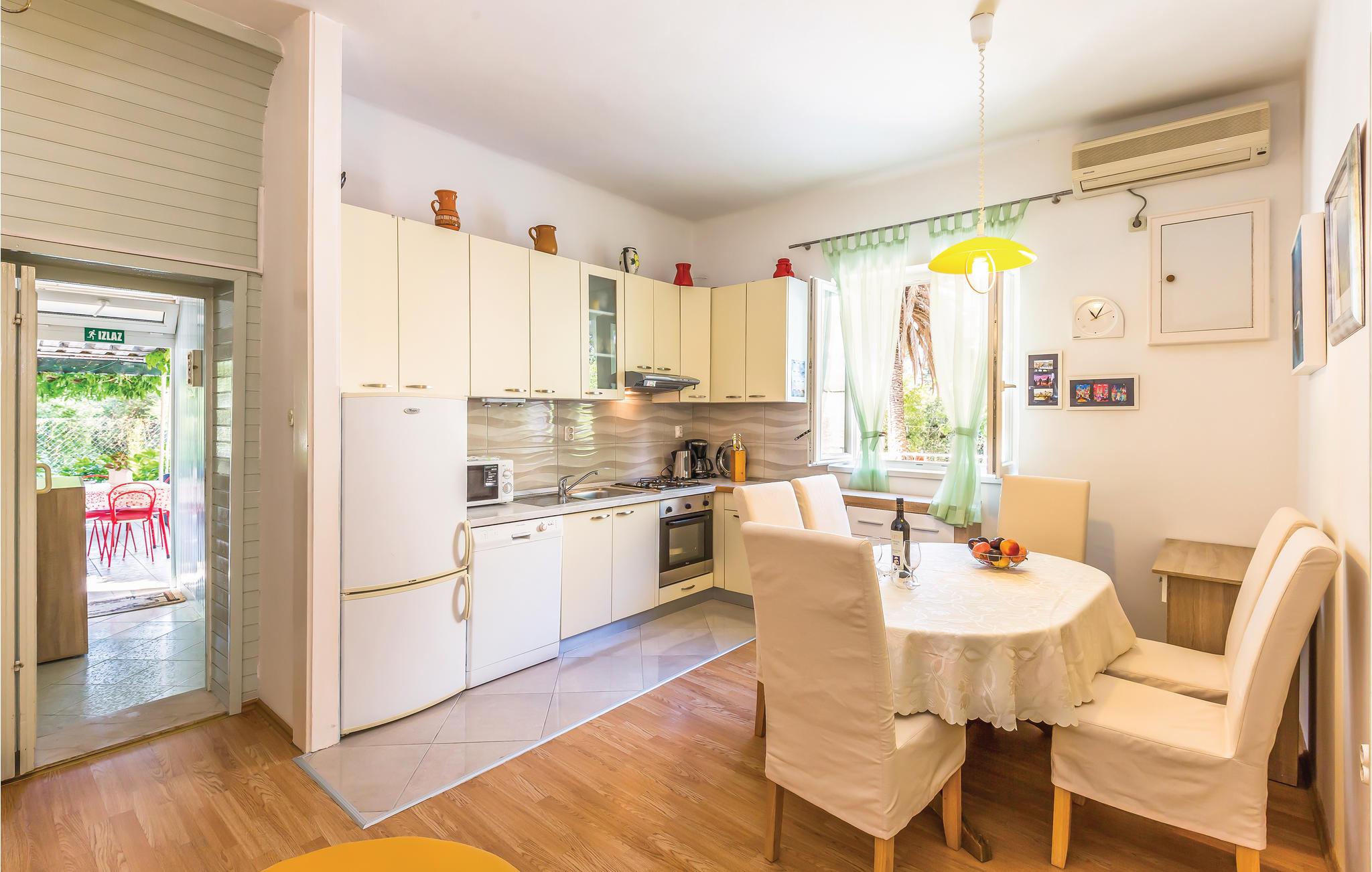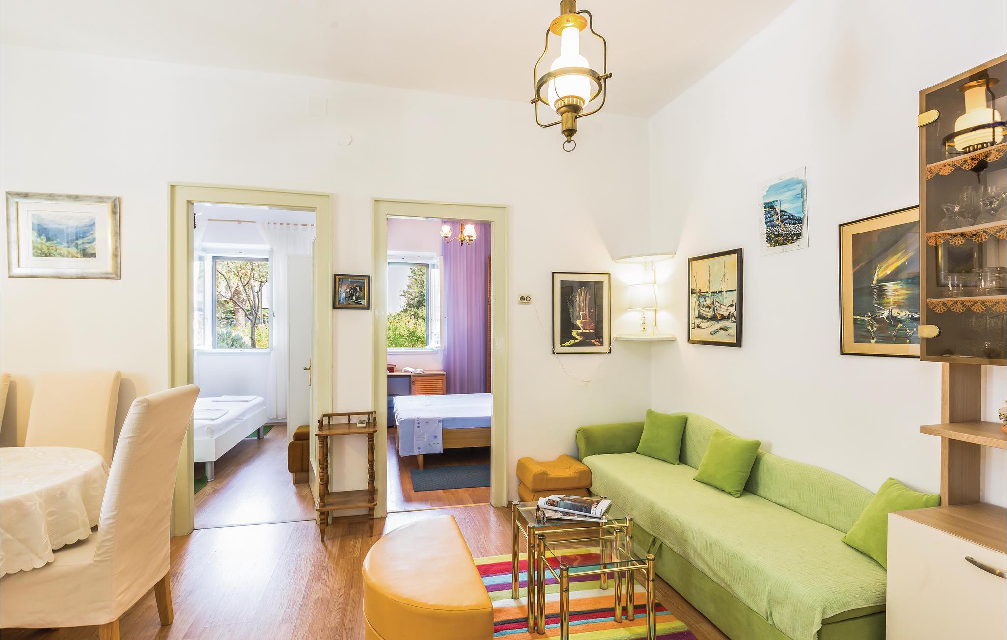Denne pæne og praktisk indrettede lejlighed i stueetagen ligger kun 300 m fra havet, så der er god grund til at få pakket badetøjet med i kufferten.