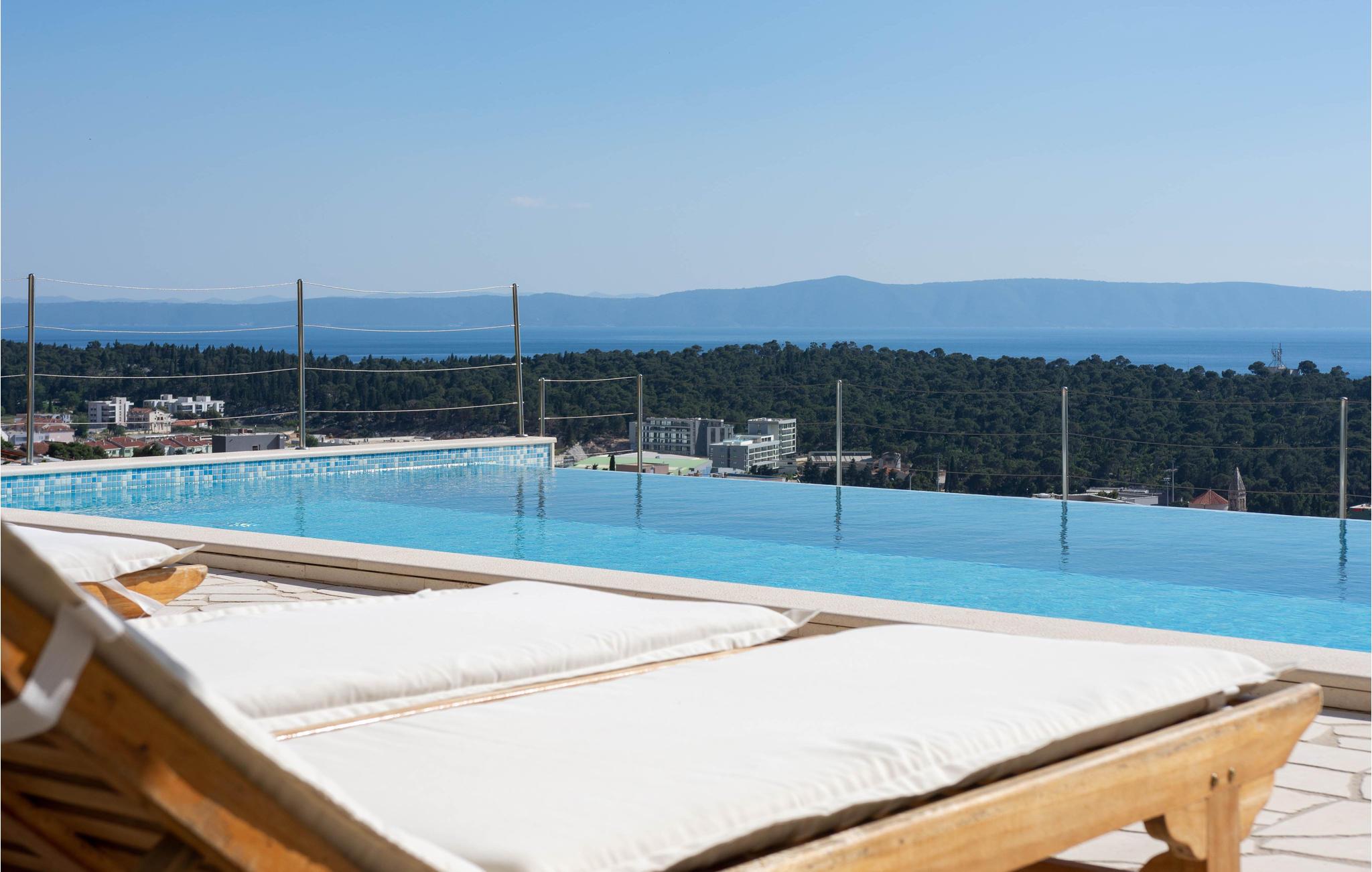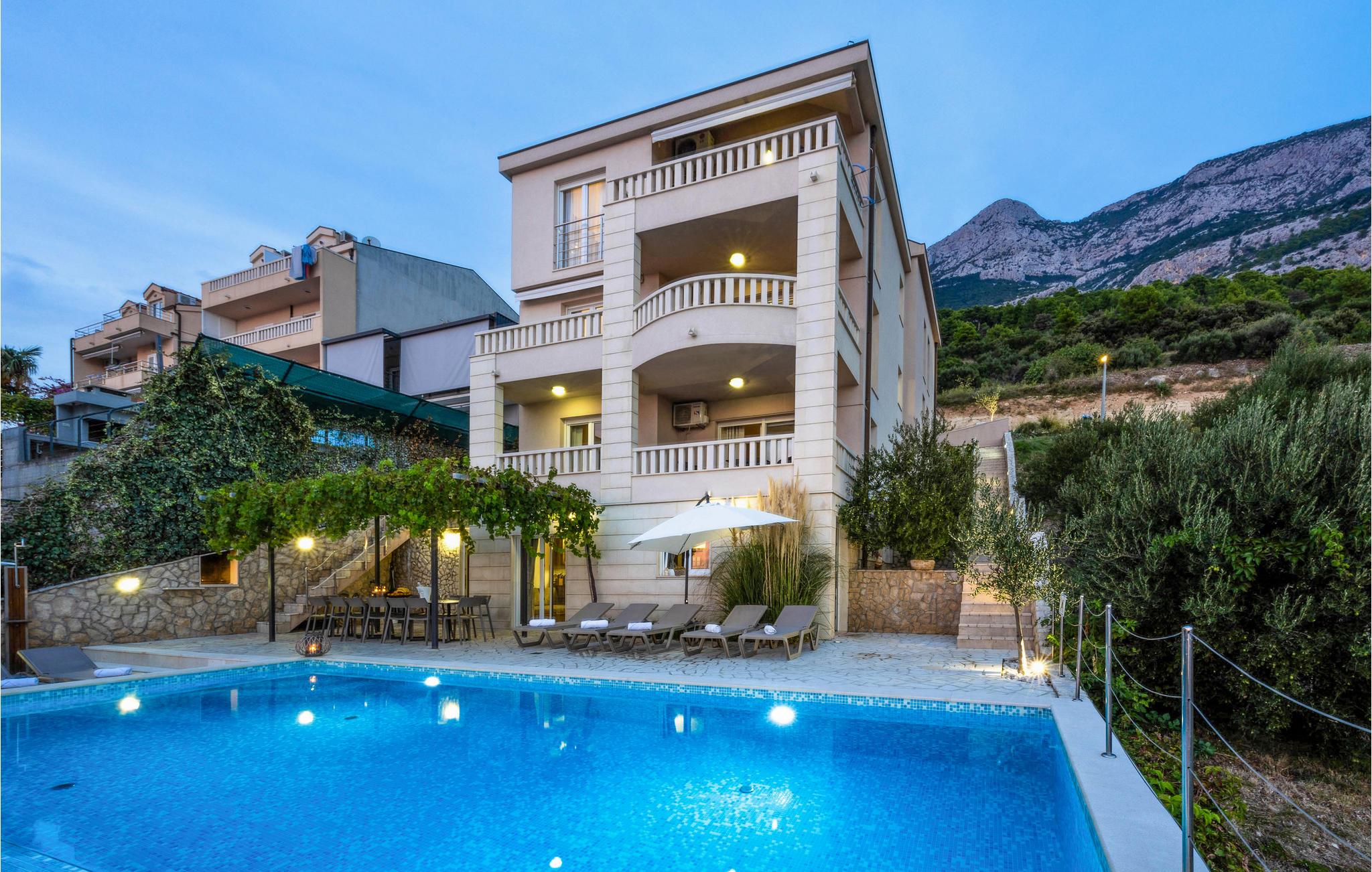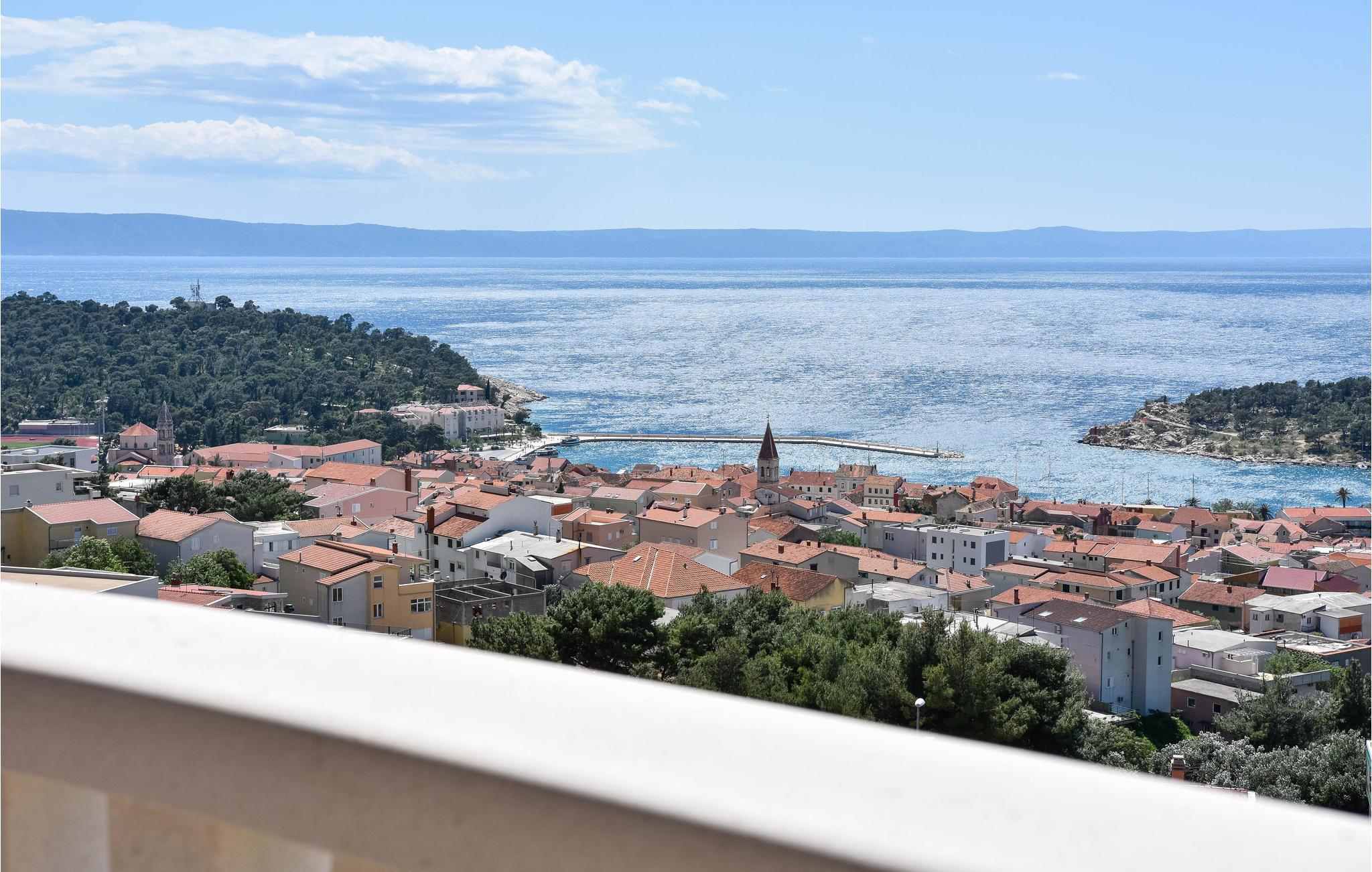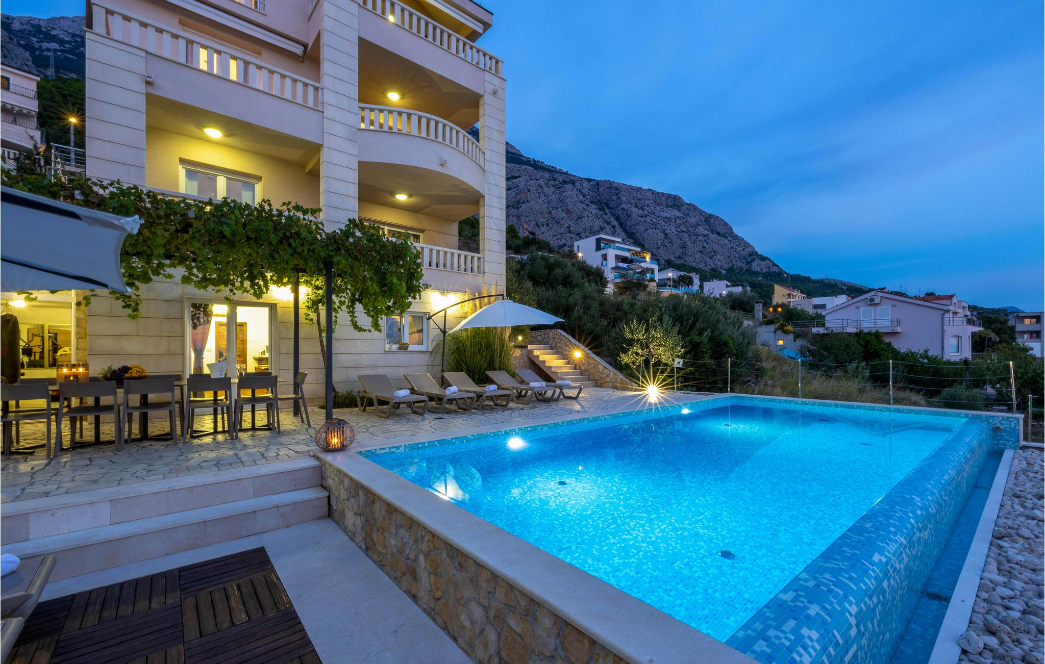 I denne fantastiske ferieby venter der jer en vidunderlig udsigt fra dette dobbelthus til Biokovo-Bjergmassivet samt over havet. Huset er så stort og rummeligt, at her sagtens er plads til to familier. Fra den store poolterrasse og swimmingpoolen, som I har helt for jer selv, kan I nemt komme til stueetagens konoba med en velassorteret vinreol. Her er der plads nok til jer alle, og her kan I lave herlige lækkerier på grillen og nyde dem, måske med et glas lokal vin til. I stueetagen findes et soveværelse. Hvis I gerne vil holde formen ved lige, mens I er på ferie, kan I benytte det skønne fitnessrum på 1. sal. De resterende soveværelser finder I ligeledes på 1. sal, som I kommer til ad en udendørs trappe. Fra terrassen har I en vidunderlig udsigt, som I med garanti vil nyde. Tagetagen er ikke tilgængelig! Feriehuset ligger i et roligt område på en bakke og byder på en vidunderlig panoramaudsigt til Makarska og havet. Besøg byens centrum, der byder på mange arrangementer og masser af underholdning for alle aldre. Gå en tur på strandpromenaden, der bugner af hyggelige caféer, restauranter og souvenierbutikker. Prøv de lokale specialiteter som grillet fisk og kød samt de skønne vine fra denne region. Det kan også anbefales at tage på en dagstur med båd til øerne Brac og Hvar, der begge har masser af kulturelle tilbud samt helt utroligt smukke strande. For aktive feriegæster er der mange muligheder - prøv kræfter med cykling, vandreture, tennis, basketball, fodbold, surfing m.m. Opdag også de små steder med skønne, lange kiselstrande - Tucepi, Brela og Baska Voda. Den venlige husejer bor i nabohuset.