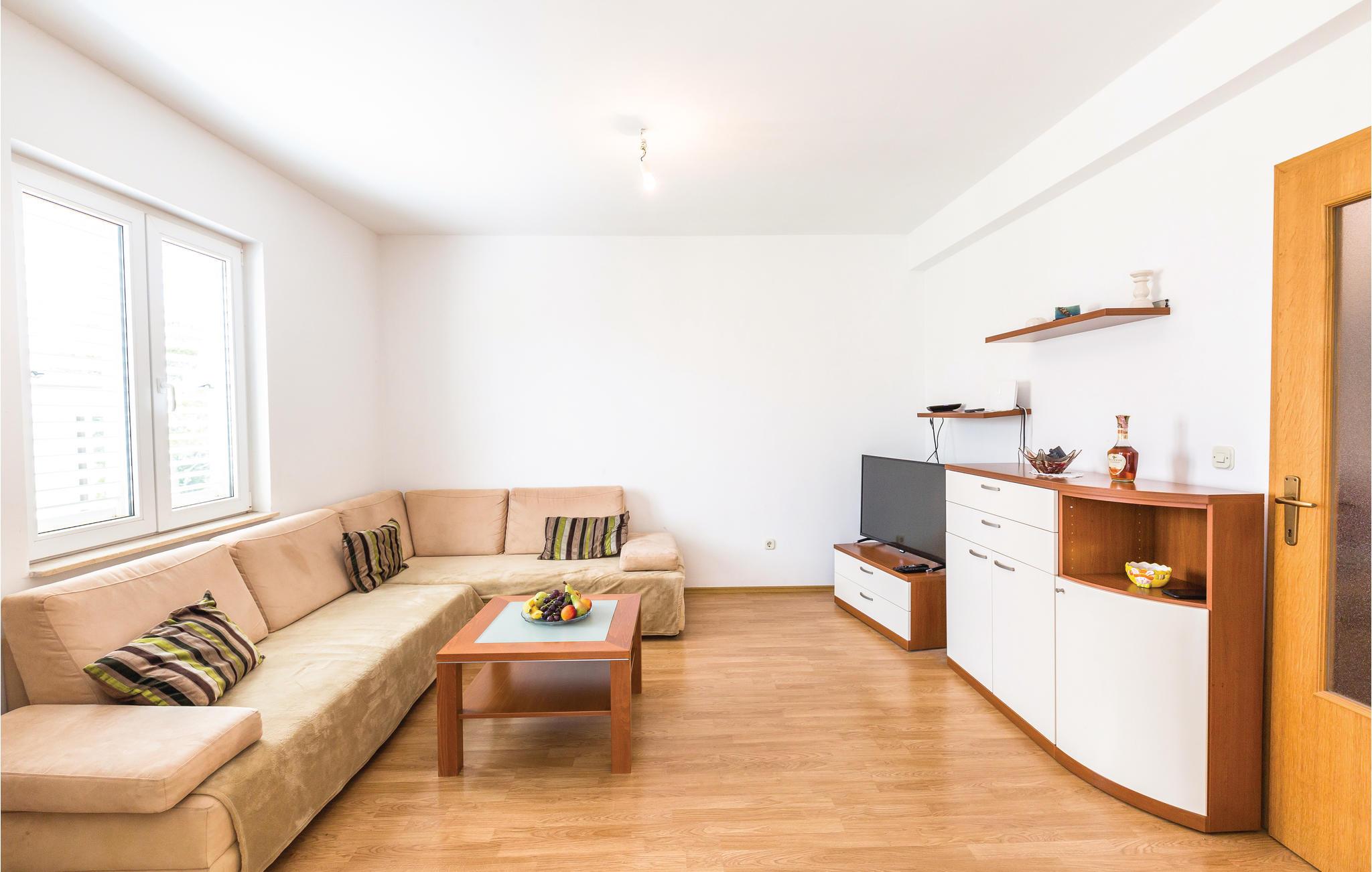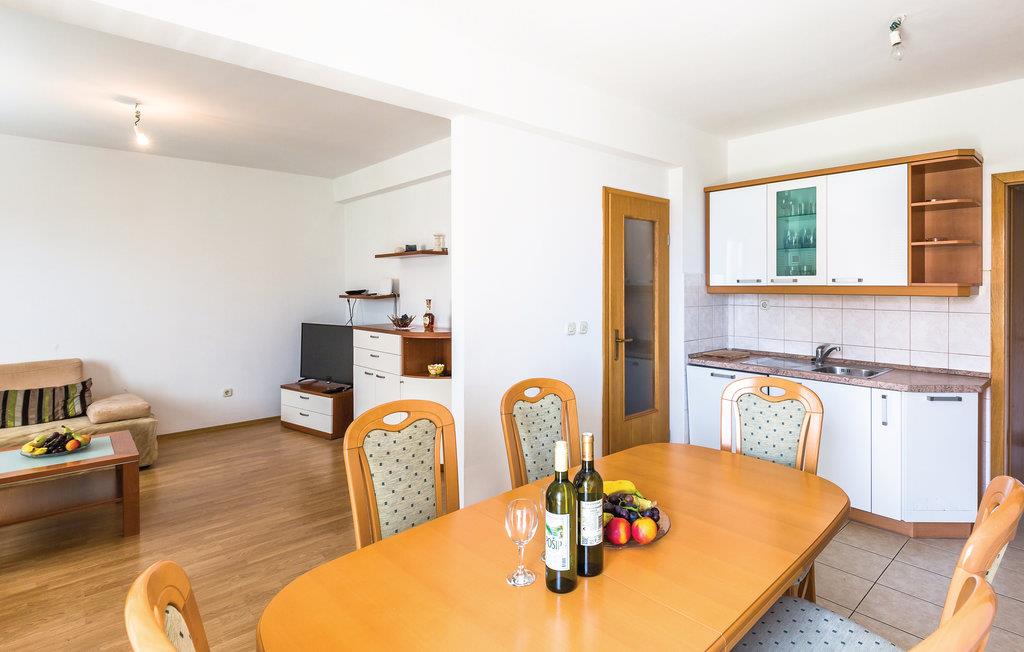 Denne to-etagers, komfortabelt møblerede lejlighed ligger i en boligbygning på en bakke i rolige omgivelser i det populære feriemål Makarska.