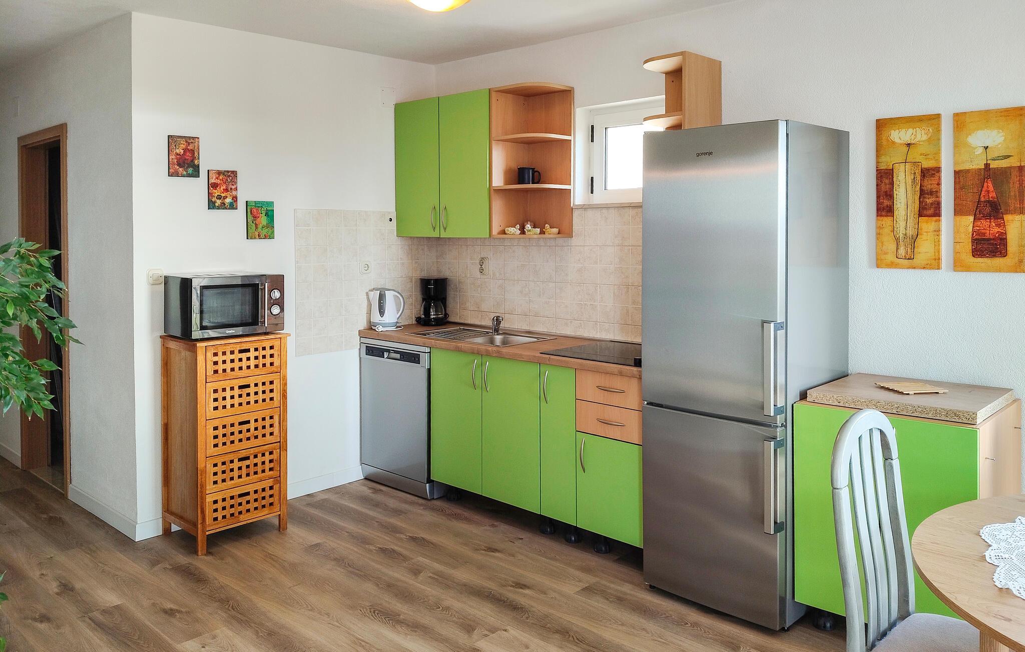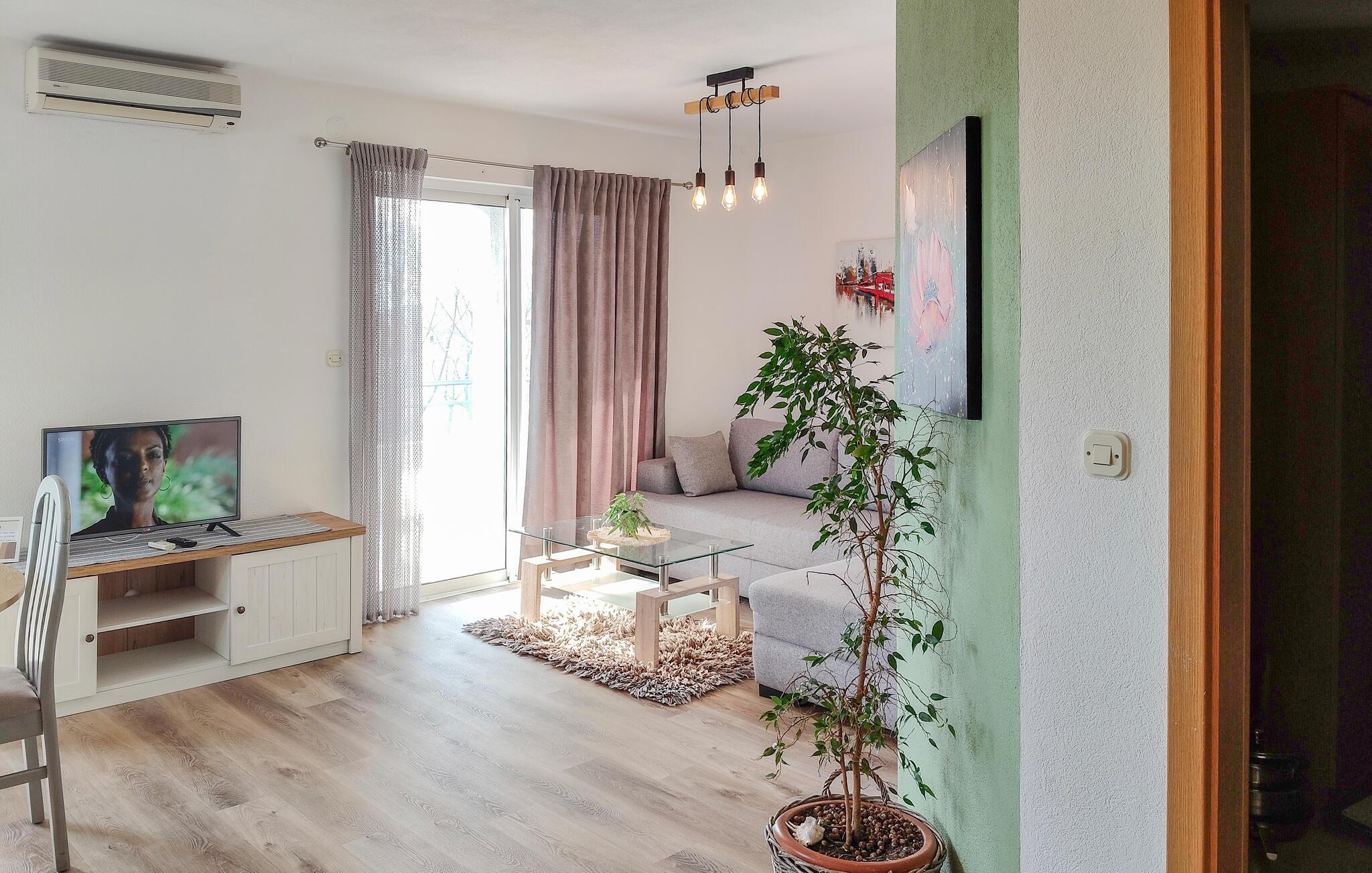 Funktionelt indrettet ferielejlighed på første sal i en lille ejendom. Fra den overdækkede altan er der panoramaudsigt over havet og øerne Brac og Hvar. Der er blot ca. 400 m til en dejlig kiesstrand på ca. 2 km, hvor familien kan tilbringe de dejlige feriedage fra solopgang til solnedgang. Ikke langt fra Makarskas livlige centrum hvor der er meget at se og opleve samt mange restauranter med fisk- og skaldyrsspecialiteter.