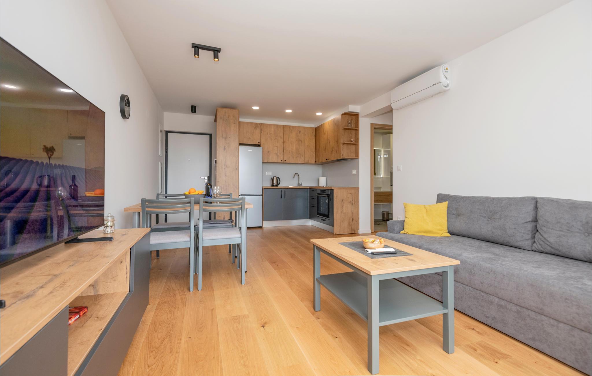Glæd dig til denne smukke og moderne lejlighed med havudsigt. Nyd med din elskede eller lille familie til Makarska og tilbring en afslappende ferie i denne komfortable lejlighed i et lejlighedshus. I et kompakt rum kan I nyde de moderne møbler i træ og enkle farver, lege sammen, lave mad eller se en film om aftenen. Om morgenen kan du nyde en solid morgenmad på balkonen, hvorfra du har en smuk udsigt over havet. Oplev den idylliske kystby med rødder i antikken ved foden af Biokovo-bjergene. Makarska inviterer dig til at slentre gennem gaderne og besøge seværdigheder såsom den barokke kirke St. Phillip Neri, klostrene og den historiske bykerne. Ligeledes er havet og de populære stenstrande inden for nem gåafstand. Svøm i det krystalklare hav og oplev de vandsportsaktiviteter, der tilbydes langs kysten!