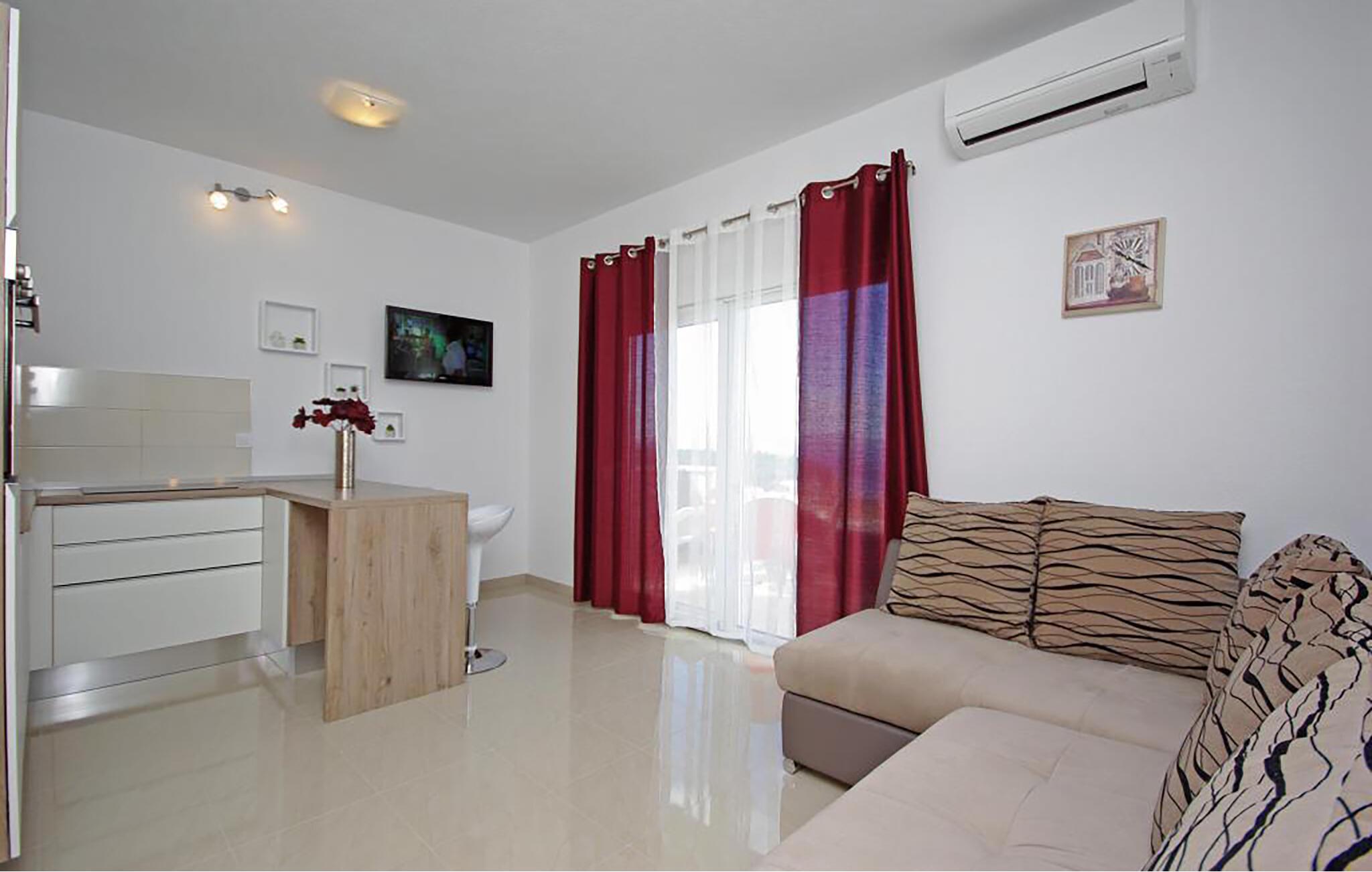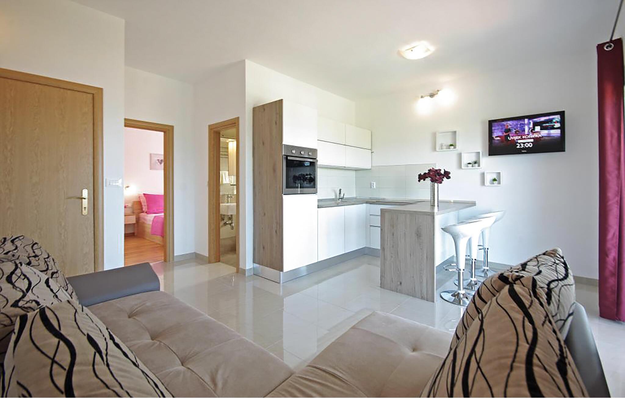 Denne lyse og komfortable lejlighed ligger kun en kort gåtur fra stranden og har en lys og luftig atmosfære. Tilbered jeres yndlingsmåltider, nyd dem med havudsigt, og efter en lang dag kan I slappe af på sofaen for at streame en film eller slappe af med en god bog.
