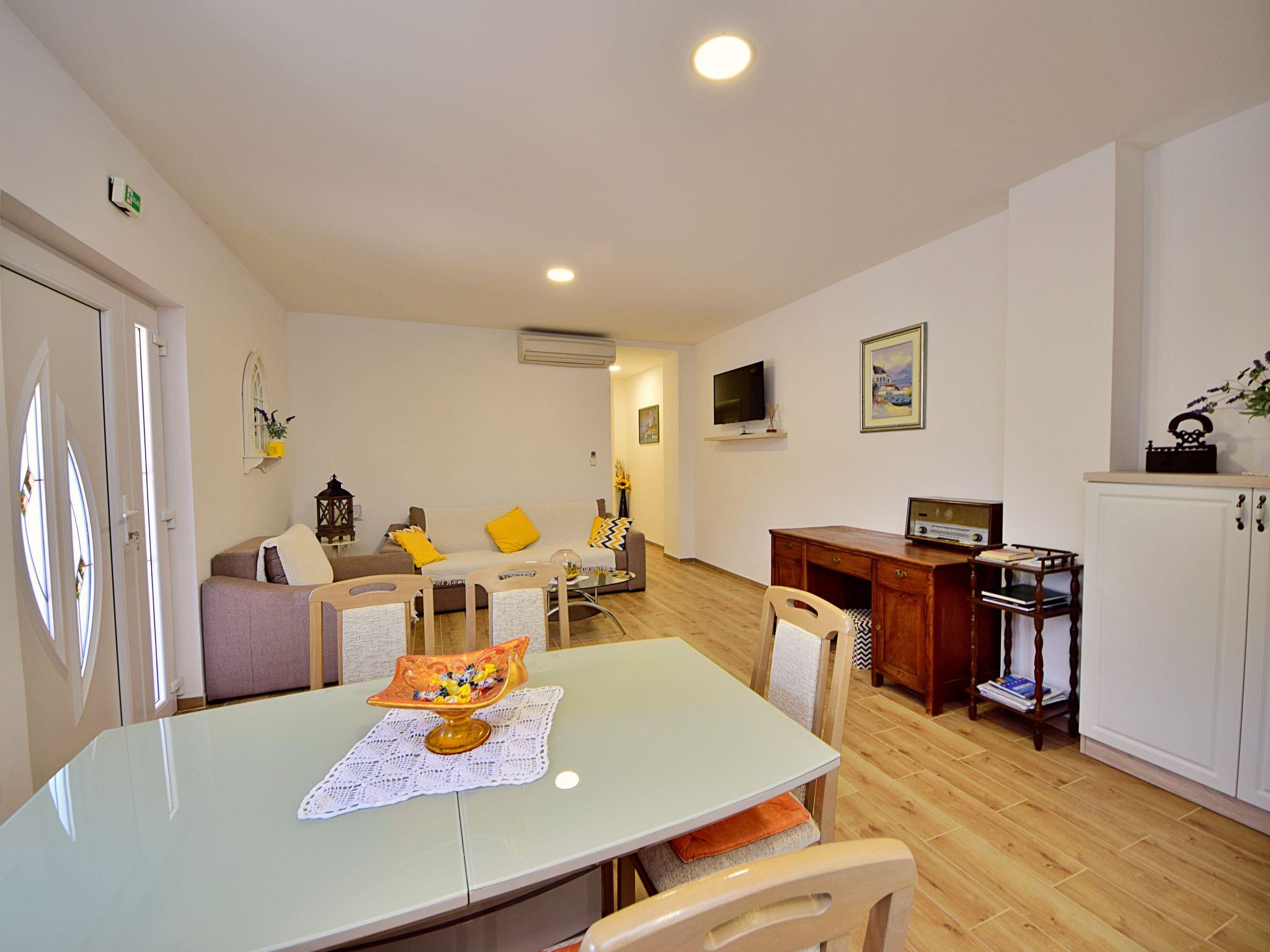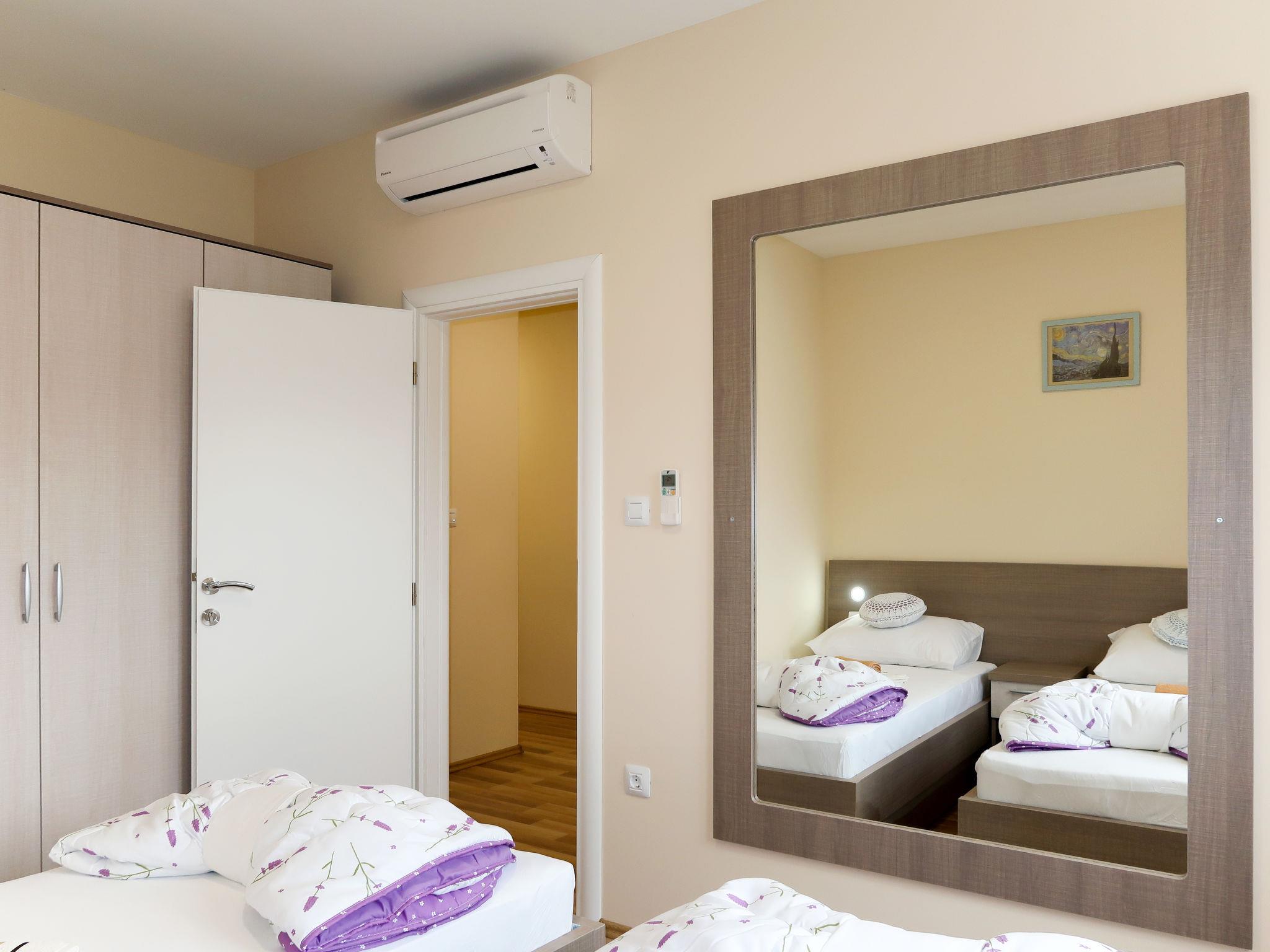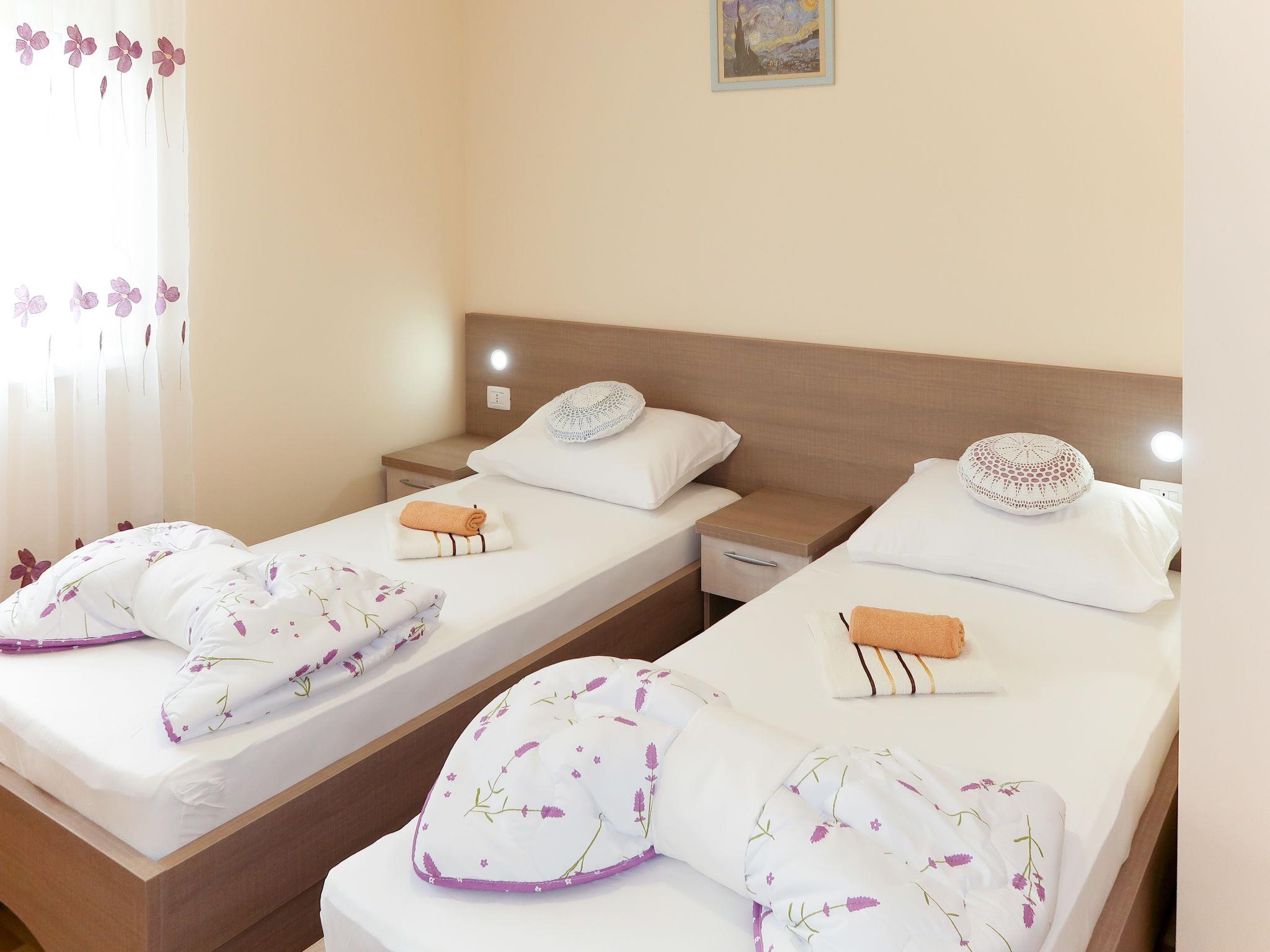 "Baba Nevenka", 4-room apartment 76 m2, on the ground floor. Living/dining room with 1 double sofabed (160 cm, length 200 cm), satellite TV and air conditioning. 2 rooms, each room with 1 french bed (160 cm, length 200 cm), air conditioning. 1 room with 2 beds and air conditioning. Open kitchen (oven, dishwasher, 4 ceramic glass hob hotplates, toaster, kettle, microwave, freezer, electric coffee machine). 2 showers/WC, sep. WC. No heating option. Facilities: washing machine, children's high chair, baby cot. Internet (WiFi, free). Please note: private entrance.