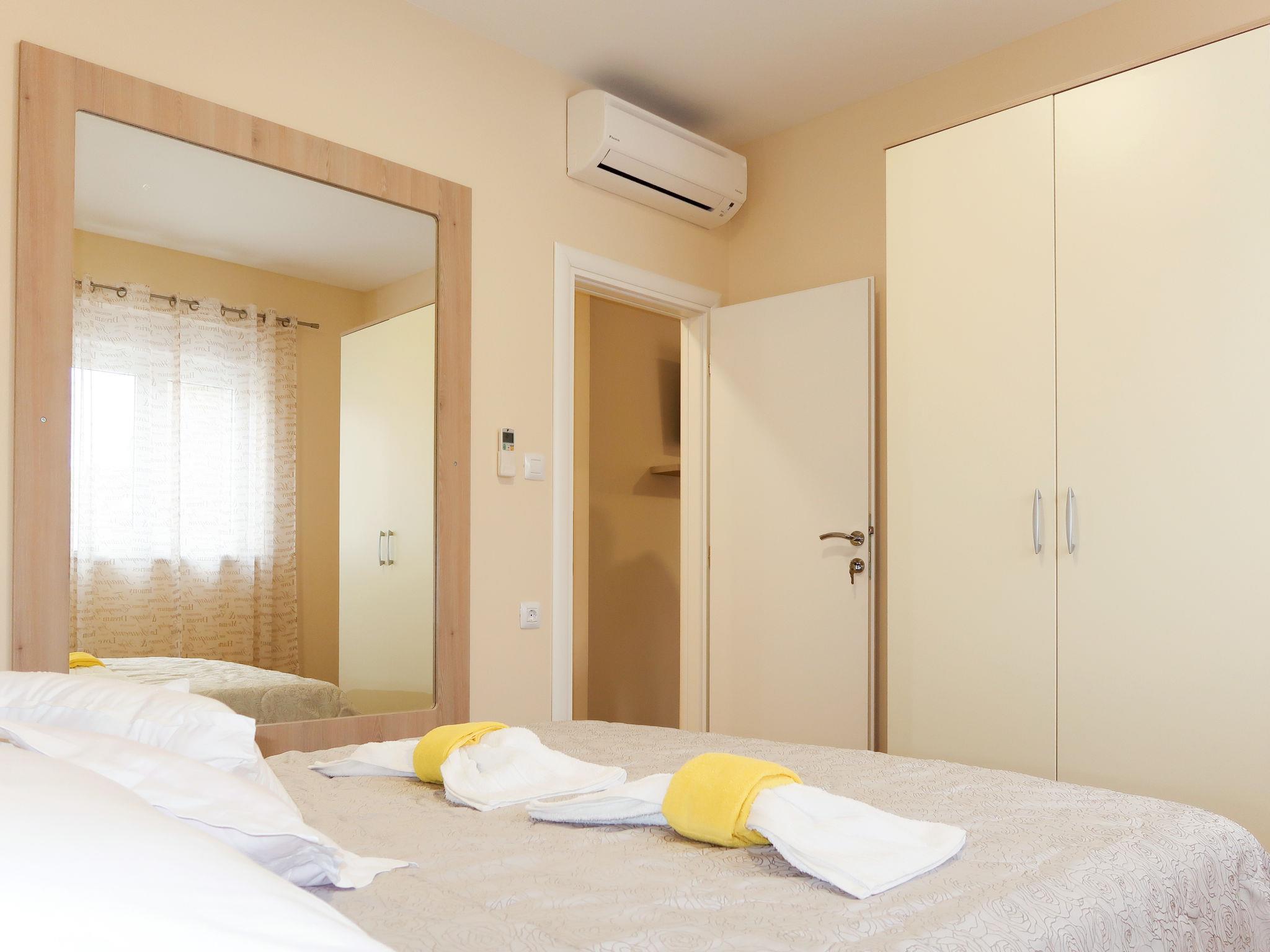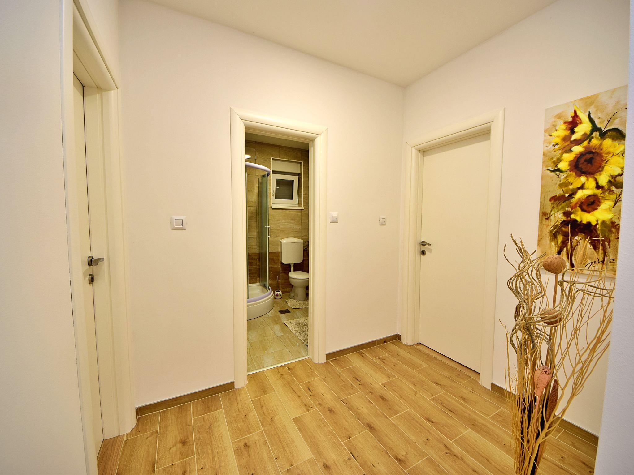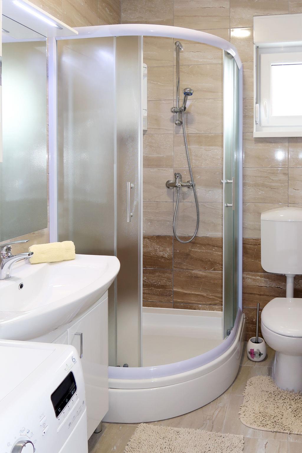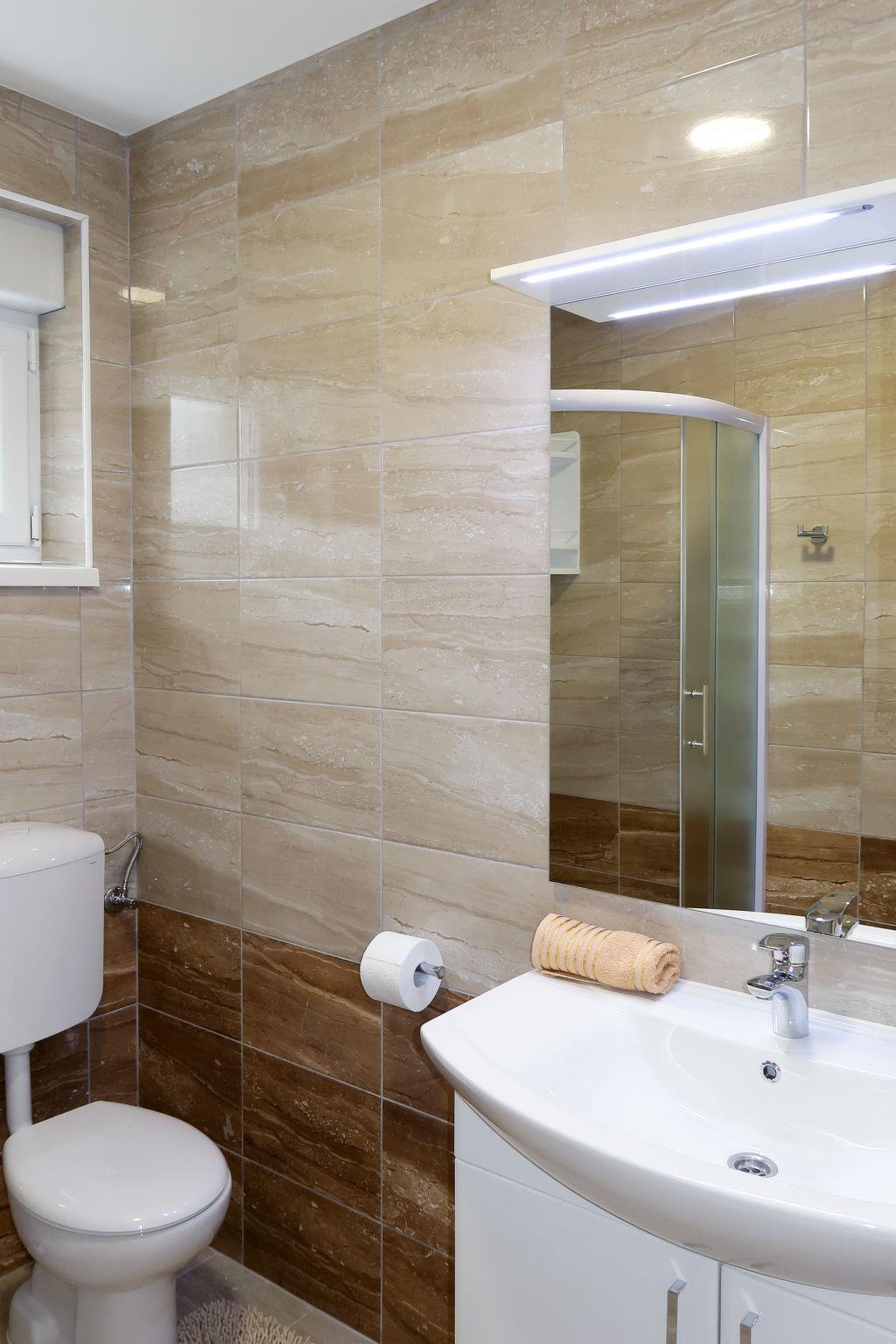 "Baba Nevenka", 4-room apartment 76 m2, on the ground floor. Living/dining room with 1 double sofabed (160 cm, length 200 cm), satellite TV and air conditioning. 2 rooms, each room with 1 french bed (160 cm, length 200 cm), air conditioning. 1 room with 2 beds and air conditioning. Open kitchen (oven, dishwasher, 4 ceramic glass hob hotplates, toaster, kettle, microwave, freezer, electric coffee machine). 2 showers/WC, sep. WC. No heating option. Facilities: washing machine, children's high chair, baby cot. Internet (WiFi, free). Please note: private entrance.