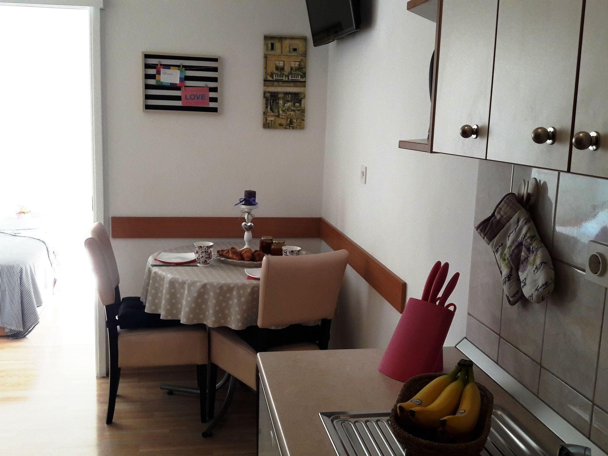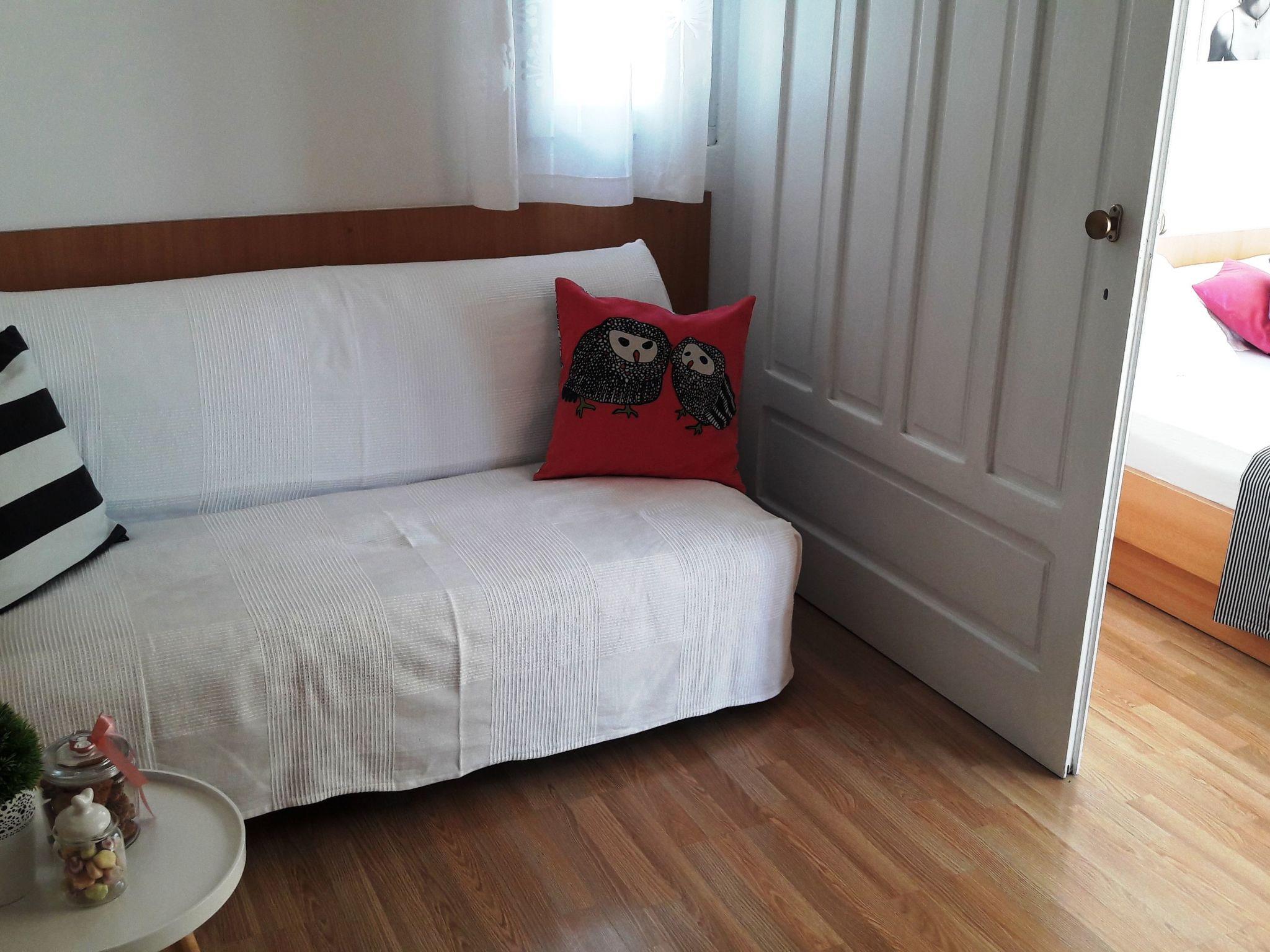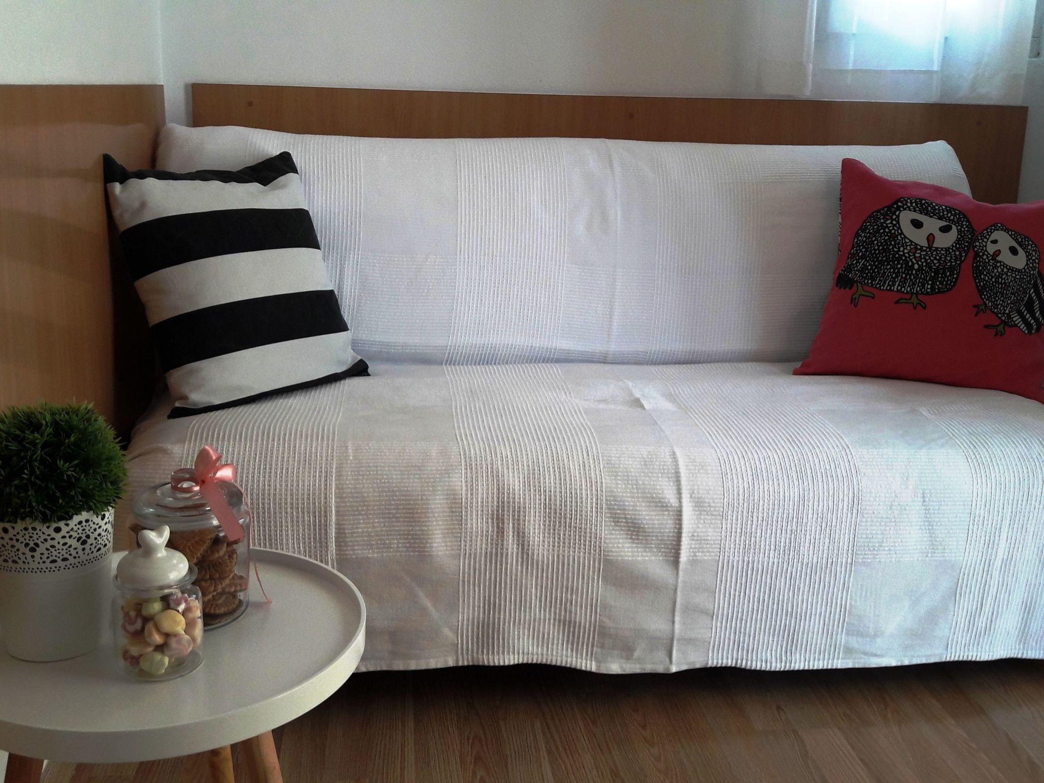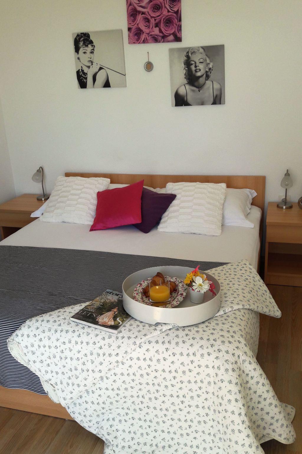 The holiday apartment on the top floor of a three-storey apartment building consists of an open living and dining room with an integrated, fully-equipped kitchen, a bedroom and a daylight bathroom. The air-conditioned (cool/warm) living room provides a comfortable sofa, a wall-mounted TV with satellite channels, and a dining table with chairs. The kitchen next to it is equipped with a two-zone electric hob, a fridge with a freezer compartment, a kettle, a toaster and plenty of crockery and cutlery. The bedroom is furnished with a double bed (160 x 200cm). The sofa in the living room can also be converted into an additional double bed. The bathroom has a bath with a shower attachment, a washbasin with a wall mirror, a hairdryer and a toilet. Plenty of bed linen and towels are provided and wireless Internet access is included in the rental price.