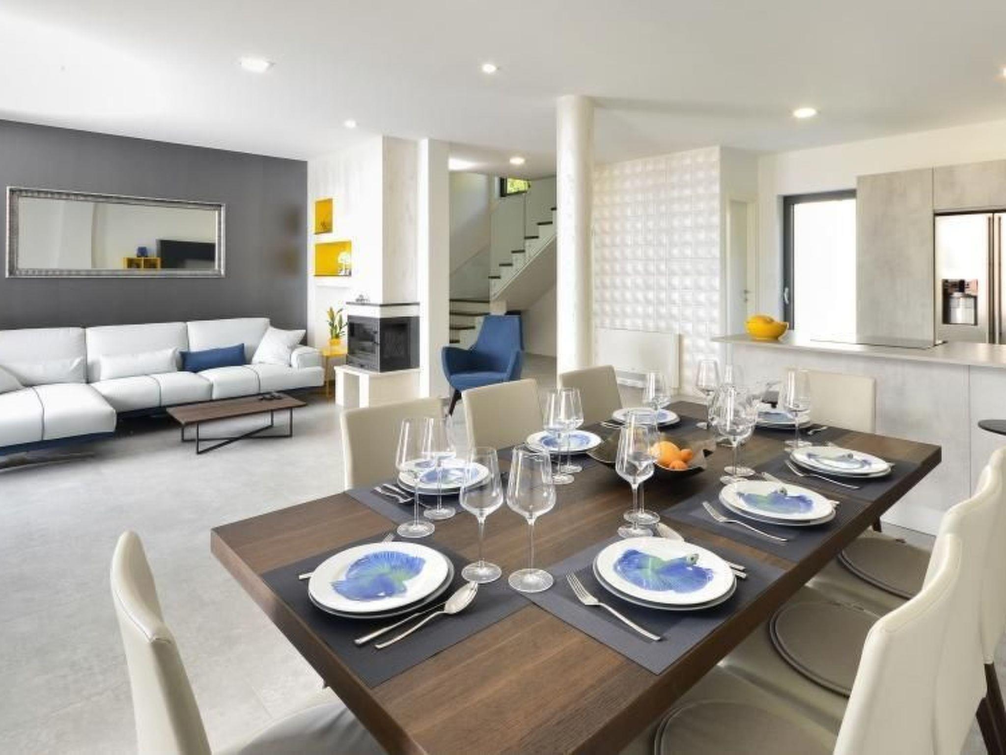 The luxurious villa is spread over several floors and can accommodate eight people comfortably. The main floor is a spacious and open-plan living space. The living and dining room provides a sofa suite, satellite TV and a big wooden dining table with eight chairs. The modern kitchen is fully-equipped with a stove, an oven, a big fridge-freezer with an ice dispenser, a microwave, kettle, toaster, coffee machine and dishwasher. This floor has two outdoor areas. There is also a separate toilet. The first floor comprises three bedrooms, two with a balcony with a view of the Adriatic and one with a view of the majestic Biokovo mountain, and each with an en-suite bathroom. Each bedroom is furnished with a queen-size double bed. Two have a wall cupboard and one has a wardrobe. The three bathrooms each consist of a luxury glass shower cubicle, a washbasin and a toilet. Internal stairs lead to the top floor, which has an outdoor kitchen, a bathroom with a shower and another room with a sofa bed. Fast wireless Internet access is available. Complete villa is airconditioned.