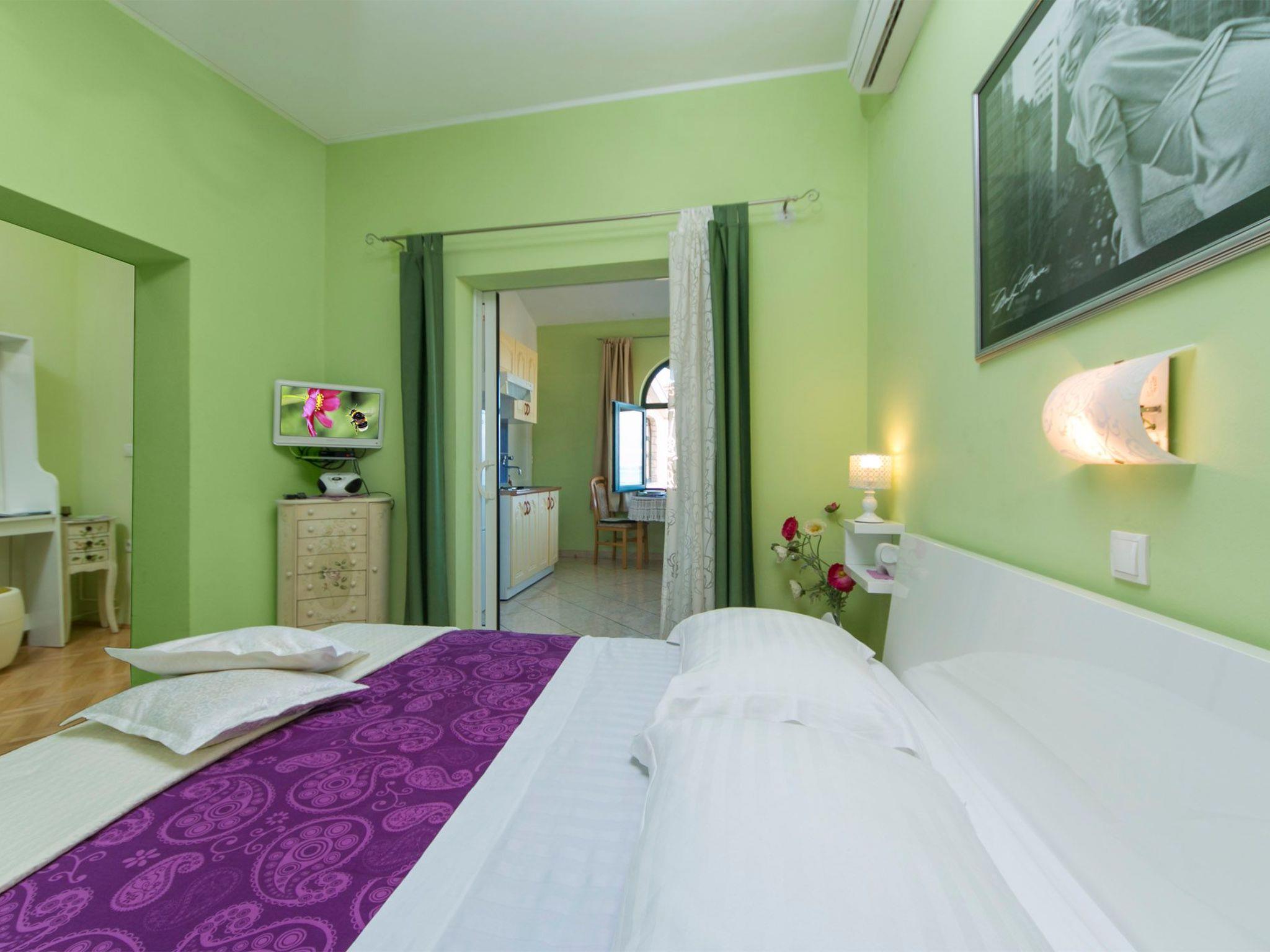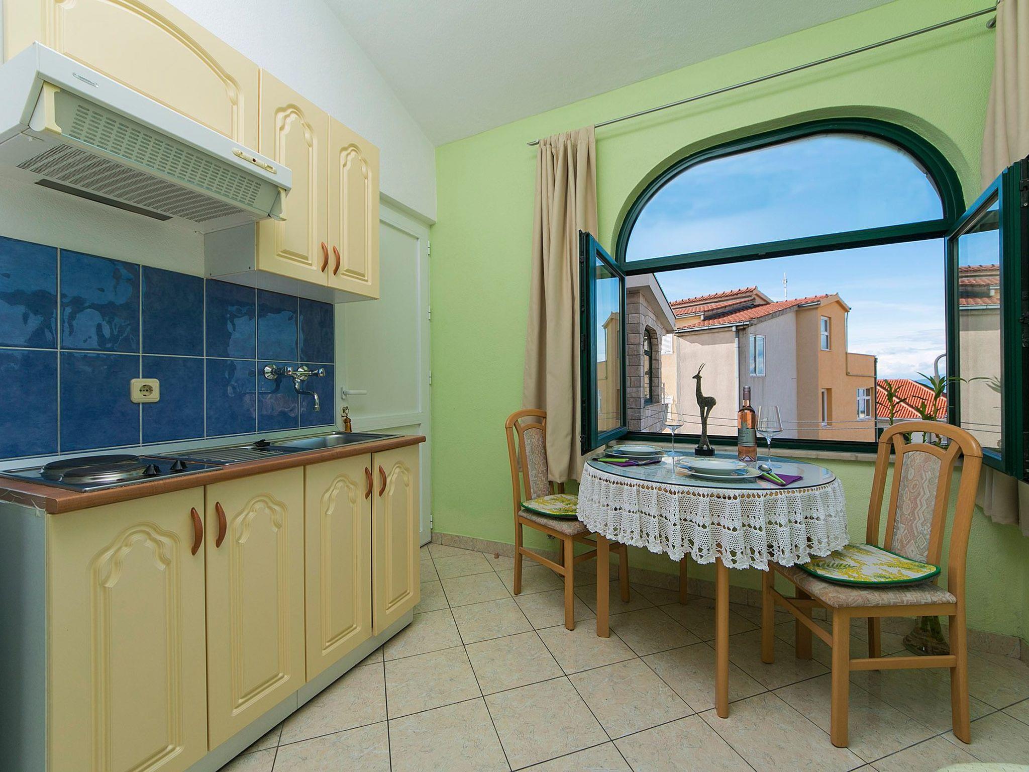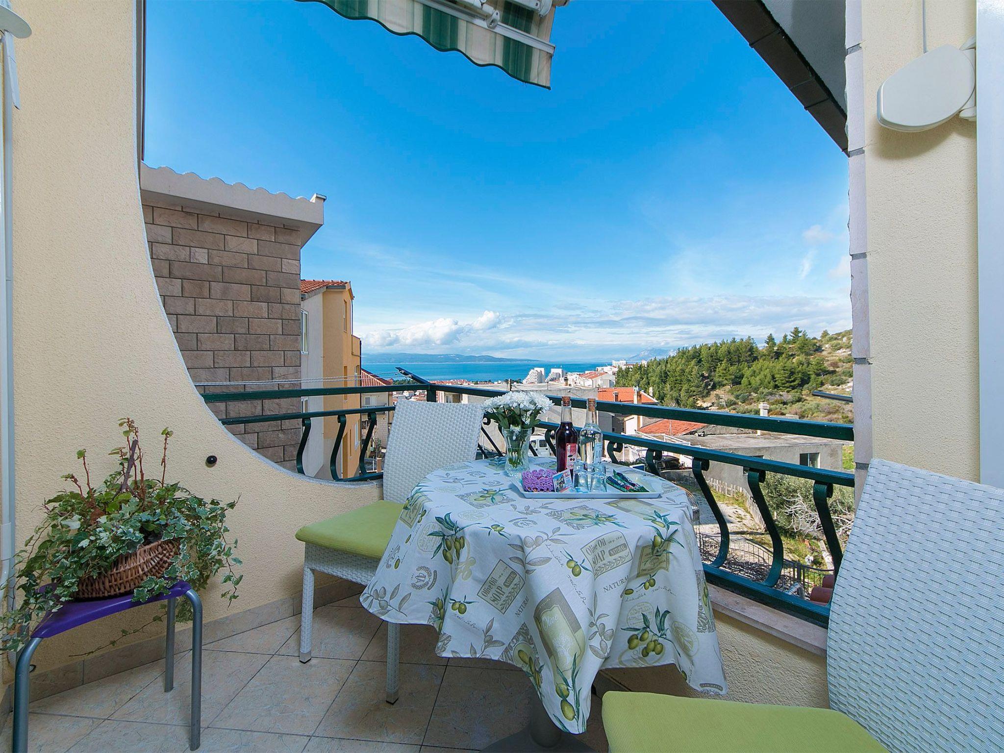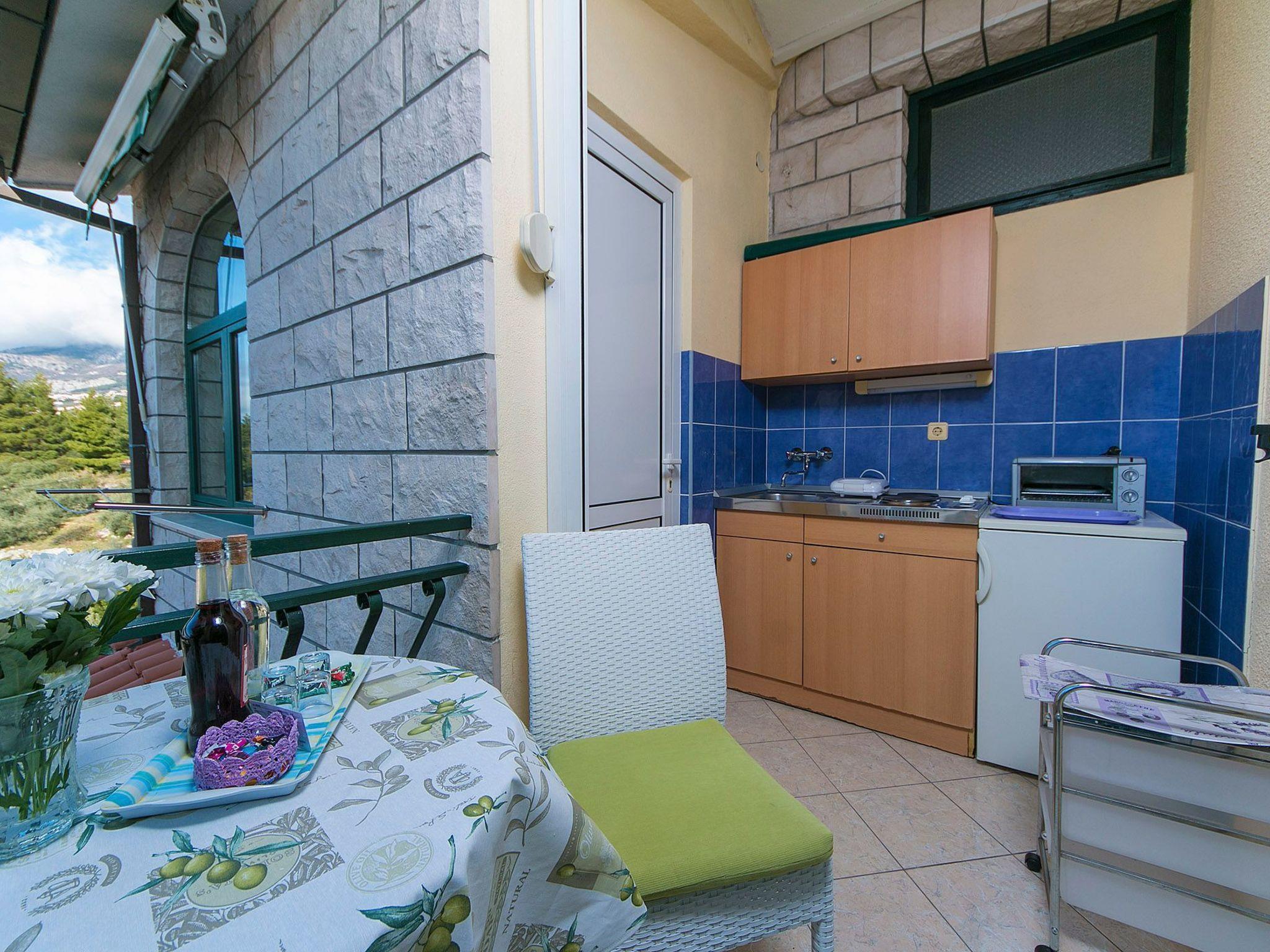 The apartment has a private little balcony with a sea view, furnished with a table and chairs. There is also a little outdoor kitchen with cooking rings, a fridge, sink, coffee machine and kettle. A grill is available for use. There are three parking spaces right by the house and there are also two garage parking spaces in the house.