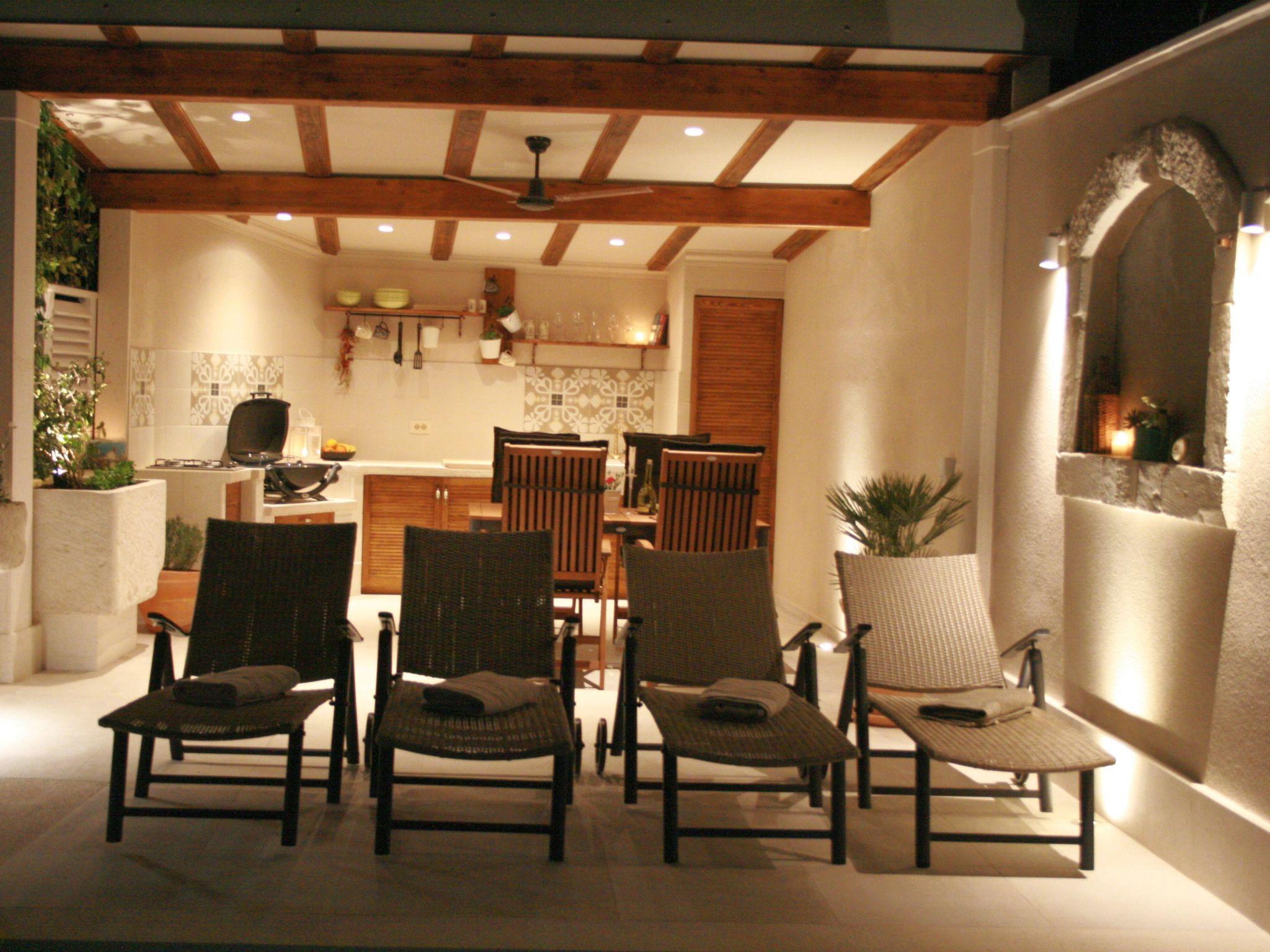 terrace with full completed kitchen (microwave, fridge, gas barbecue, cooker), table with chair, deckchair, cooling fan, shower, pool with massage. Private parking for 1 car and for more public parking.