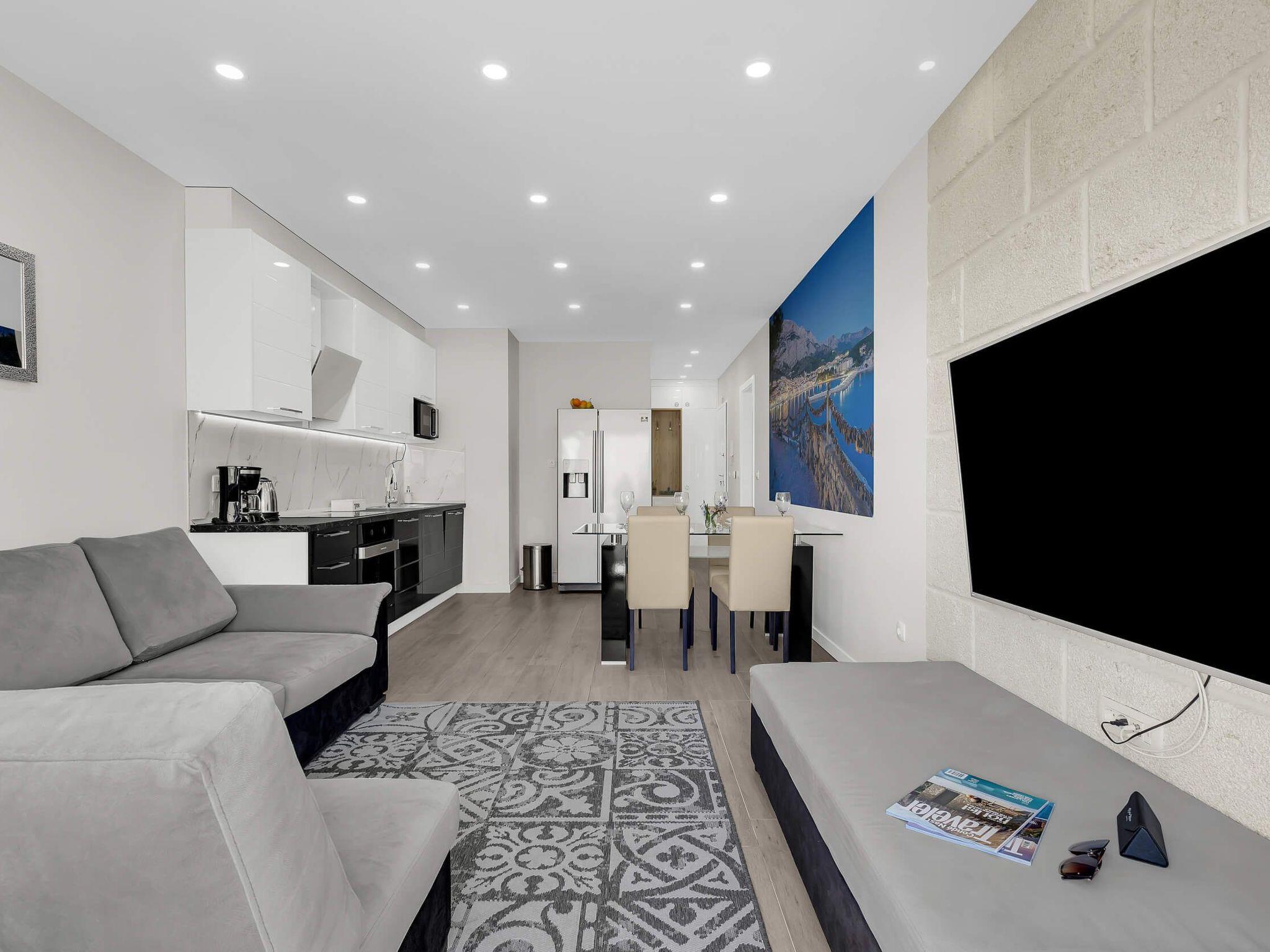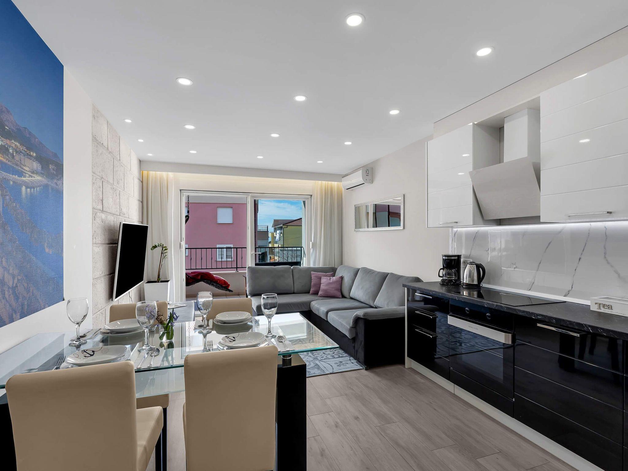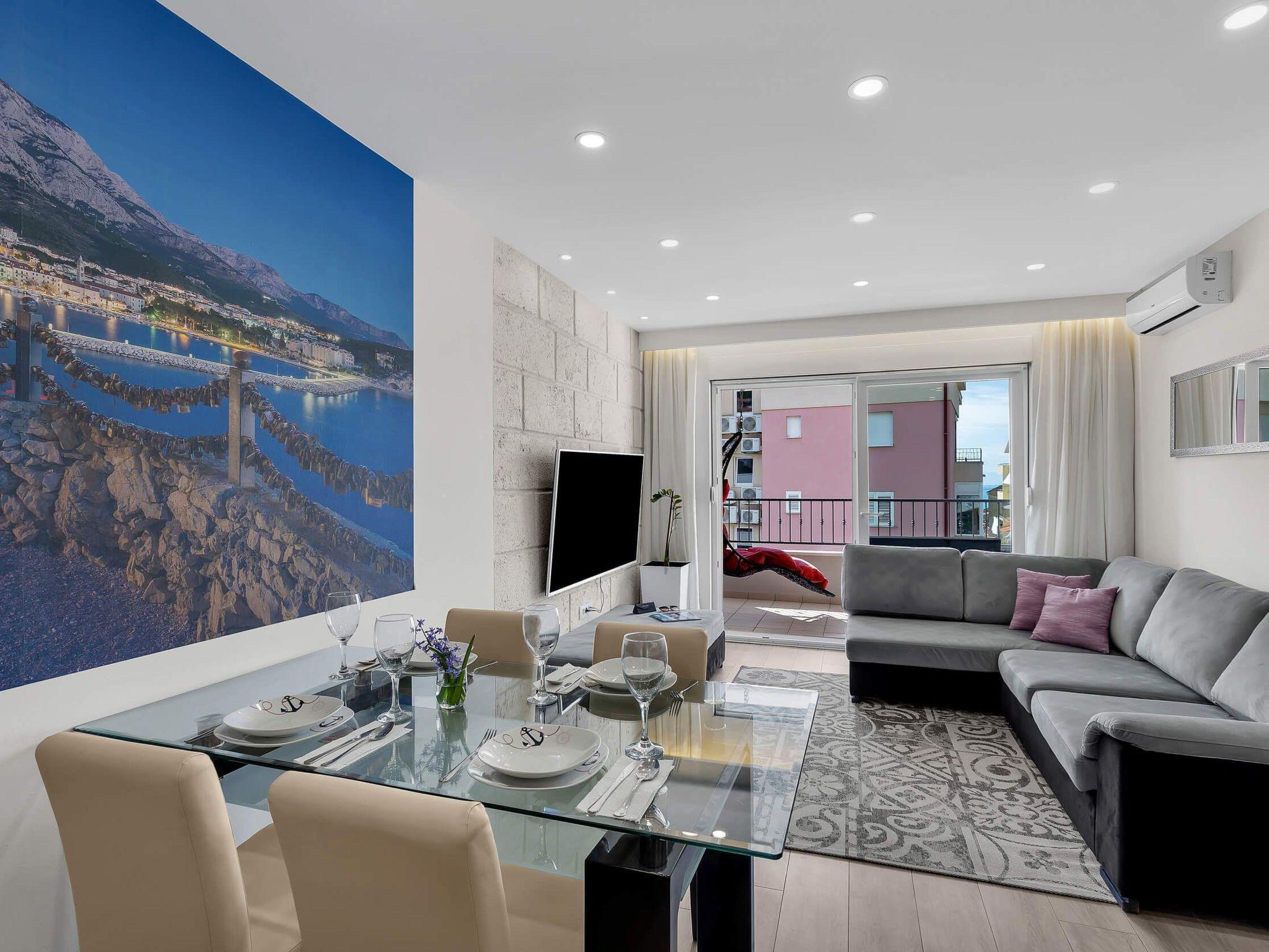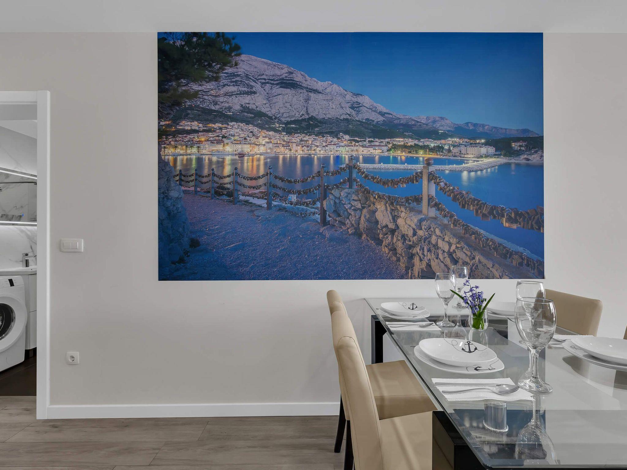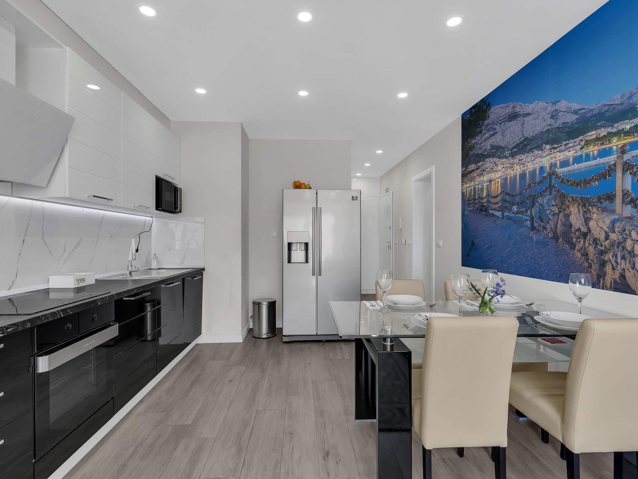 In its modern and sleek kitchen tasteful meals can be prepared. While in this modern apartment don't forget that you are in Makarska, a pearl of Makarska Riviera, or simply remind yourself by looking at amazing panoramic posters. Since the city center is only 300 meters away, get dressed and take a walk along the beautiful Makarska Riva, visit restaurants and shops where You can get a closer feel of his beautiful city.