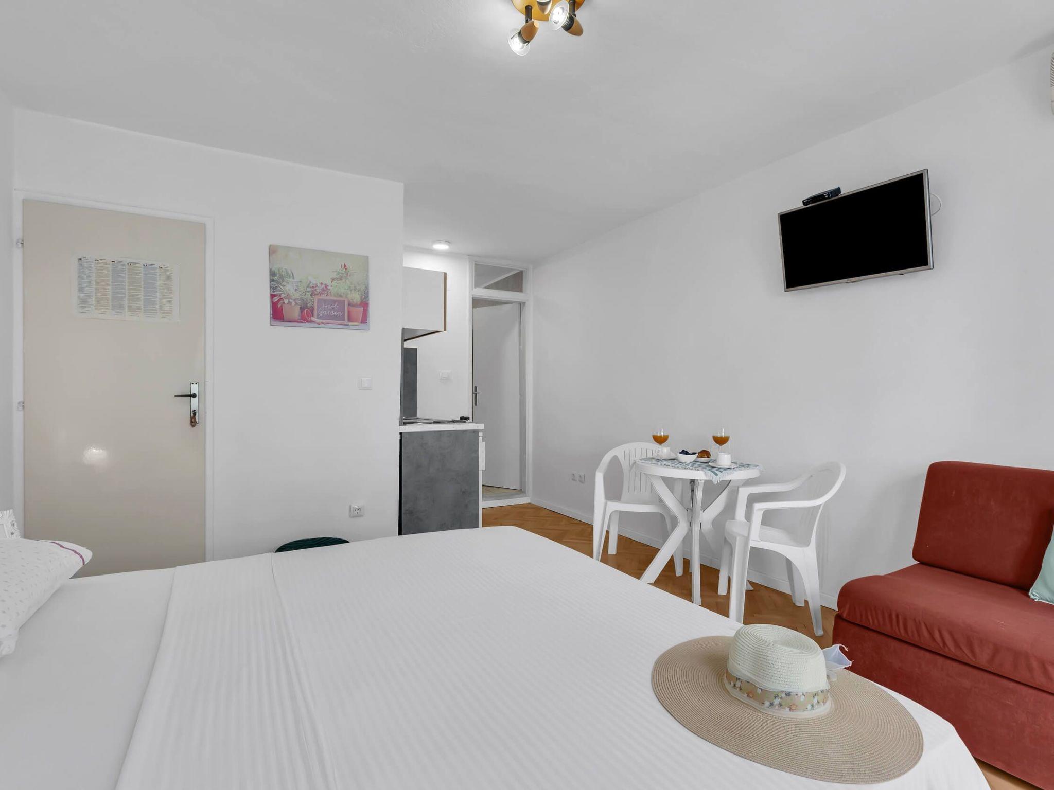 This apartment comes equipped with essential amenities designed for your comfort. It features air conditioning to keep you cool during those warm Mediterranean days and nights. The interior is thoughtfully arranged to include a cozy sleeping area with a sofa bed for one person, ensuring a restful night's sleep for all. Additionally, an electric kettle is available for your convenience, perfect for preparing morning coffee or tea before setting out to explore the stunning surroundings.