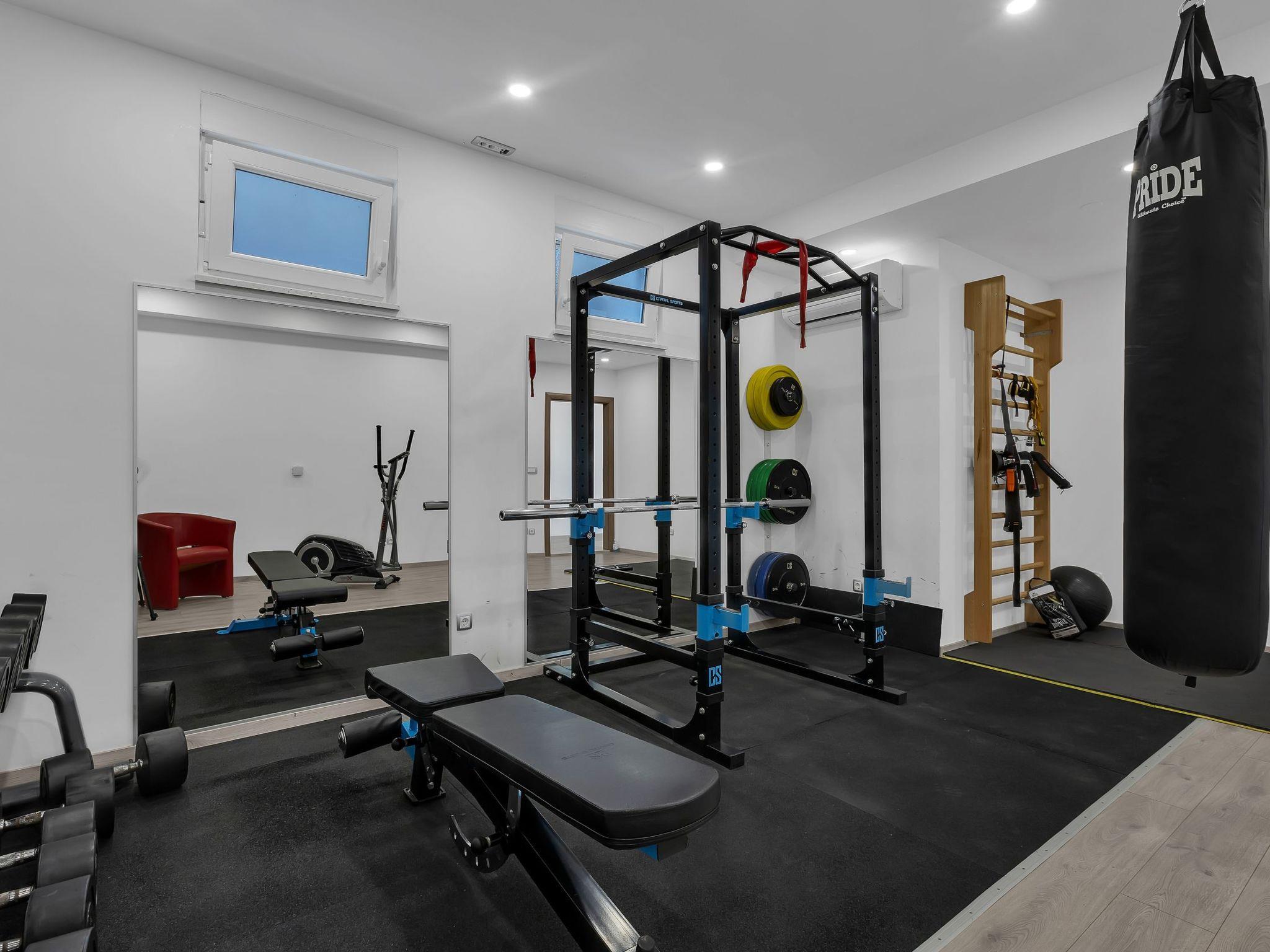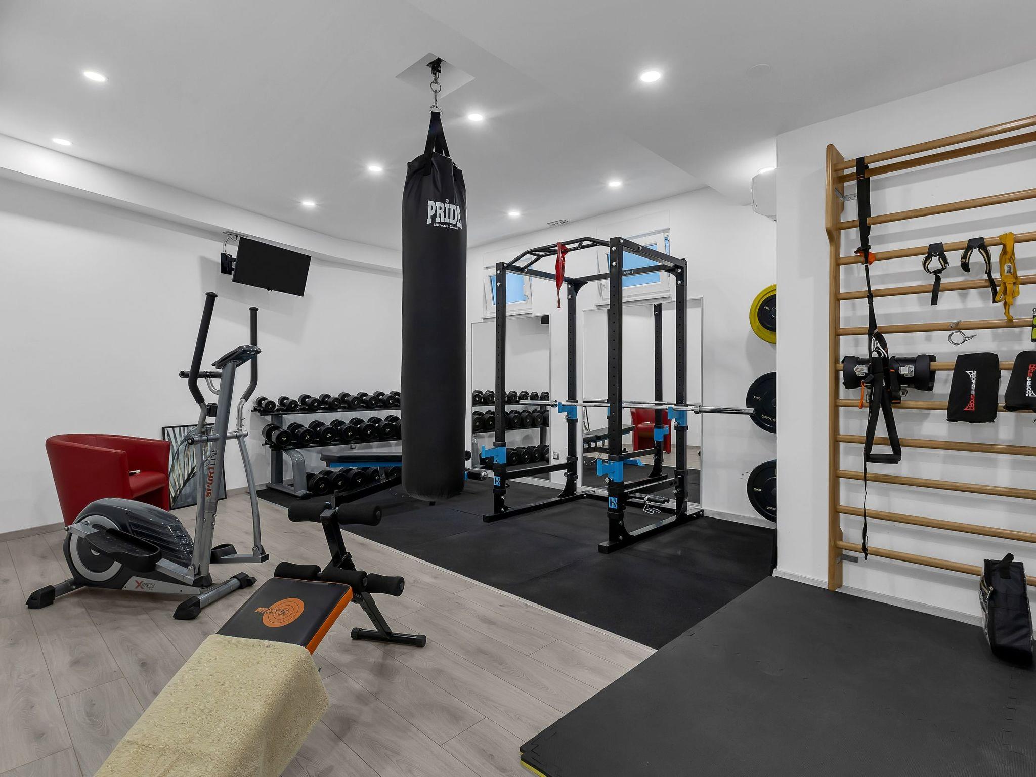 Villa offers a 340 m2 of living space on 4 levels, garden with a huge private, heated swimming pool and barbecue, french garden corner. It is suitable for 6 + 2 people. On the ground floor is the spacious living room with an open-space kitchen and an exit to the terrace with pool and sunbeds and one bedroom with a double sofa bed for 2 people and on same floor is toilet. On the second floor there are 3 double bedrooms, each with its own en-suite bathroom and balcony.All rooms have TV / SAT, air conditioning. In the basement is a huge professional gym, and there is a 56 m2 outdoor sports court suitable for football, basketball, volleyball & etc.