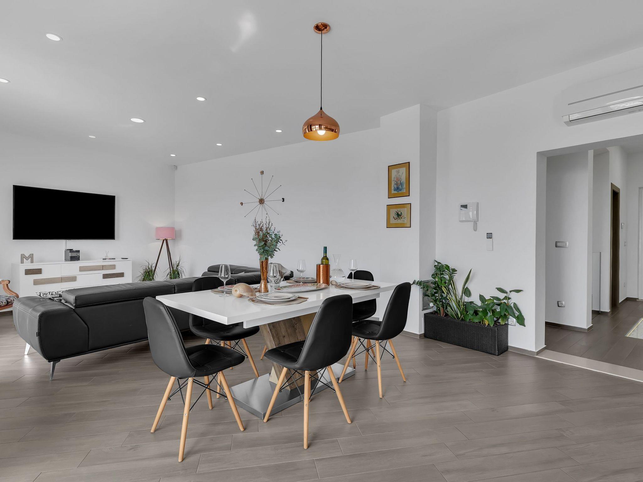This spacious villa is fully air-conditioned and fully equipped with all amenities including washing machine, dishwasher, coffee machine, toaster, TV/SAT, WI-FI, garage, baby facilities, tennis table. House is decorated with original art paintings of prominent Croatian painters.
