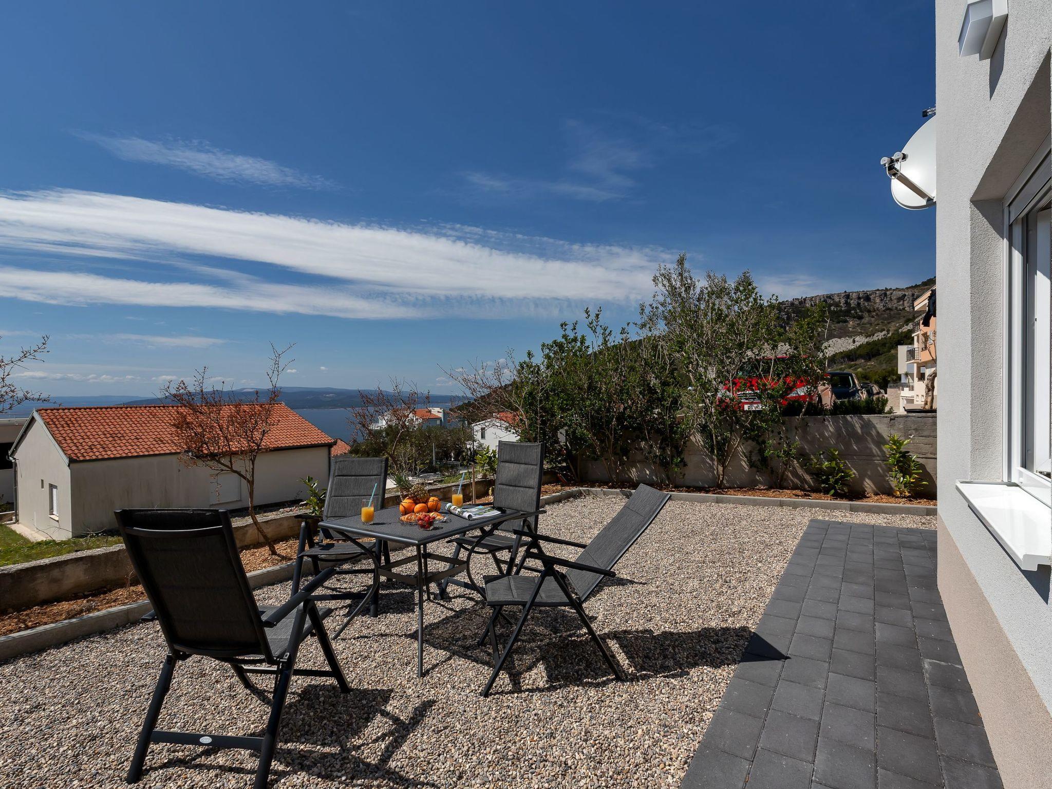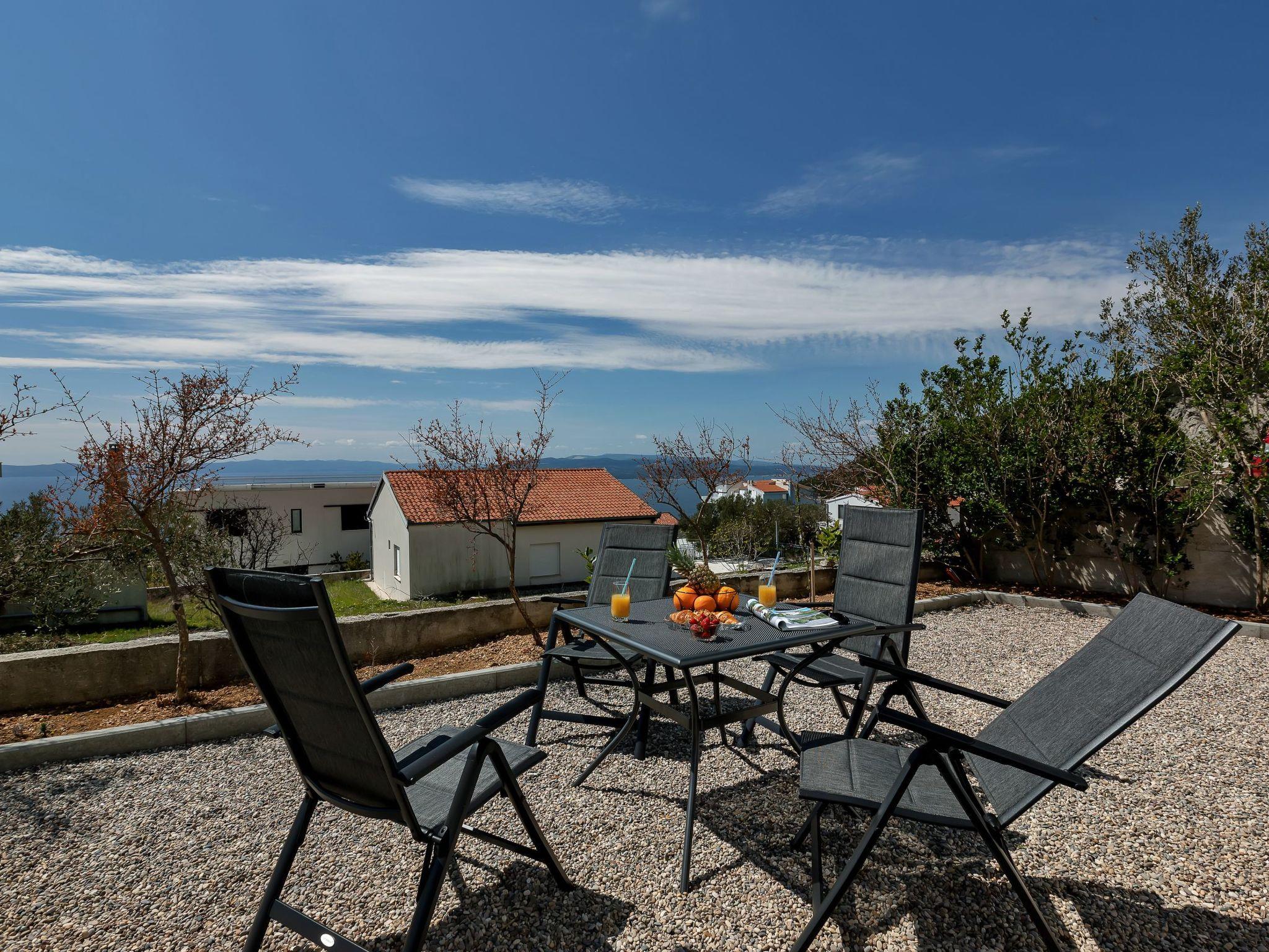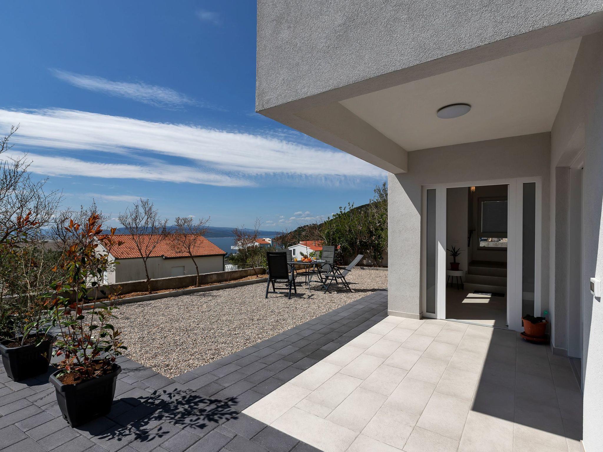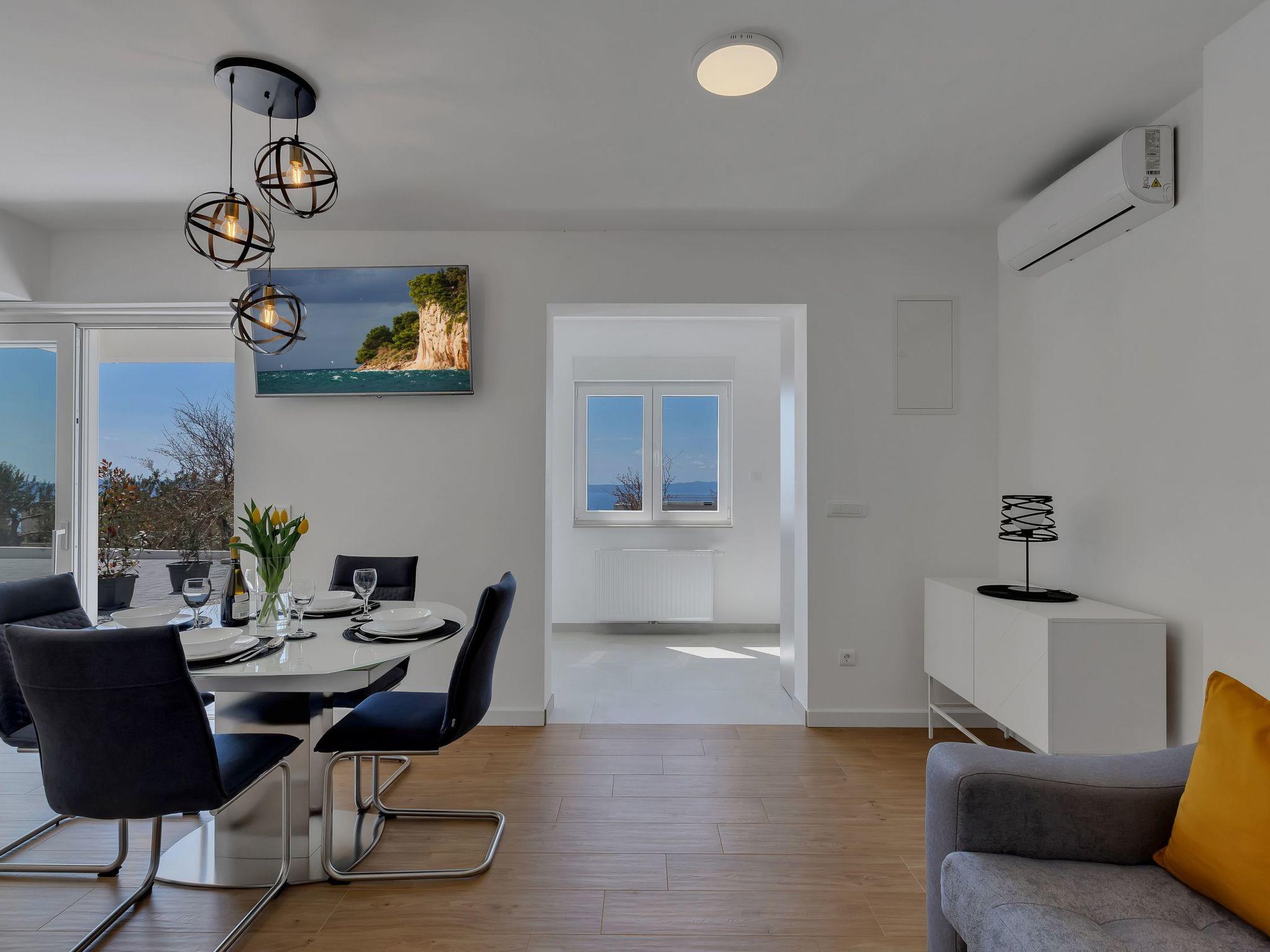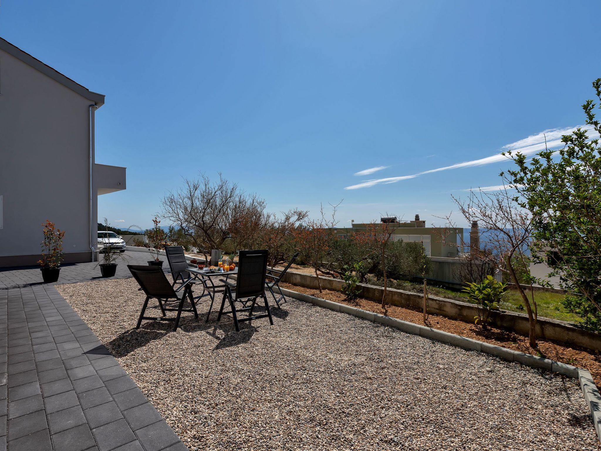 Modern holiday home with sea view is located above the town of Makarska in a quiet location. The property is surrounded by olive trees with a beautifully manicured garden. The holiday home has a spacious living room with air conditioning, TV/SAT, balcony with sea view, an open kitchen, fully equipped, central heating is also available.