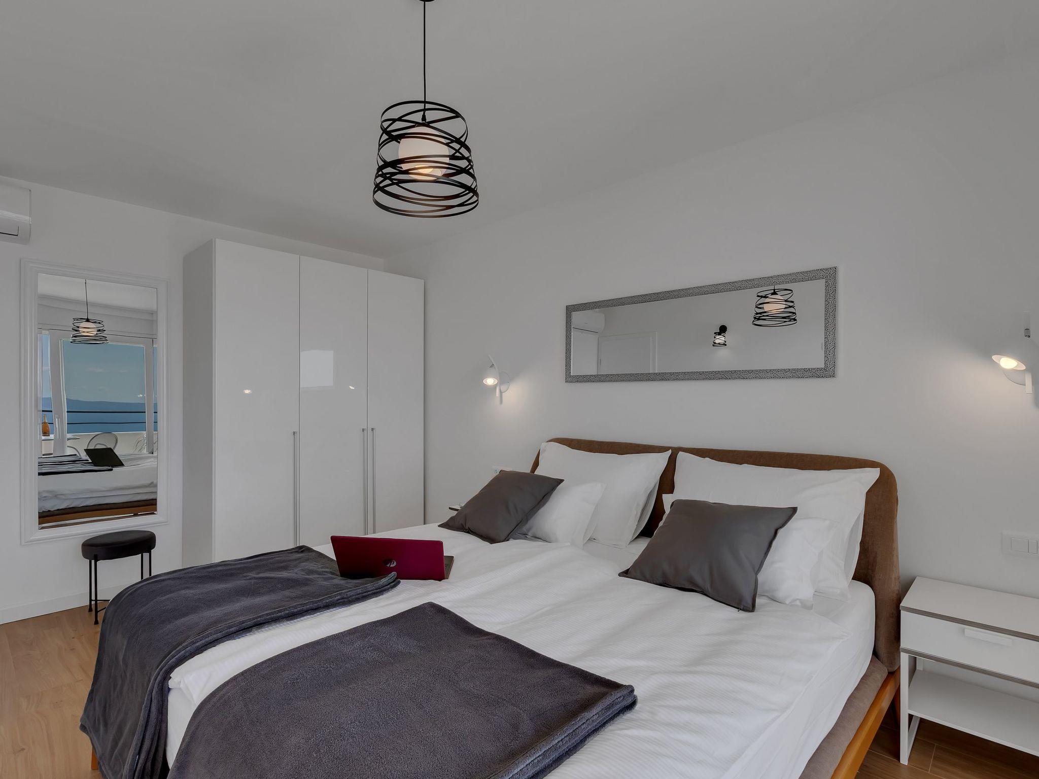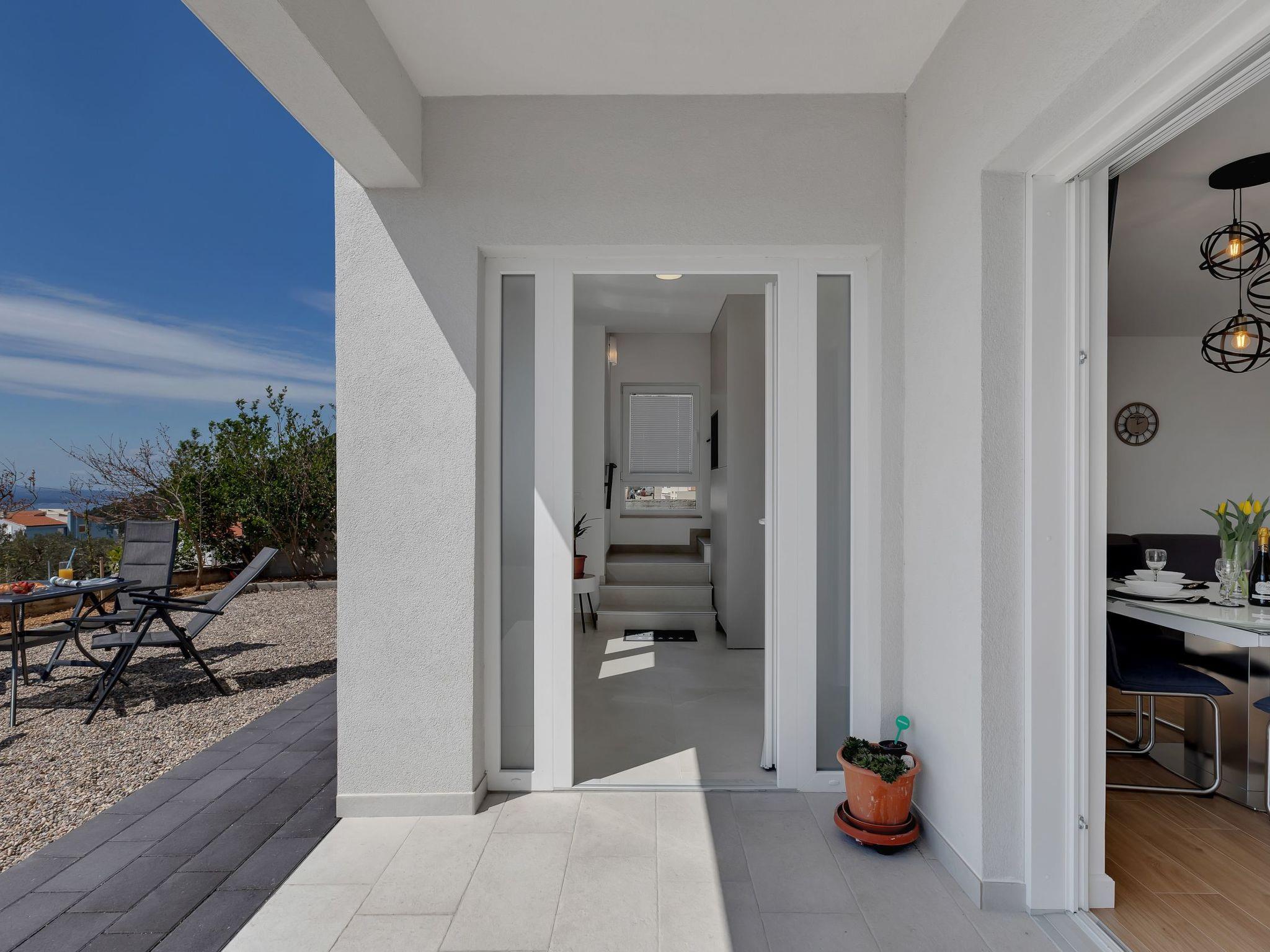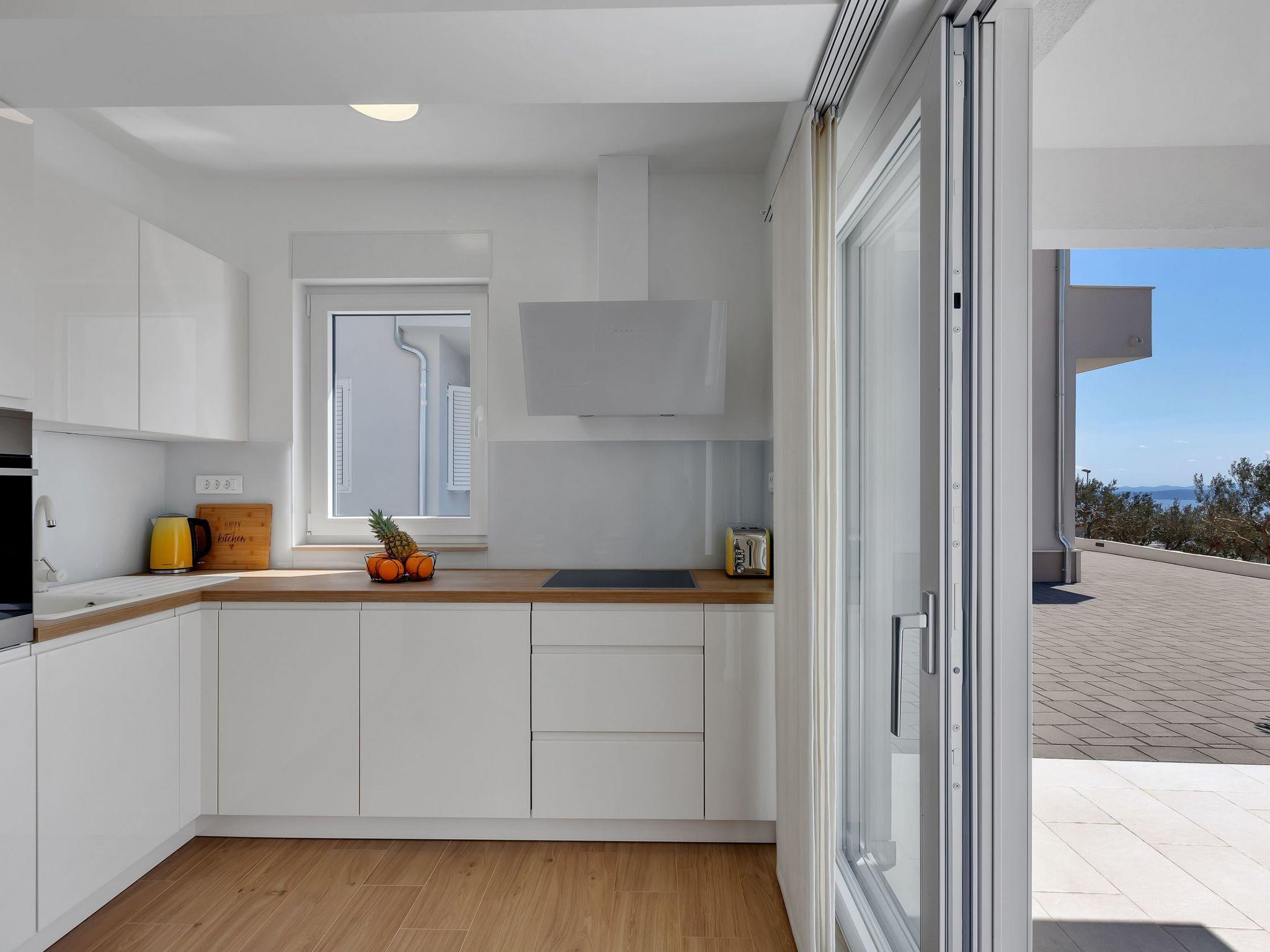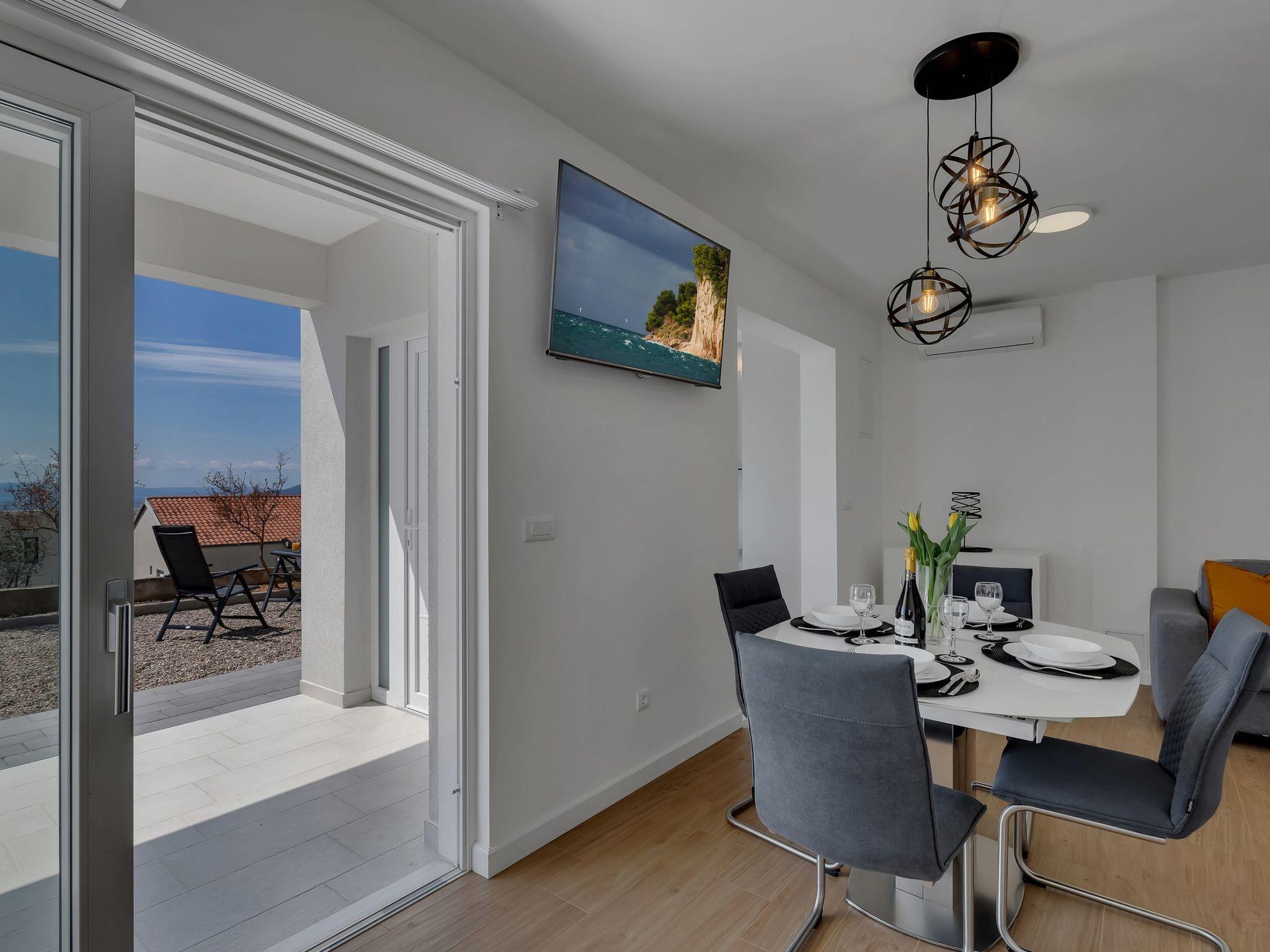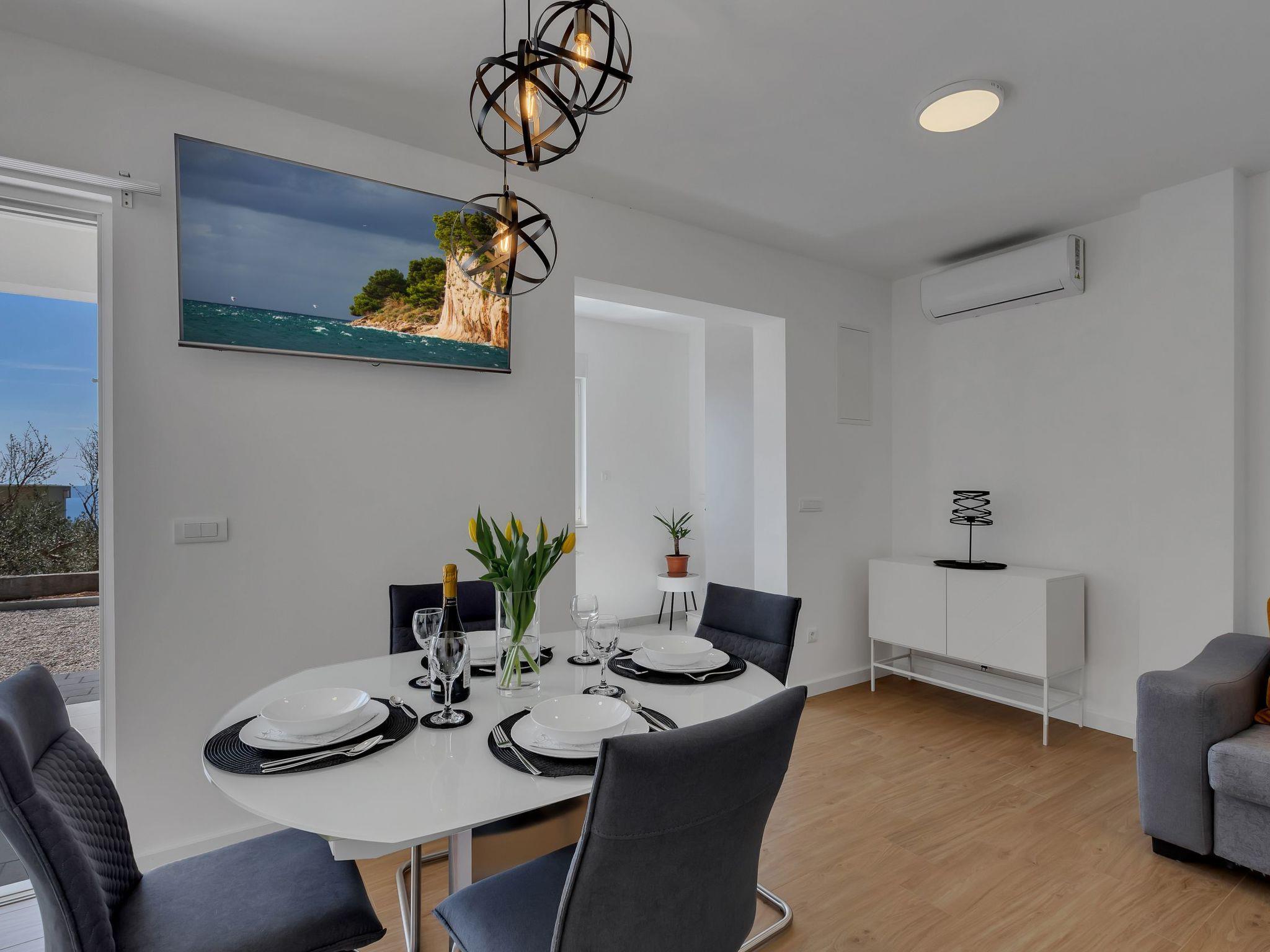 Modern holiday home with sea view is located above the town of Makarska in a quiet location. The property is surrounded by olive trees with a beautifully manicured garden. The holiday home has a spacious living room with air conditioning, TV/SAT, balcony with sea view, an open kitchen, fully equipped, central heating is also available.