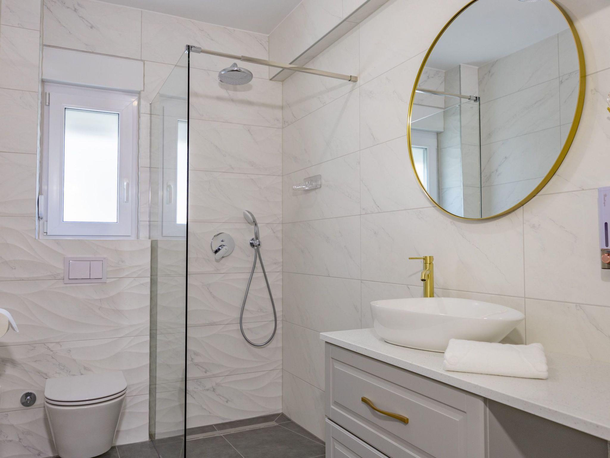 Practicality is paramount in this flat. It has a modern bathroom with a refreshing shower and elegant fittings, as well as a separate WC for added comfort and privacy.