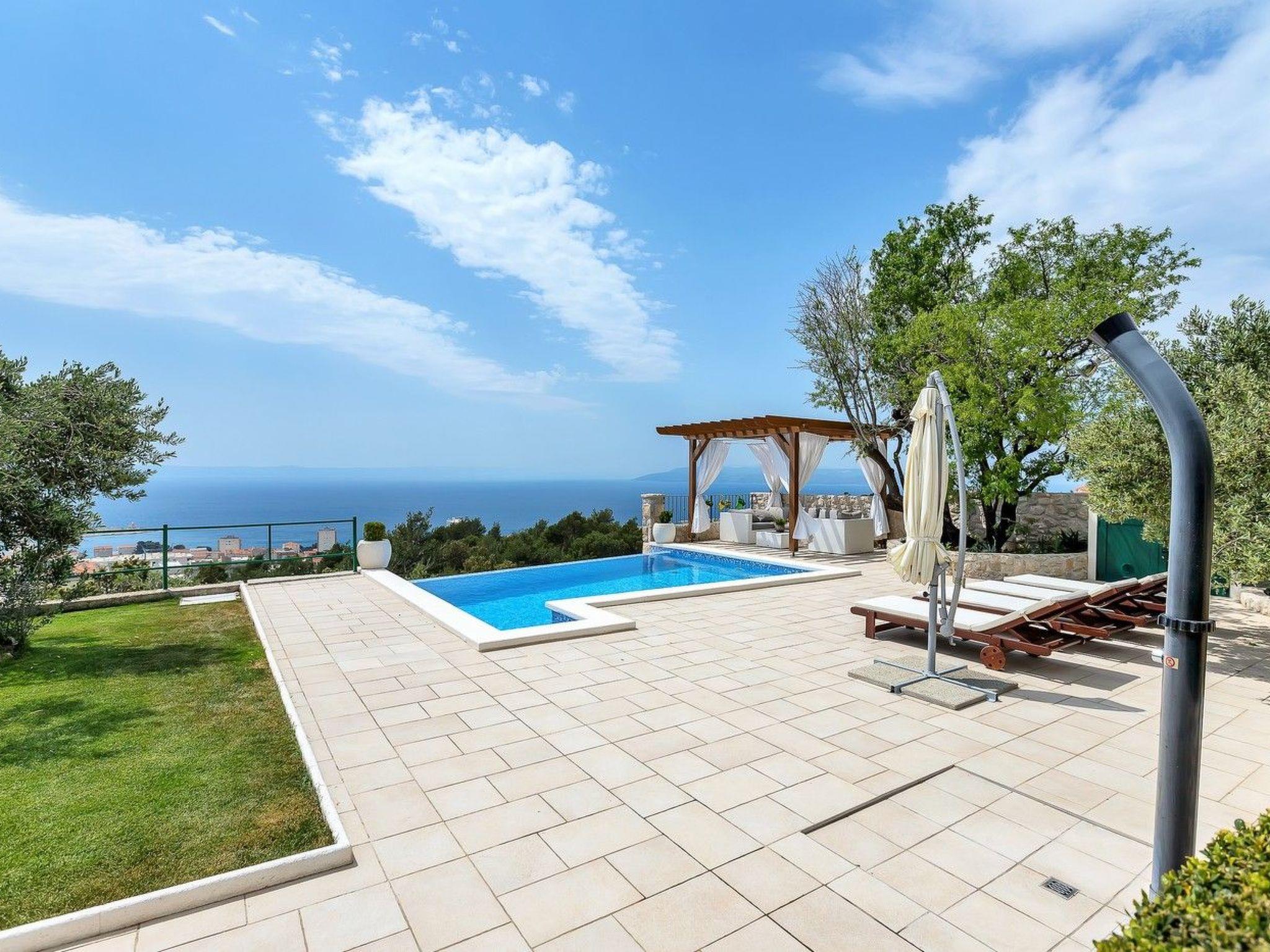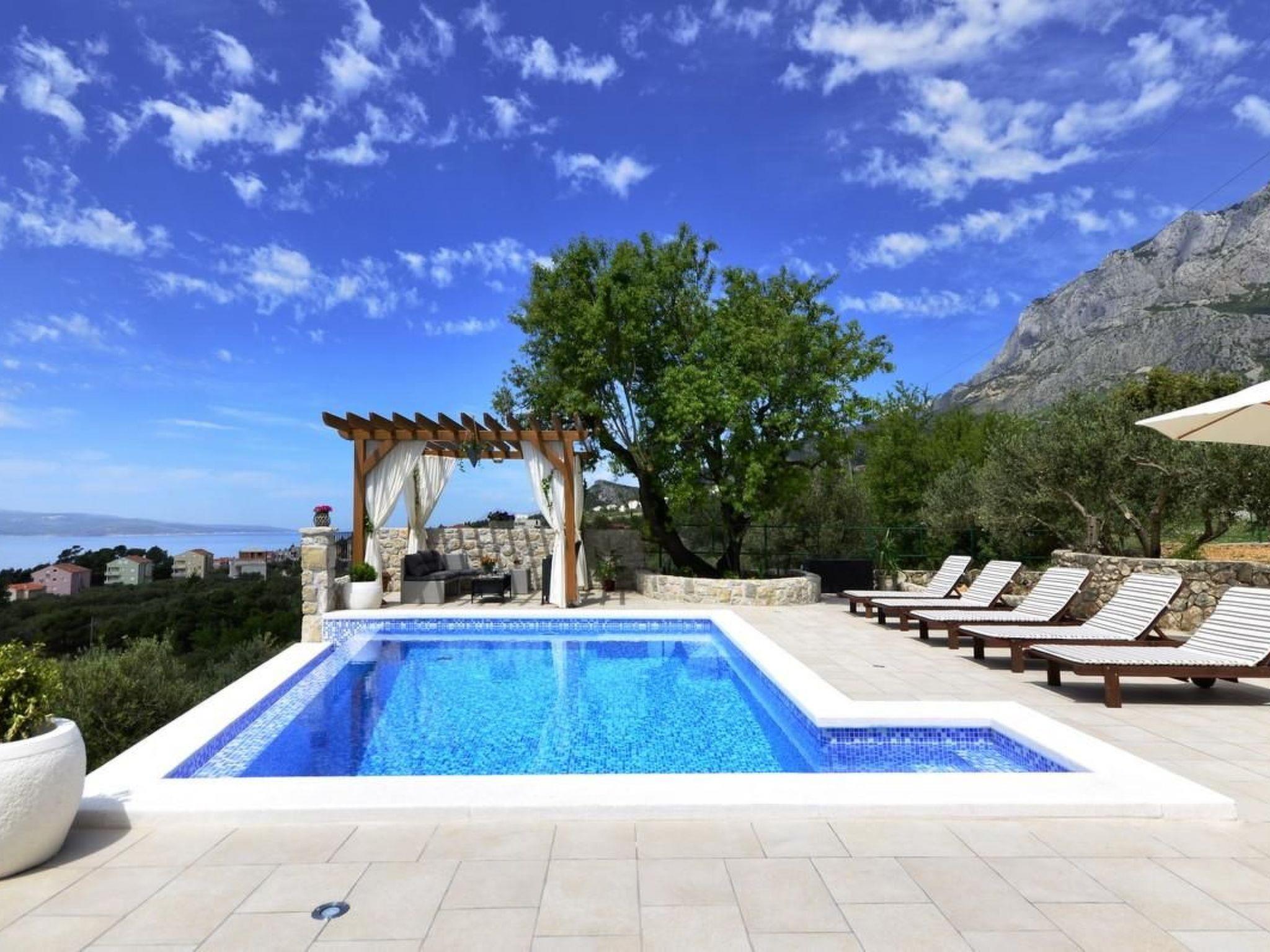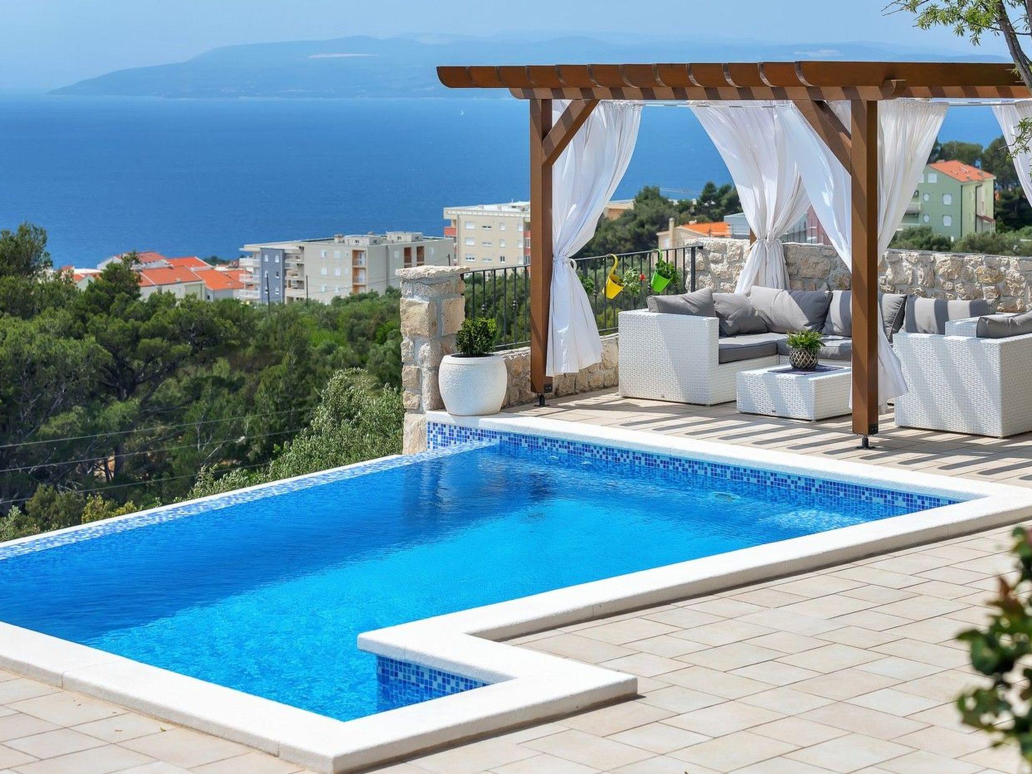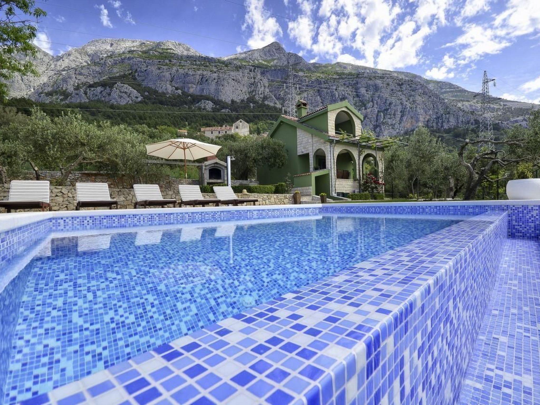 The holiday home Maria with heated pool is located in the hamlet of Puharici, above the town of Makarska. This detached holiday home has three floors and a plot of approx. 500 square metres. The house is surrounded by olive trees, has a well-kept garden with barbecue area and garden furniture. The overflow pool (heated) is about 25 square metres in size and from here you can enjoy the beautiful view of the sea and the town of Makarska. Sun loungers and an outdoor shower are also available.