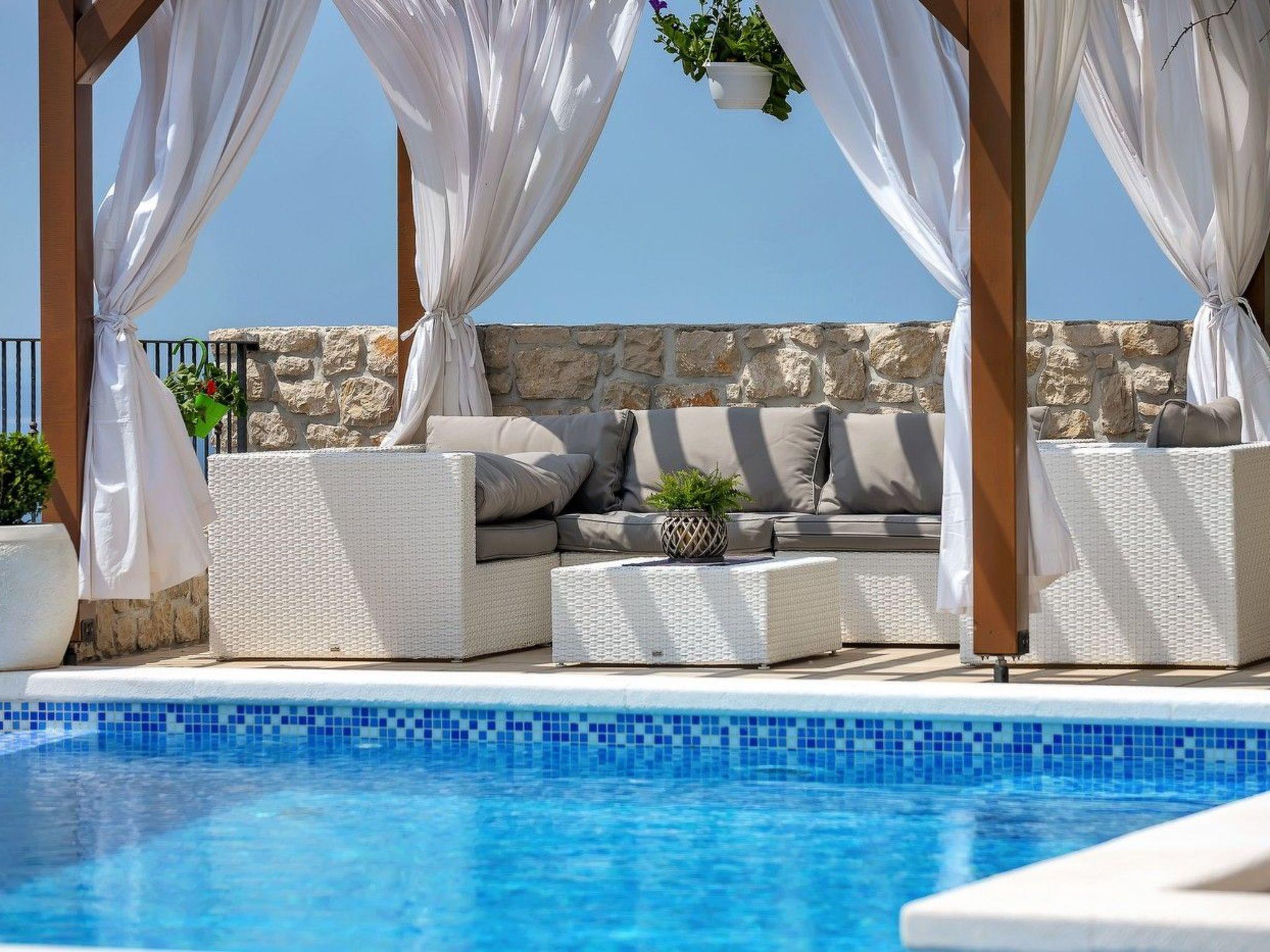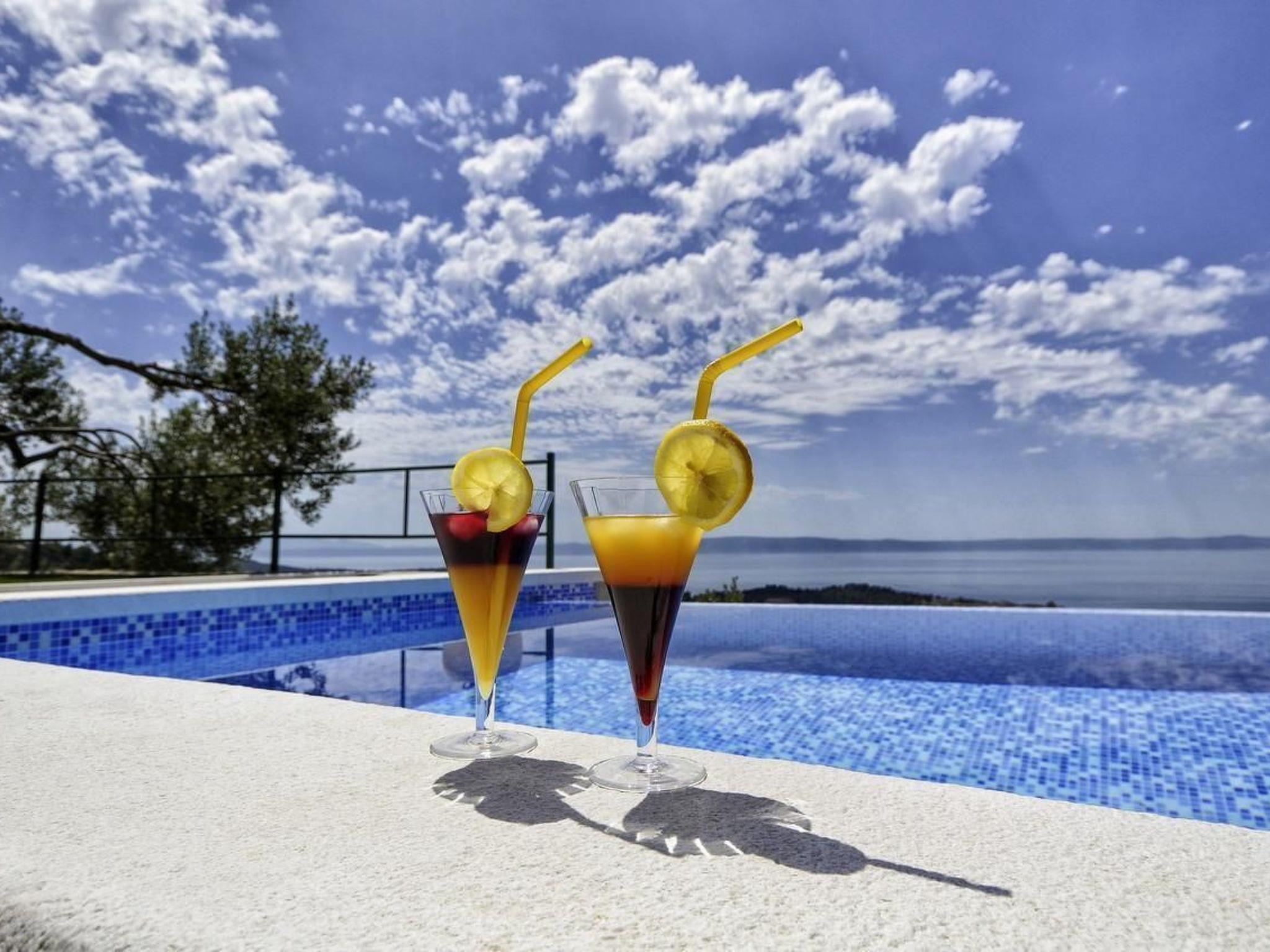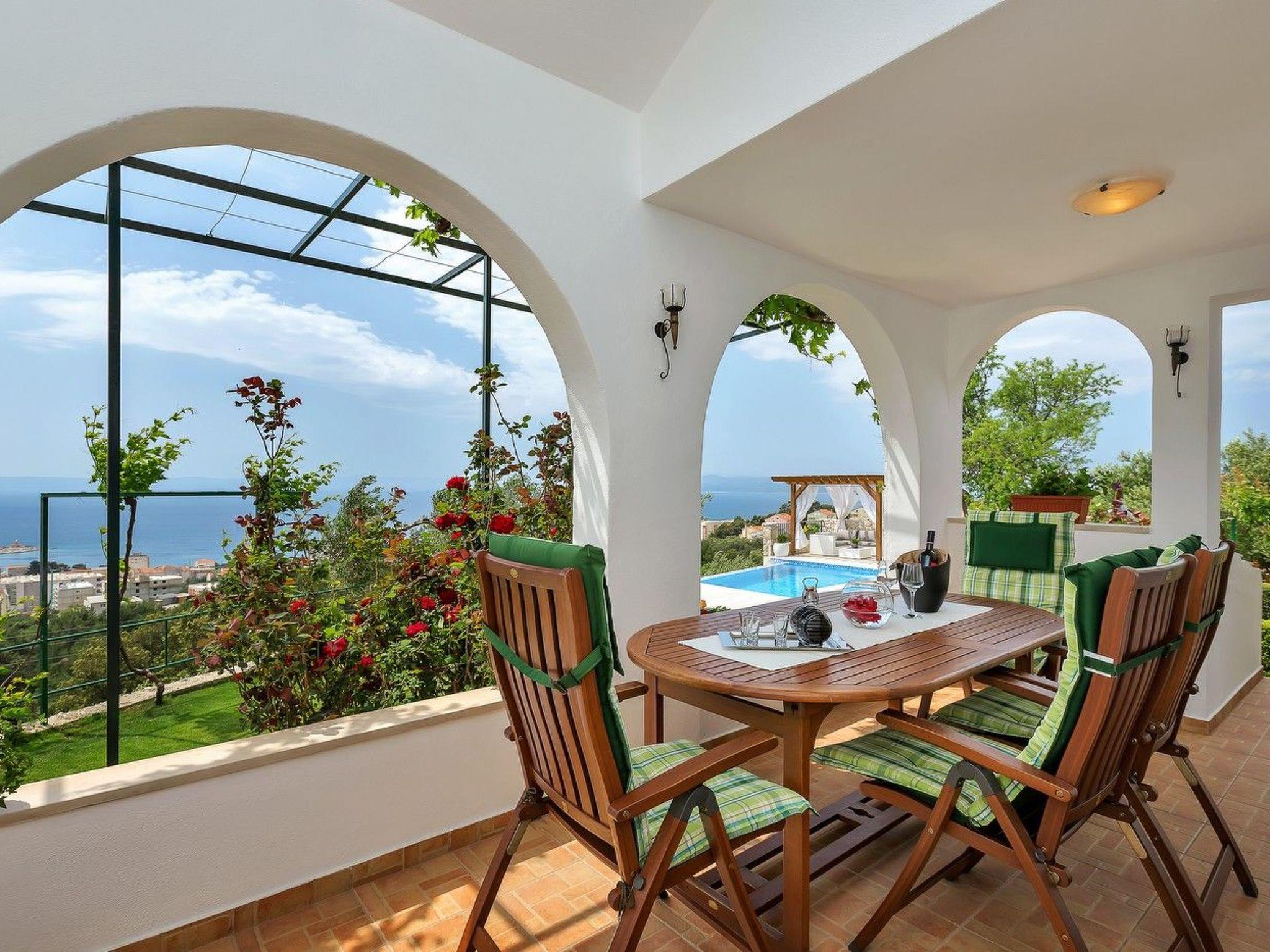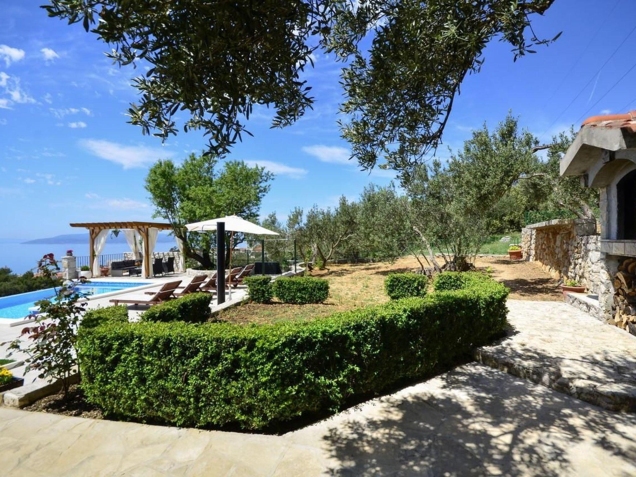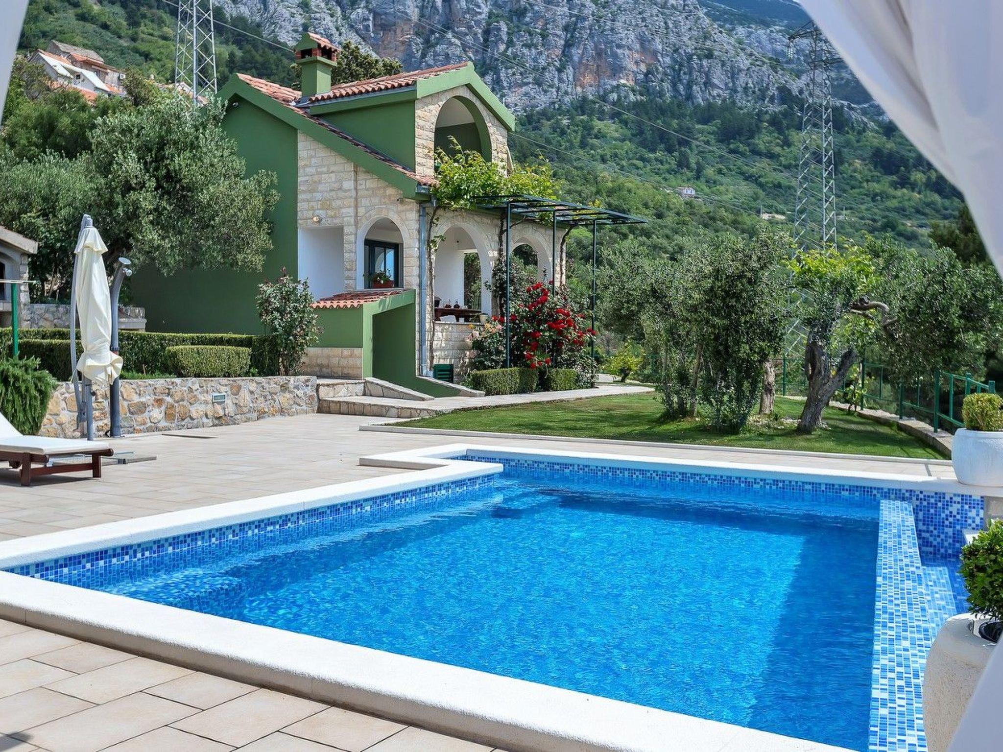 The holiday home Maria with heated pool is located in the hamlet of Puharici, above the town of Makarska. This detached holiday home has three floors and a plot of approx. 500 square metres. The house is surrounded by olive trees, has a well-kept garden with barbecue area and garden furniture. The overflow pool (heated) is about 25 square metres in size and from here you can enjoy the beautiful view of the sea and the town of Makarska. Sun loungers and an outdoor shower are also available.