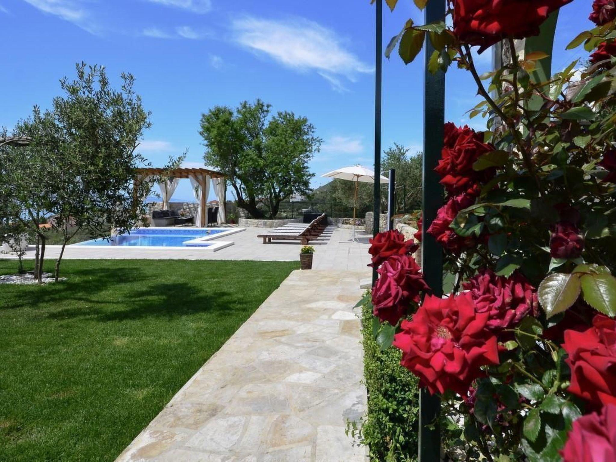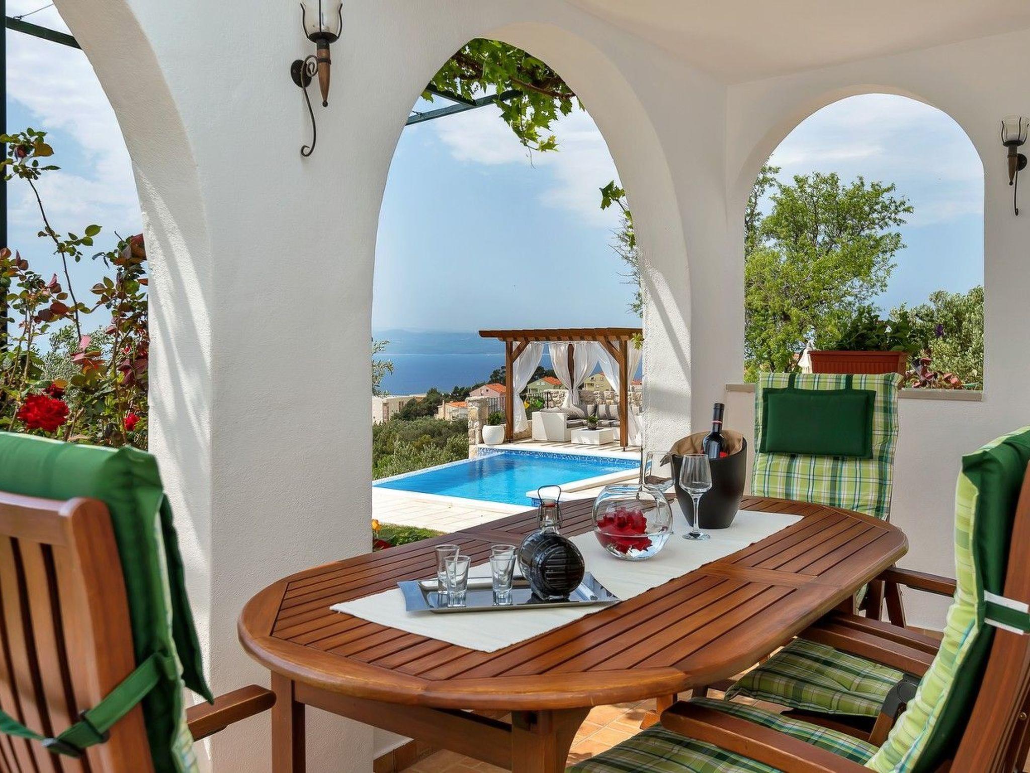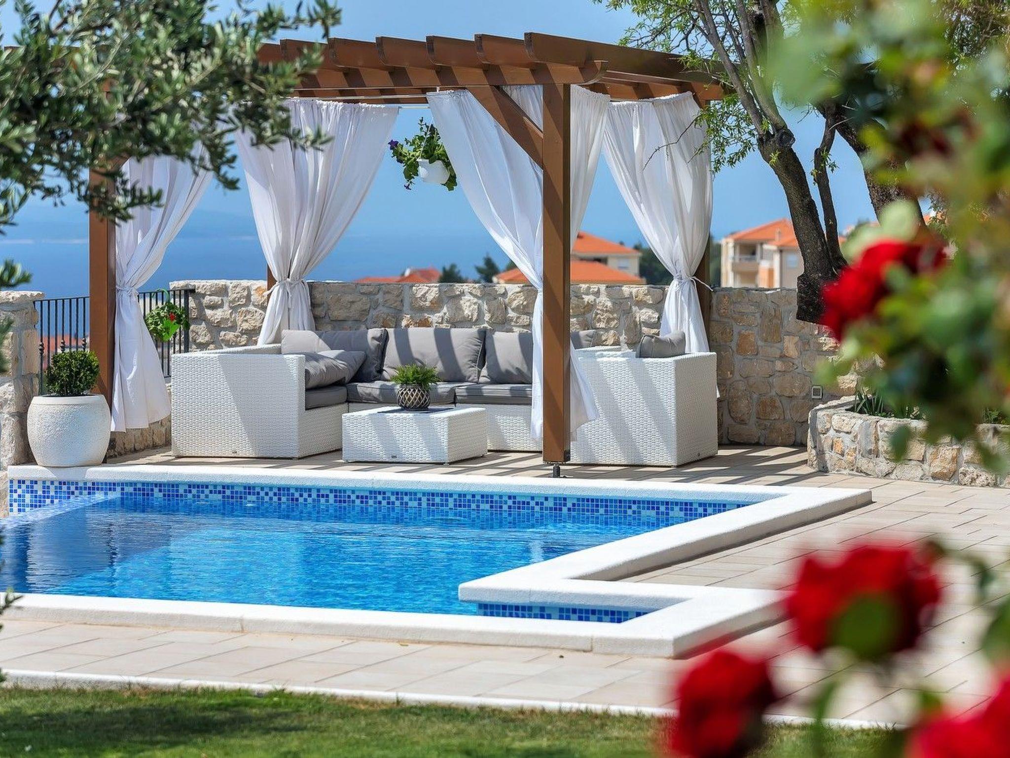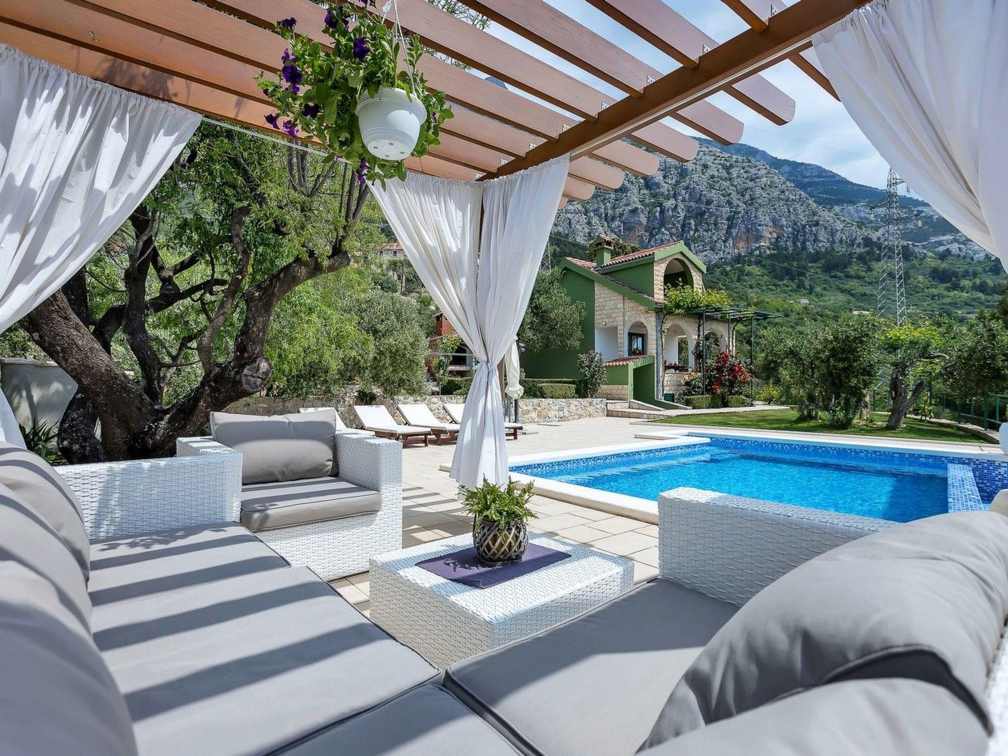 The holiday home Maria with heated pool is located in the hamlet of Puharici, above the town of Makarska. This detached holiday home has three floors and a plot of approx. 500 square metres. The house is surrounded by olive trees, has a well-kept garden with barbecue area and garden furniture. The overflow pool (heated) is about 25 square metres in size and from here you can enjoy the beautiful view of the sea and the town of Makarska. Sun loungers and an outdoor shower are also available.