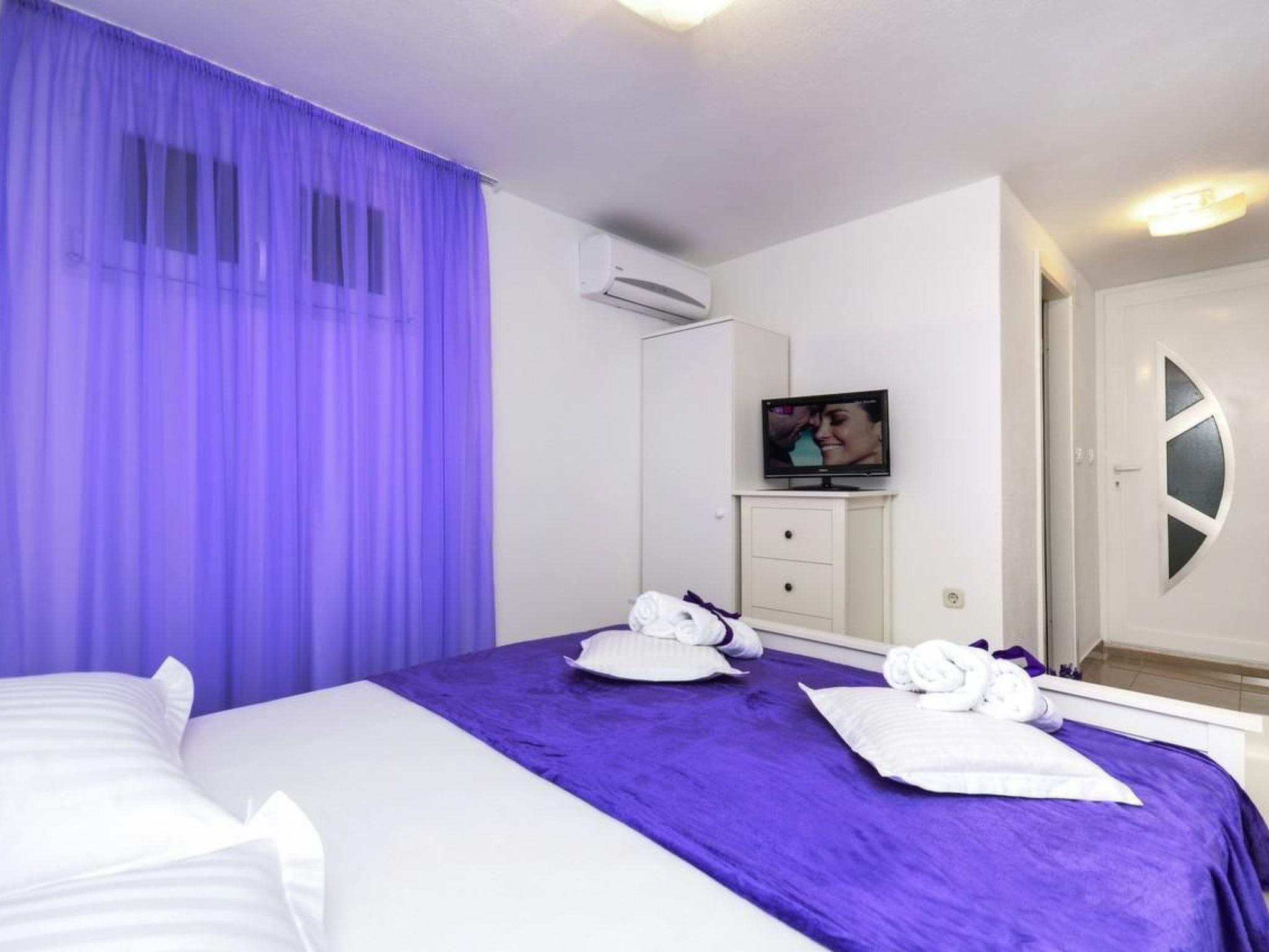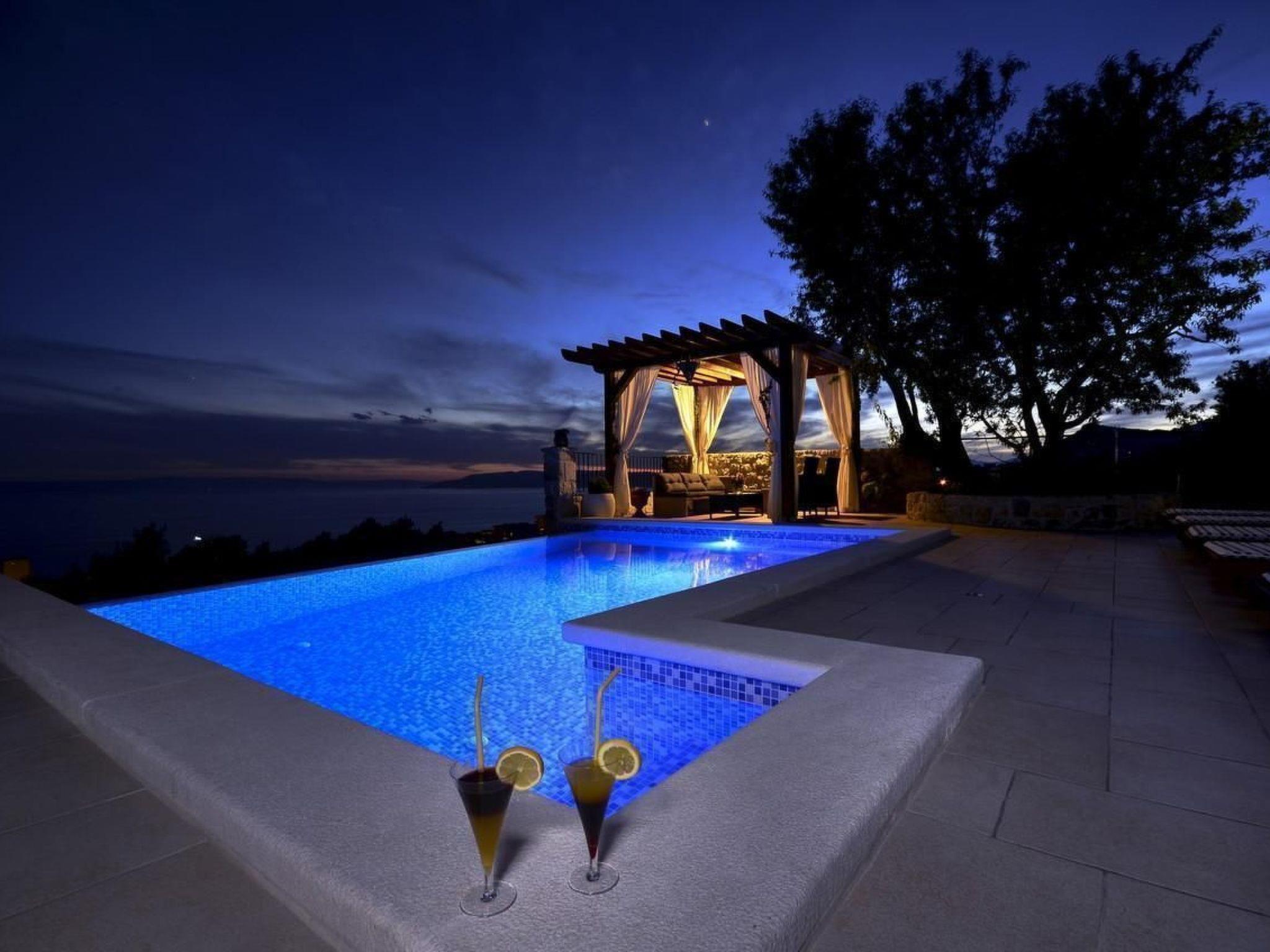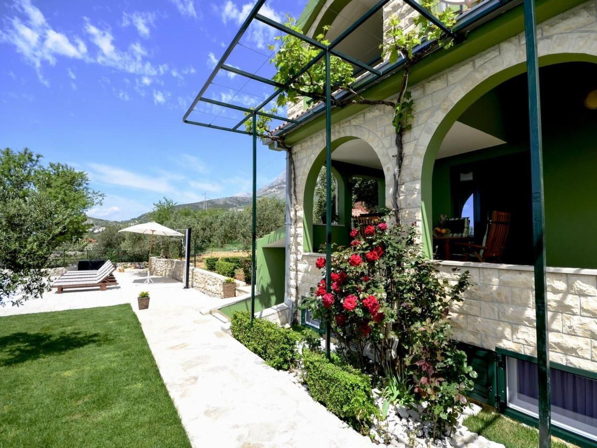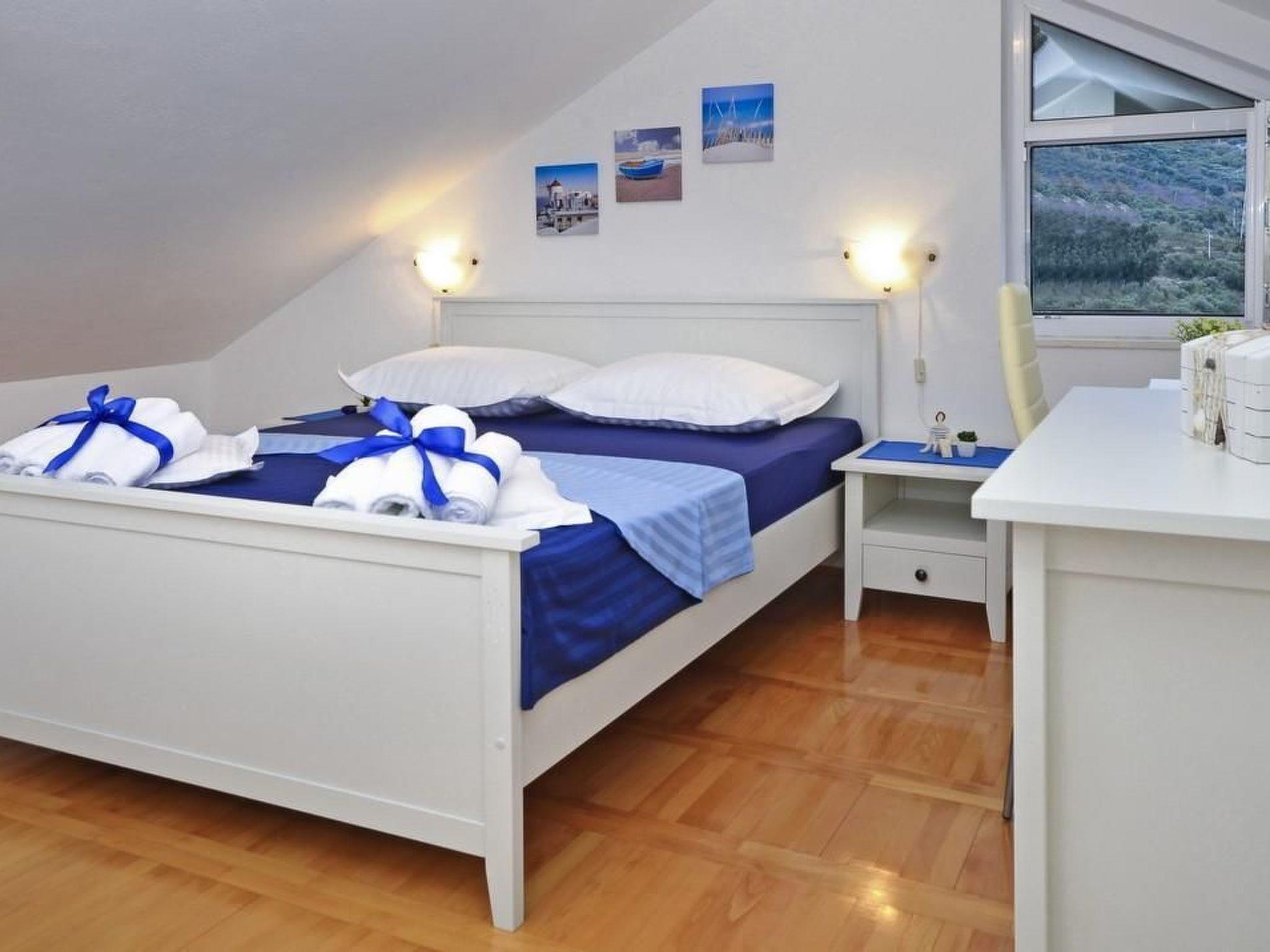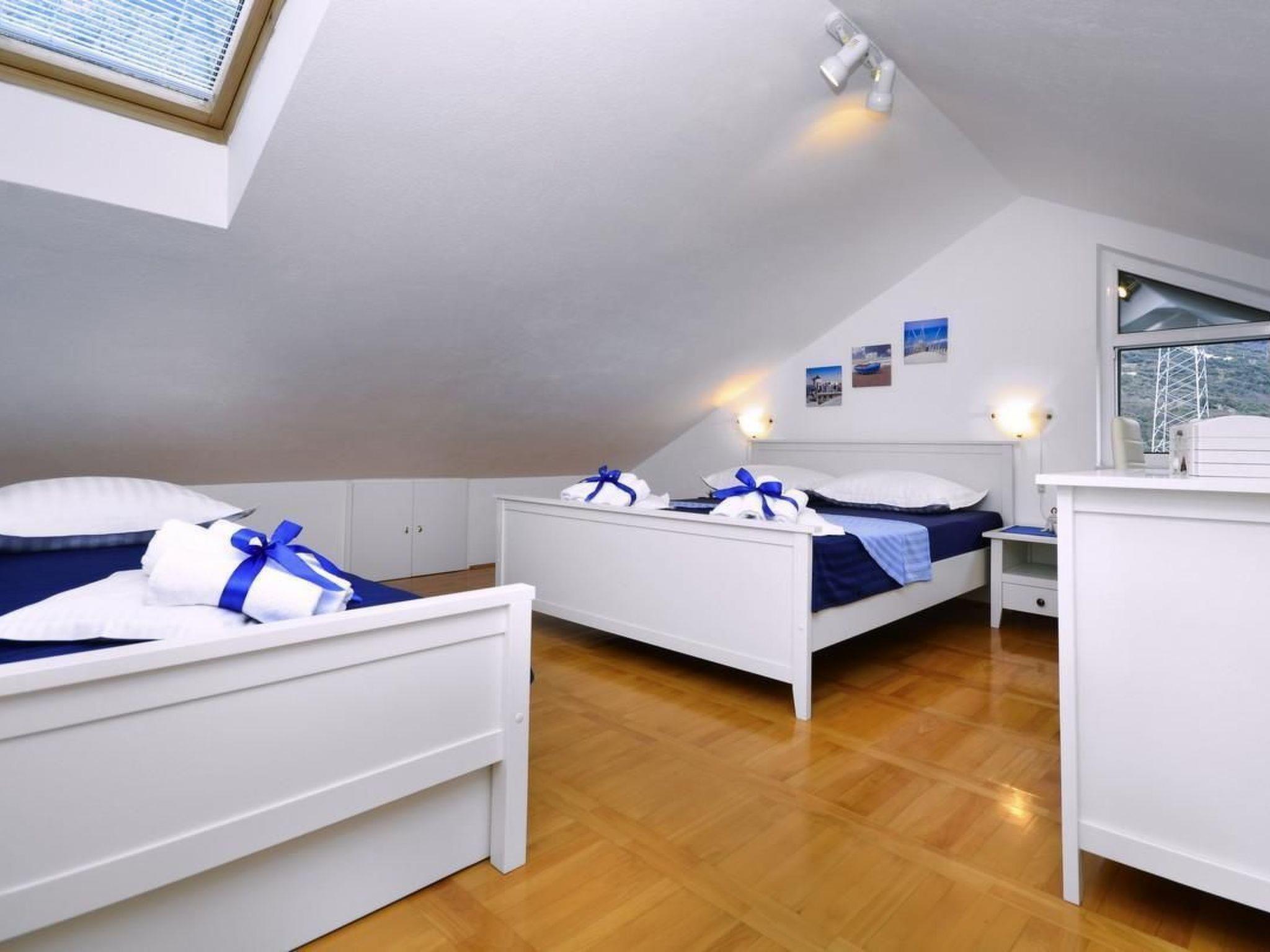 The holiday home Maria with heated pool is located in the hamlet of Puharici, above the town of Makarska. This detached holiday home has three floors and a plot of approx. 500 square metres. The house is surrounded by olive trees, has a well-kept garden with barbecue area and garden furniture. The overflow pool (heated) is about 25 square metres in size and from here you can enjoy the beautiful view of the sea and the town of Makarska. Sun loungers and an outdoor shower are also available.