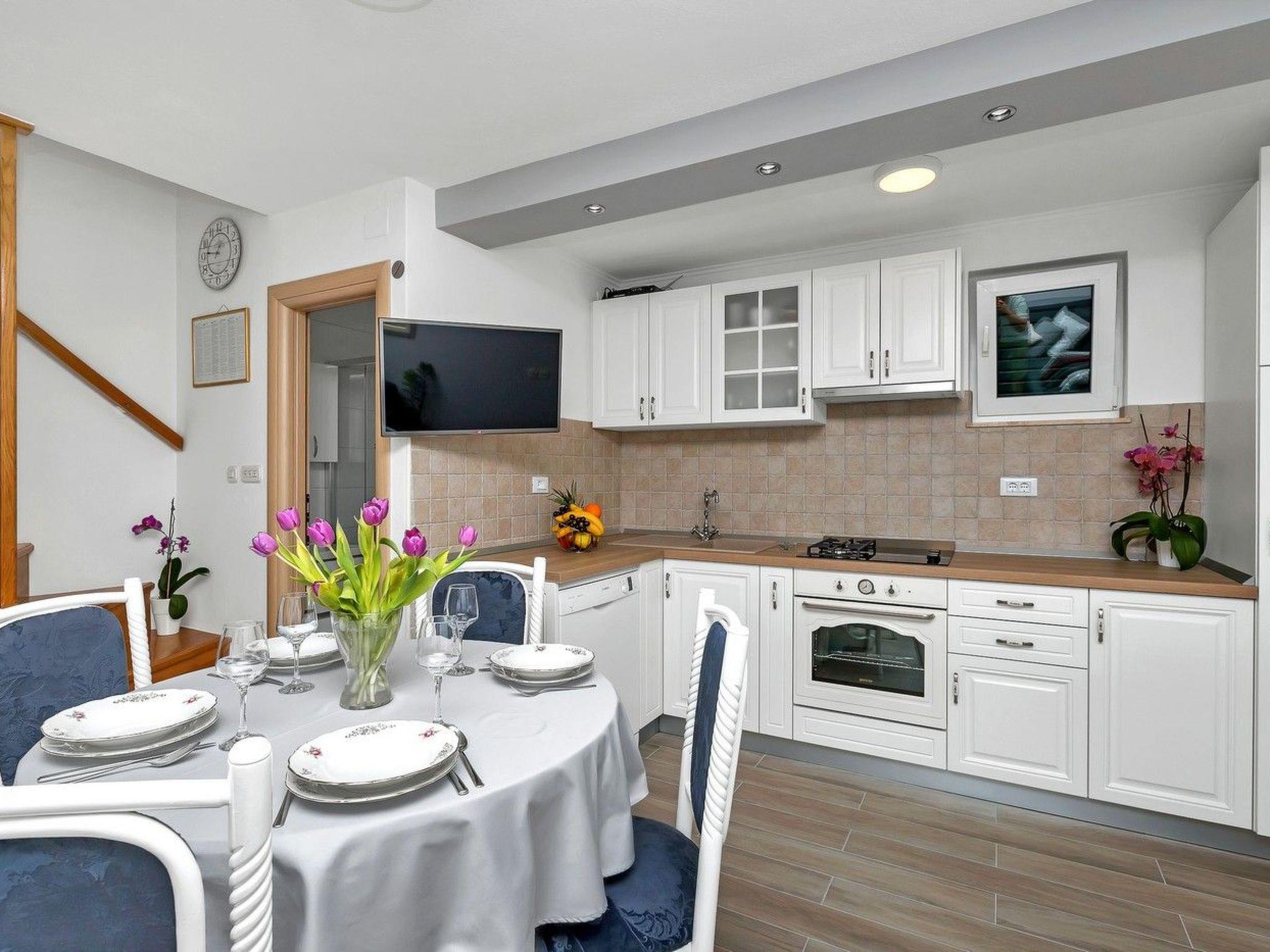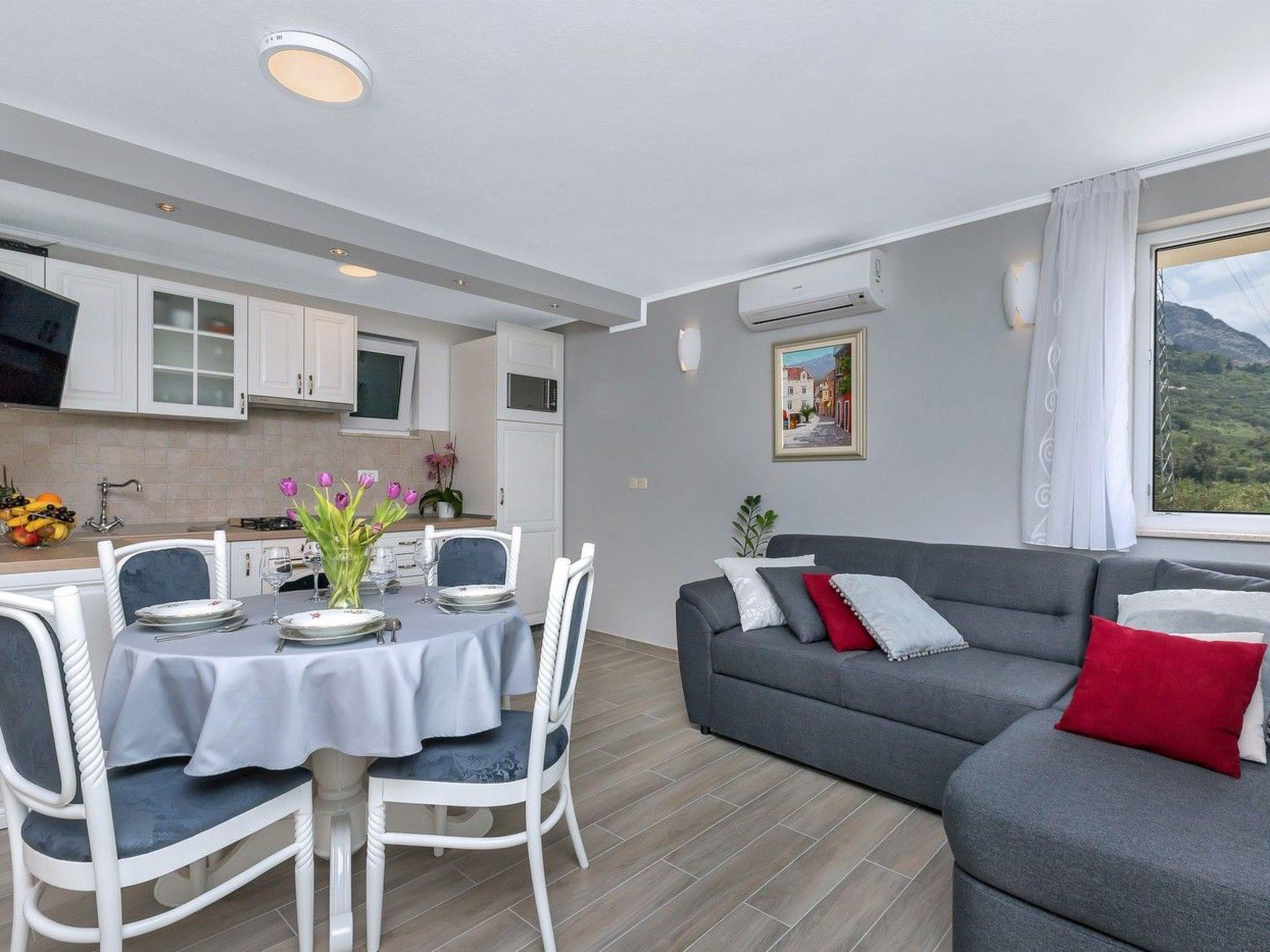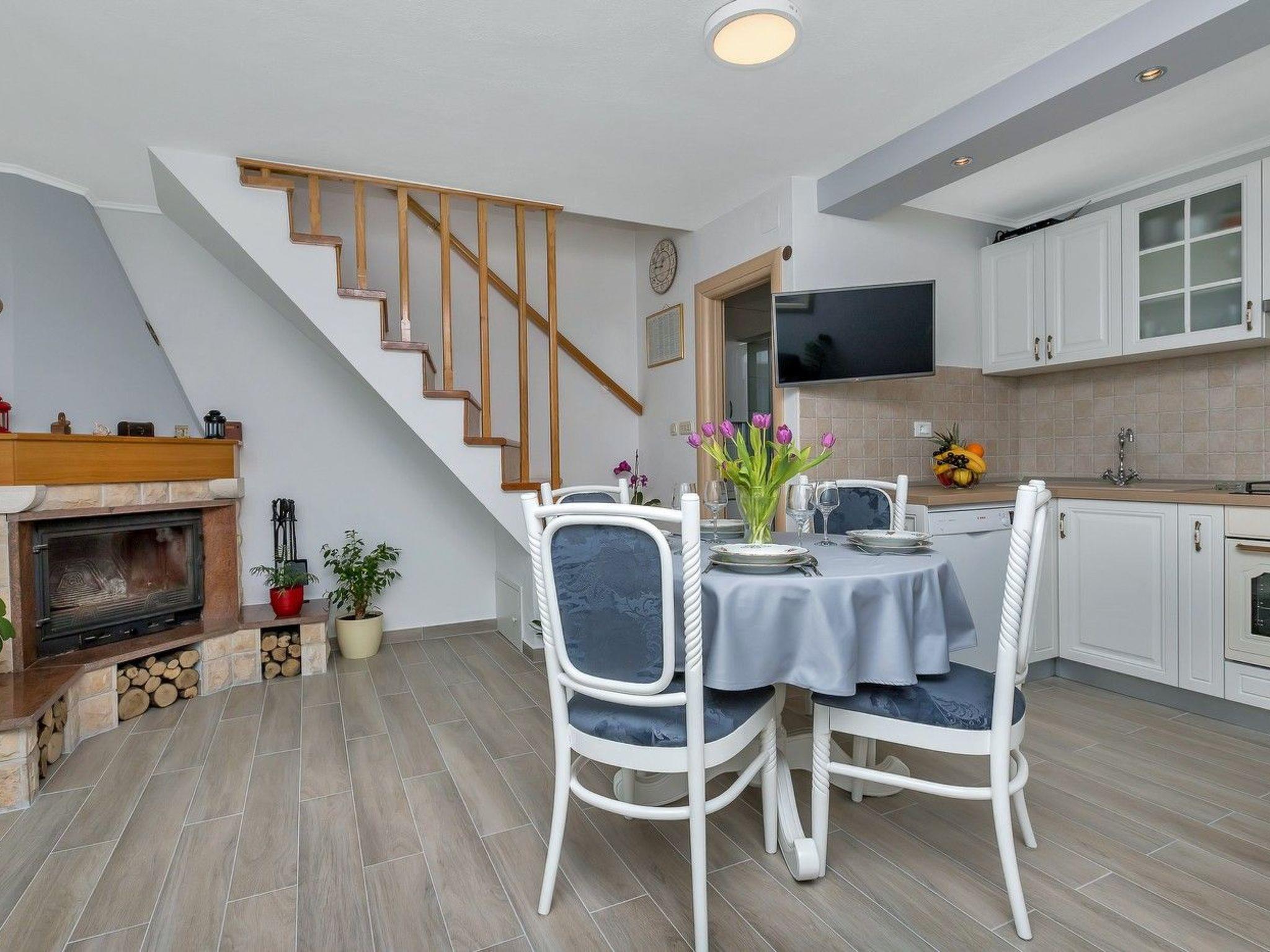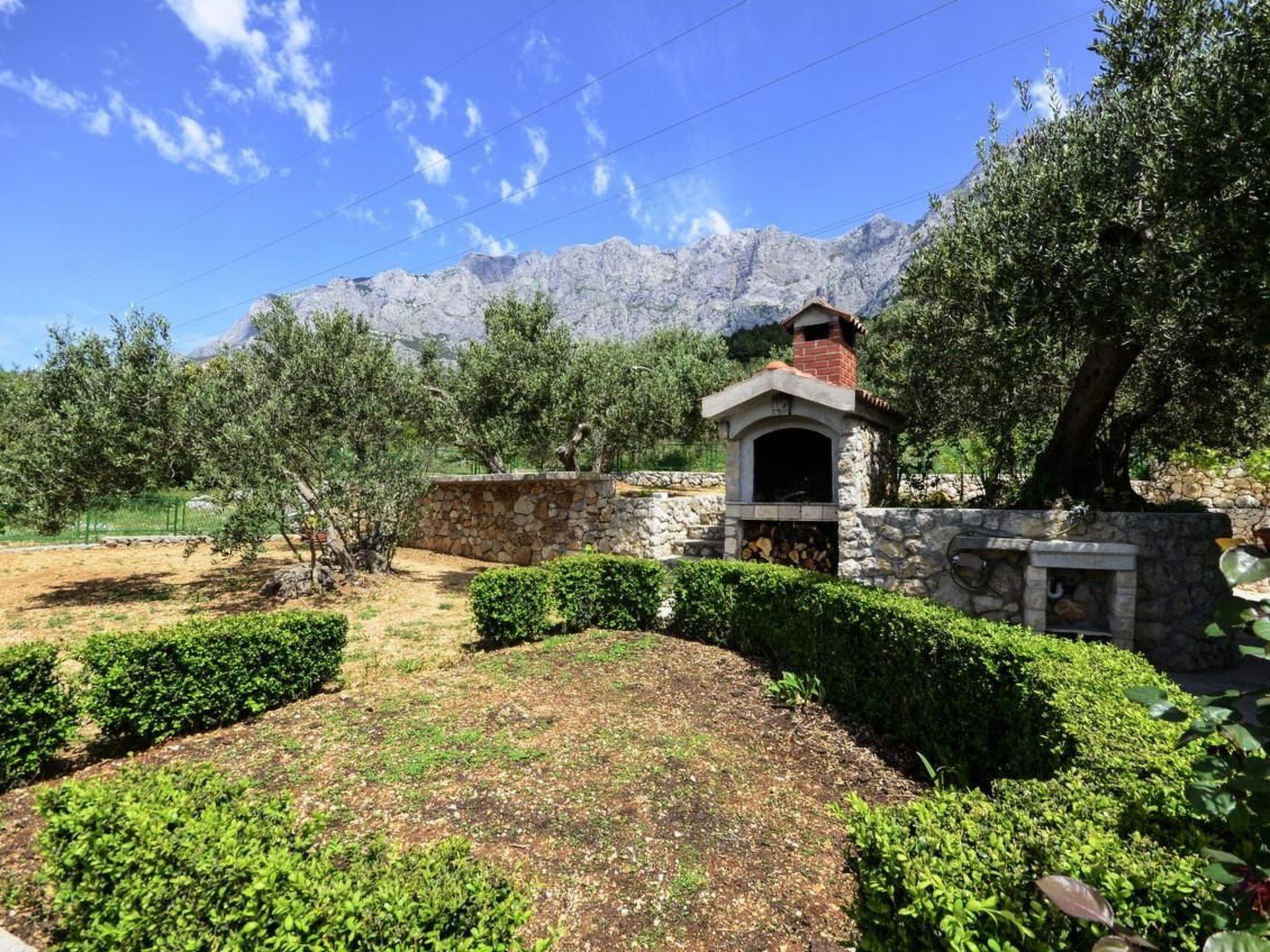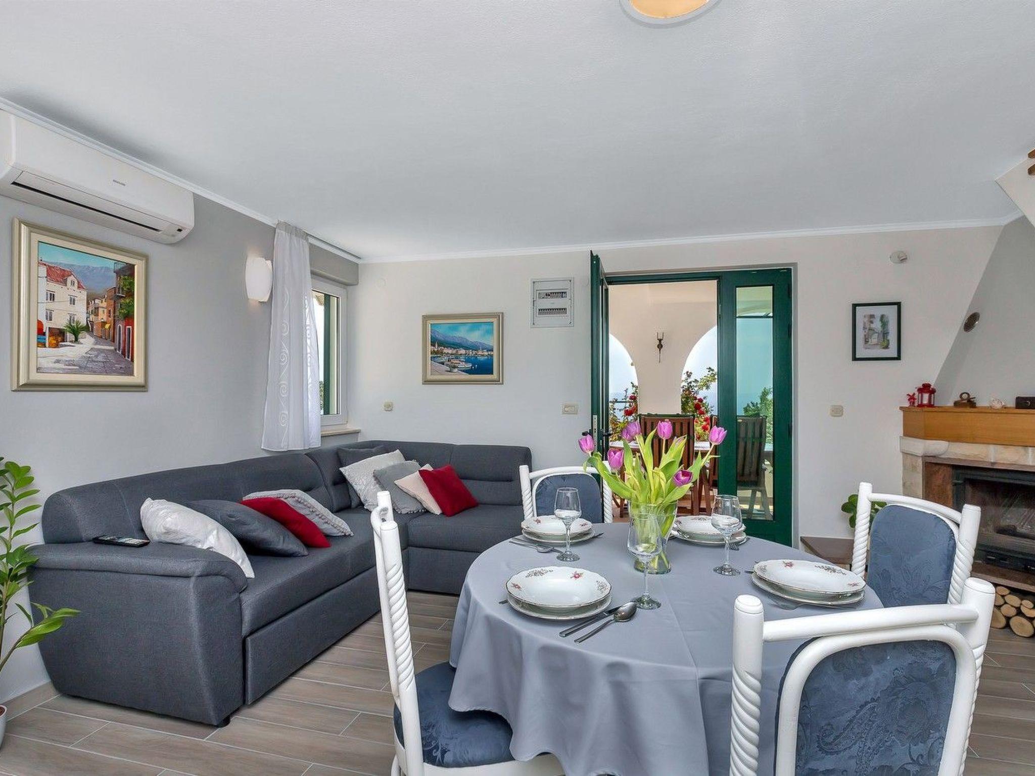 In the house, which is spread over three floors, there is a living room with dining area and sofa bed, fireplace, kitchen and bathroom. On the first floor there is a bedroom with a double bed and a single bed, a loggia with a seating area and a view of the sea and the town of Makarska. In the basement is the second double bedroom with bathroom, separate entrance. Connected to the upper floor by an external staircase.