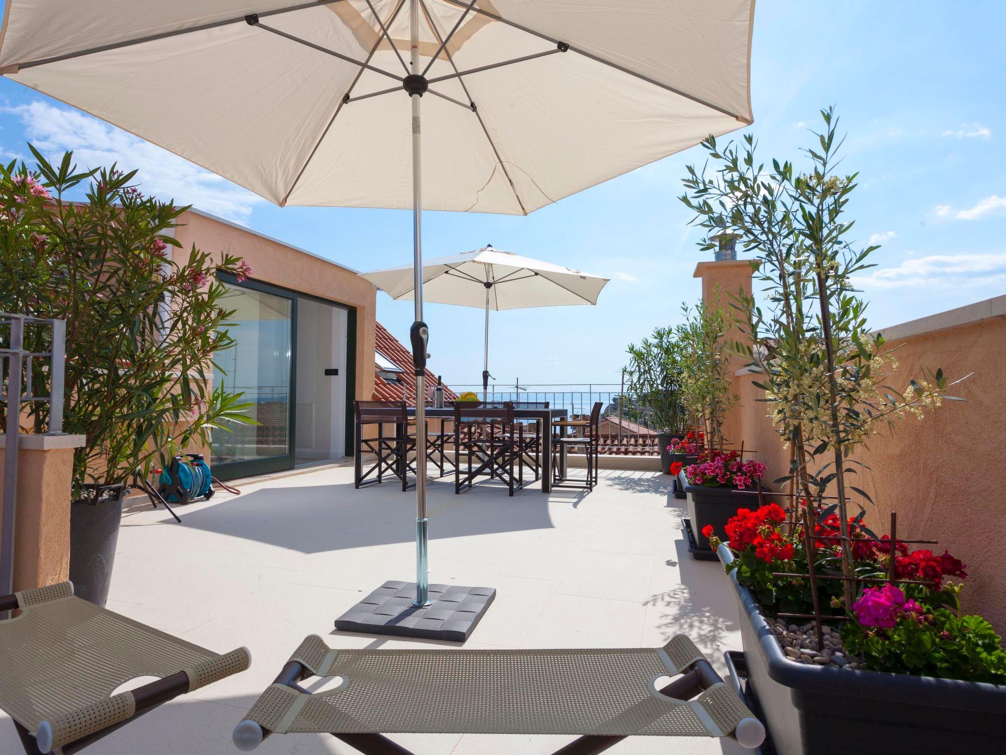 TERRACE: Large terrace 42 m2, table and chairs, parasol, sea view and mountain views.