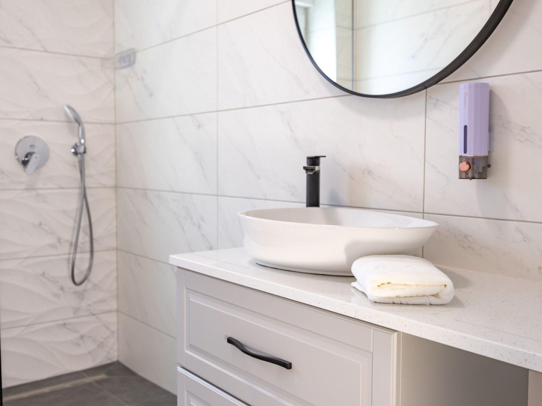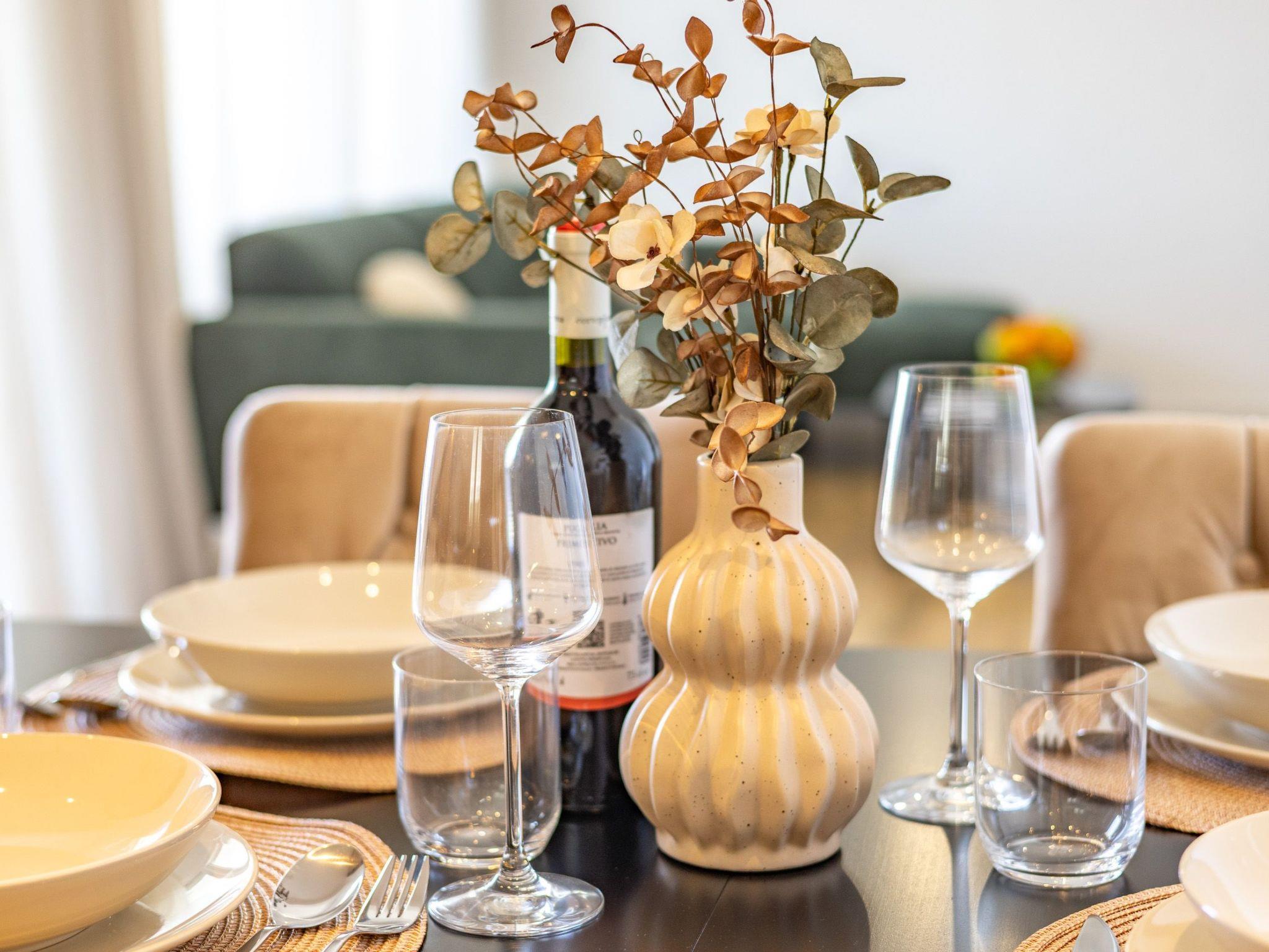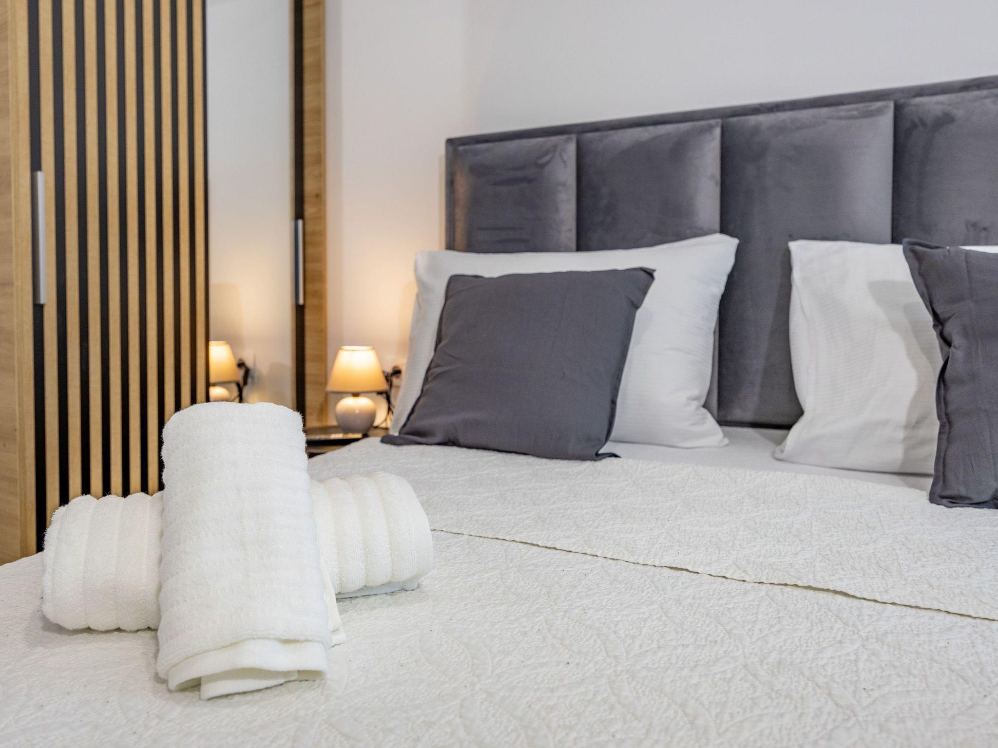 Upon entering this carefully designed flat, you are greeted by a spacious living room with tasteful furnishings and modern décor. The open concept seamlessly connects the living room with the fully equipped kitchen, creating a warm and inviting atmosphere for gatherings with family and friends. The kitchen boasts sleek countertops, modern appliances and ample storage space, providing everything you need to prepare delicious meals during your stay.