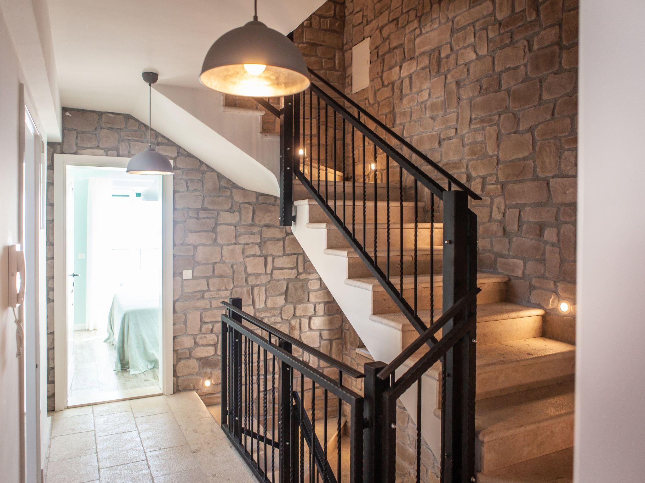 The villa has five separate bedrooms each with an ensuite bathroom. The bedrooms are furnished with a big double bed, so 10 people can be accommodated. The living space totals around 340m². The ground floor consists of a spacious living room with an open kitchen and a dining table for up to 10 people. There is also a little WC and a utility room with a washing machine. The first bedroom and bathroom are on the ground floor. The first floor comprises three bedrooms and bathrooms, and a wonderful sunny terrace. There is another bedroom with a little balcony on the second floor/attic.