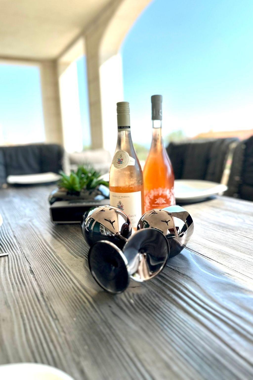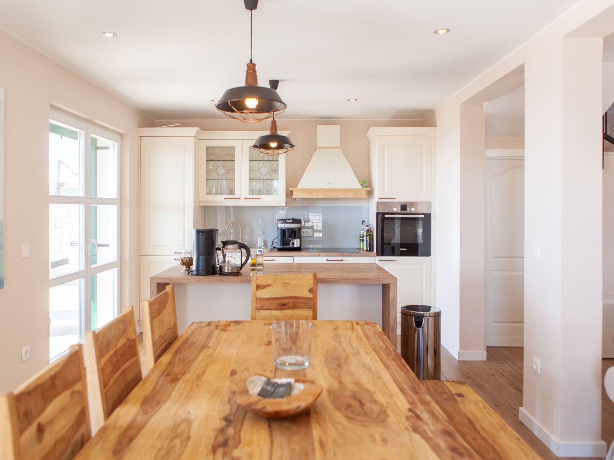 The living room and kitchen open onto the sheltered terrace that also has a dining table. There is another holiday villa on site. The two houses are right next to each other, but are independent with their own entrance and garden. In the outdoor area you can find a private heated pool, a roofed terrace with a grill, a herb garden, loungers and parasols. You can enjoy a breathtaking 180° view.