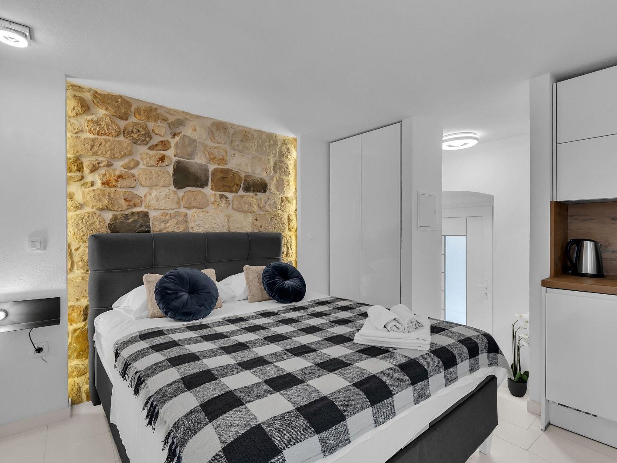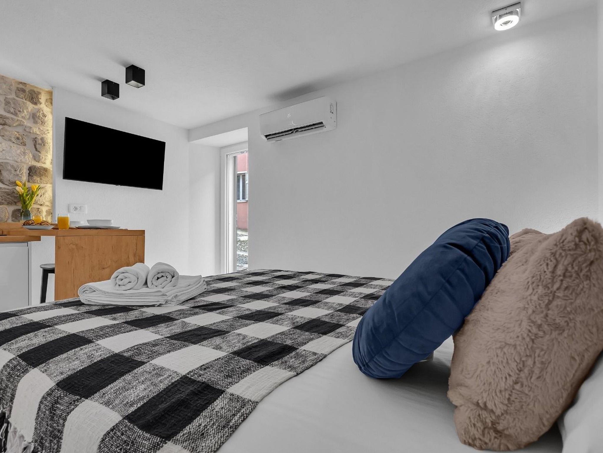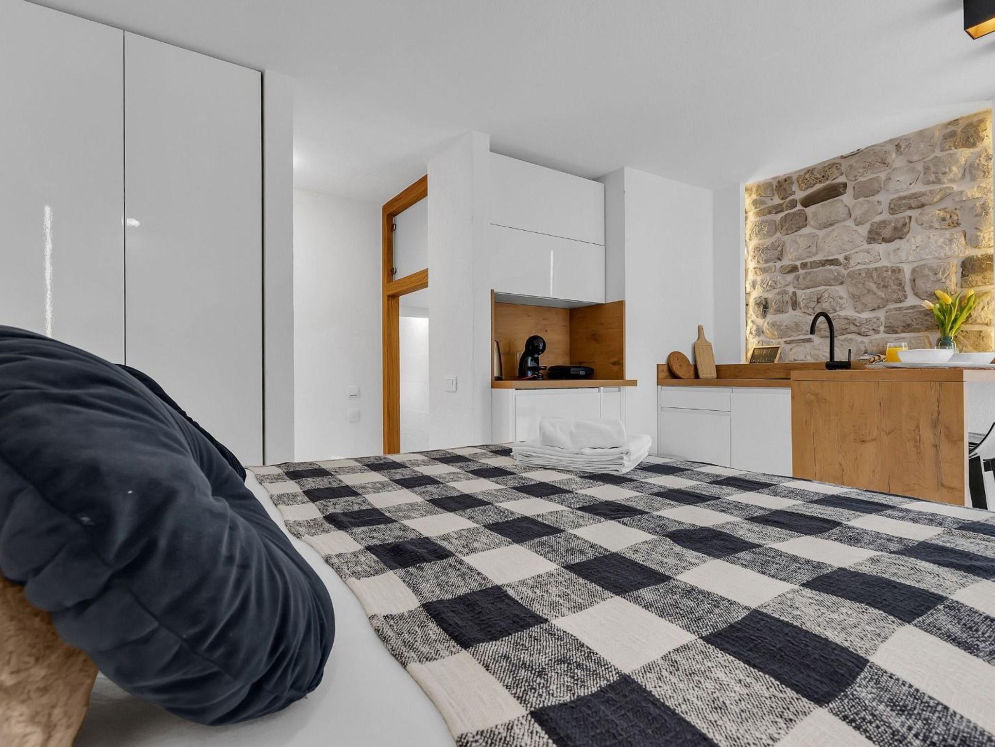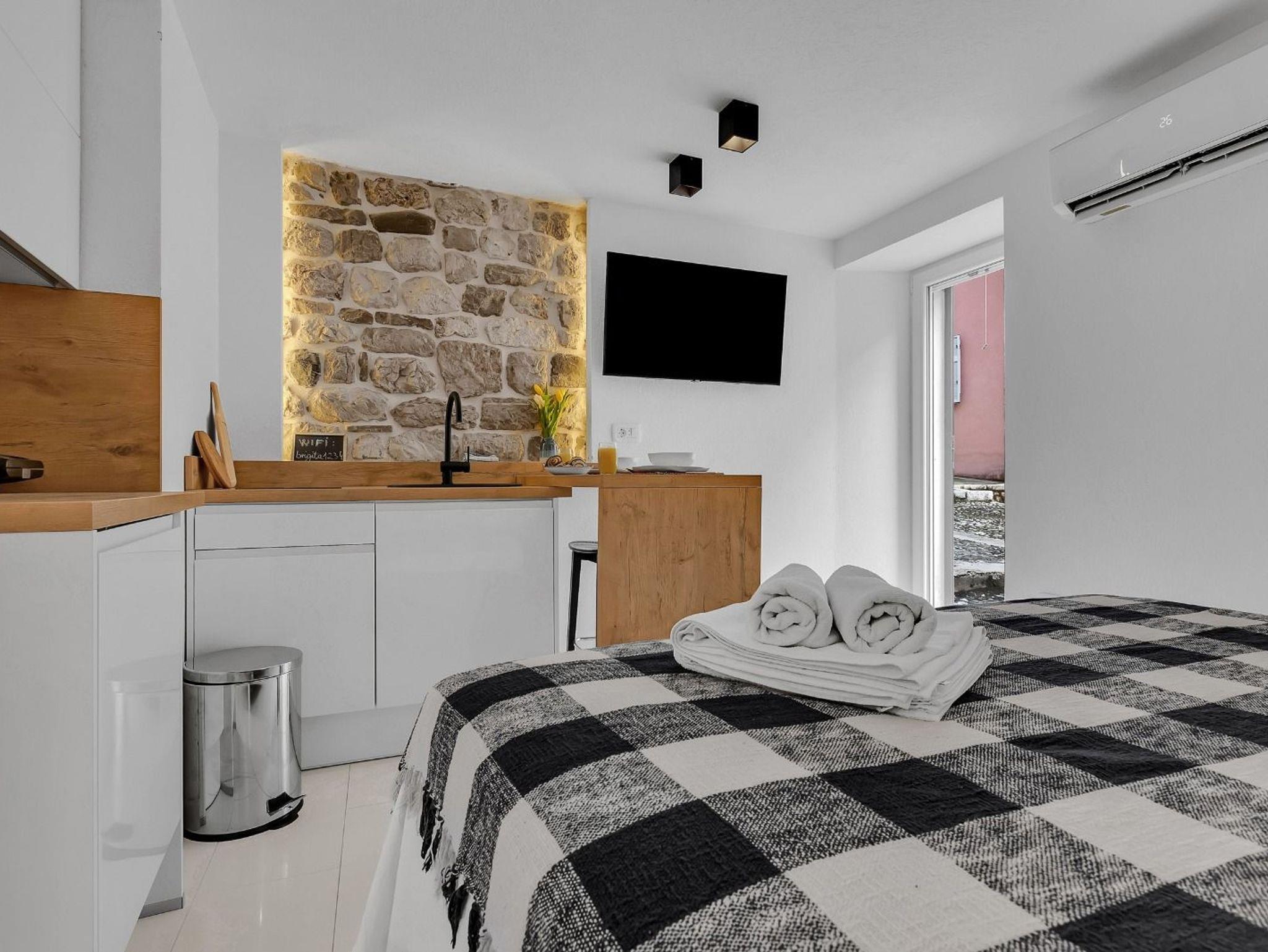 Studio bietet Platz für 2 Gäste. Die Betten sind in Schlafzimmern, die es 1 gibt, innerhalb einer Gesamtfläche von 23m2, angeordnet. Die Gäste haben eine eigene Terrasse zur Verfügung, auf der sie in warmen Sommernächten genießen können. IM PREIS INBEGRIFFEN: Kurtaxe, Endreinigung, Klimatisierung, Internet, Bügeleisen, Bügelbrett, Föhn. VERBINDLICHE ZUSÄTZLICHE KOSTEN: Aufzahlung für Kurzaufenthalte (prozentualer Zuschlag pro Nächtigungsanzahl: 30% - 1, 20% - 2, 10% - 3). Die Verfügbarkeit zusätzlicher Dienstleistungen in Ihrem reservierten Termin und die Preise derselben (falls nicht aufgeführt) müssen im Voraus überprüft werden. Zusätzliche Dienstleistungen die in der Zahlungsaufforderung nicht aufgeführt sind werden direkt beim Vermieter bezahlt, angenommen der Gast nutzt auch diese. Ermäßigung auf den Grundpreis: Gratistag 28=25 (bei einem Aufenthalt von 28 oder mehr Tagen erhalten Sie 3 kostenlose Tage für den Aufenthalt bis 31.12.26).