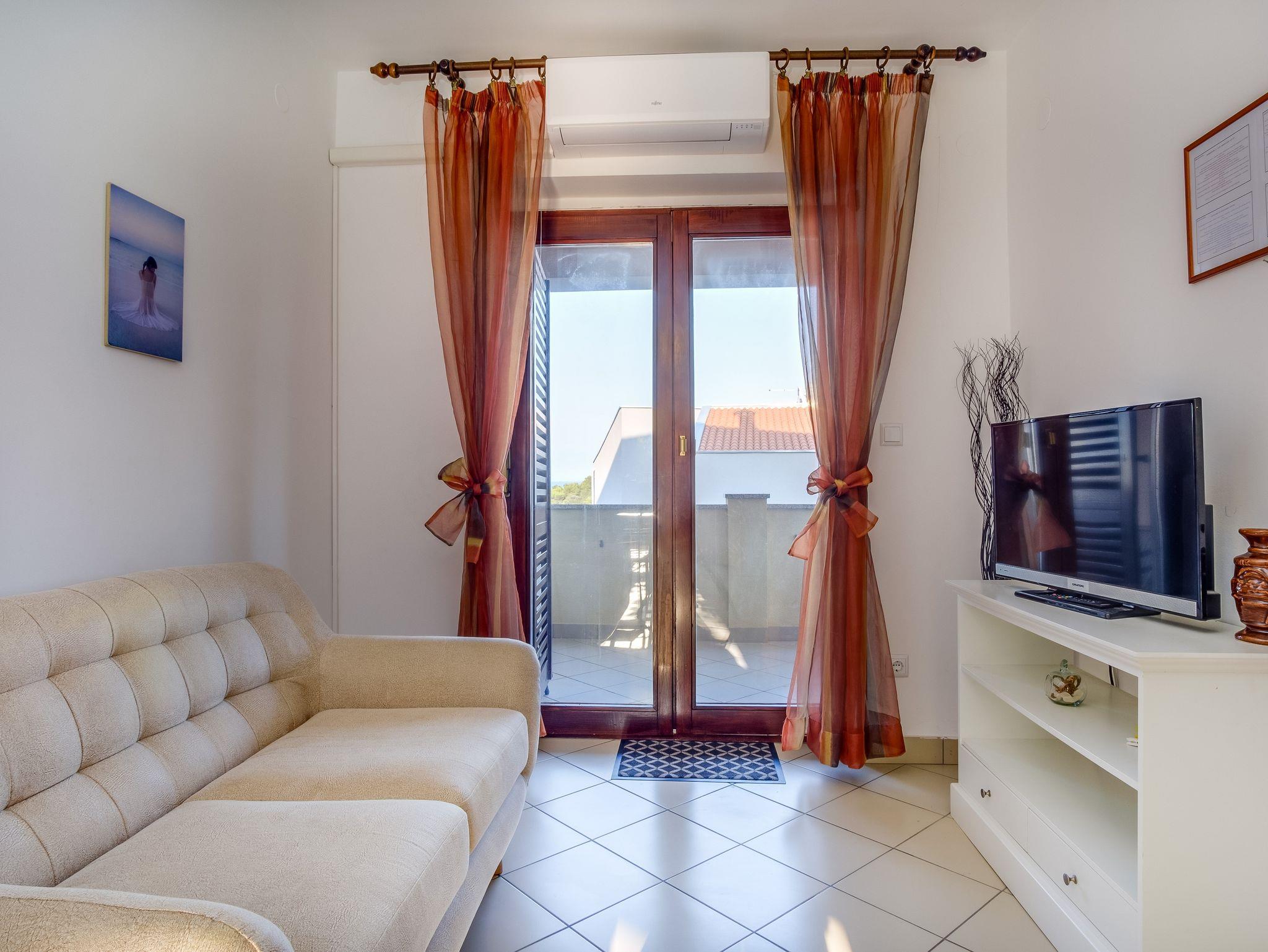 Ferienwohnung bietet Platz für 4 Gäste. Die Betten sind in Schlafzimmern, die es 2 gibt, innerhalb einer Gesamtfläche von 42m2, angeordnet. Die Gäste haben eine eigene Terrasse zur Verfügung, auf der sie in warmen Sommernächten genießen können. Das Apartment bietet Meerblick. Es ist erlaubt, Speisen auf dem Gemeinschafts-Grill vorzubereiten. IM PREIS INBEGRIFFEN: Kurtaxe, Endreinigung, Parkplatz, Internet. VERBINDLICHE ZUSÄTZLICHE KOSTEN: Aufzahlung für Kurzaufenthalte (prozentualer Zuschlag pro Nächtigungsanzahl: 30% - 1, 20% - 2, 10% - 3). UNVERBINDLICHE ZUSÄTZLICHE KOSTEN: Klimatisierung (5,00 € pro Nacht), Zusatzbett (7,00 € pro Nacht). Die Verfügbarkeit zusätzlicher Dienstleistungen in Ihrem reservierten Termin und die Preise derselben (falls nicht aufgeführt) müssen im Voraus überprüft werden. Zusätzliche Dienstleistungen die in der Zahlungsaufforderung nicht aufgeführt sind werden direkt beim Vermieter bezahlt, angenommen der Gast nutzt auch diese.