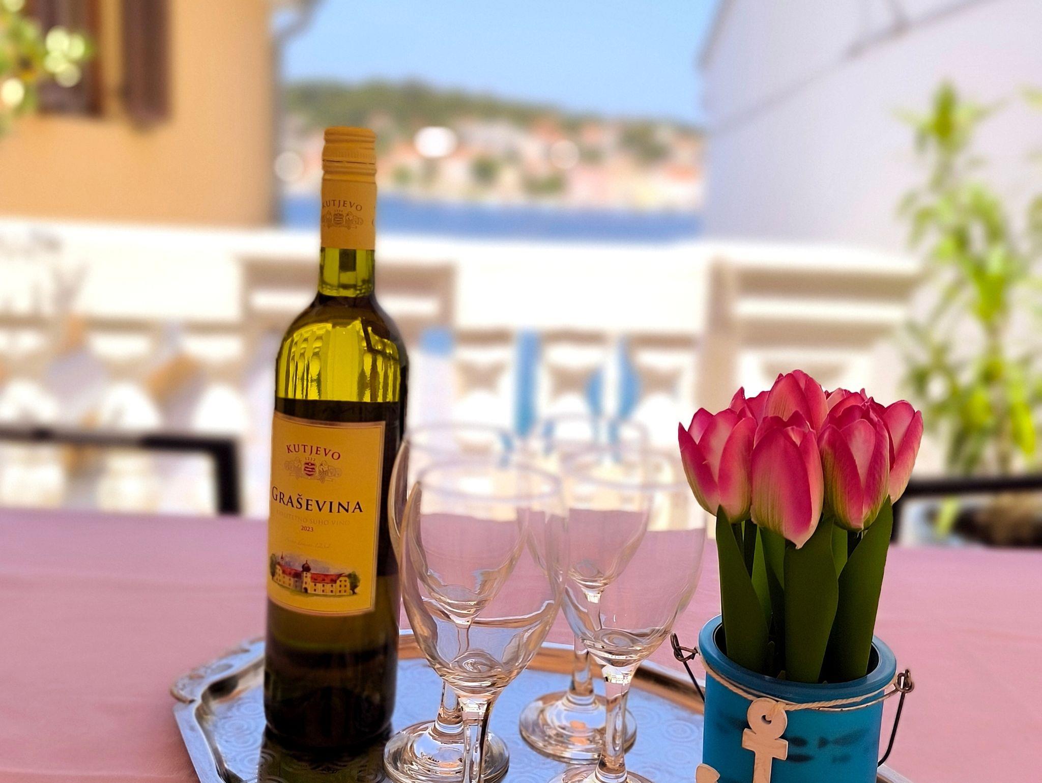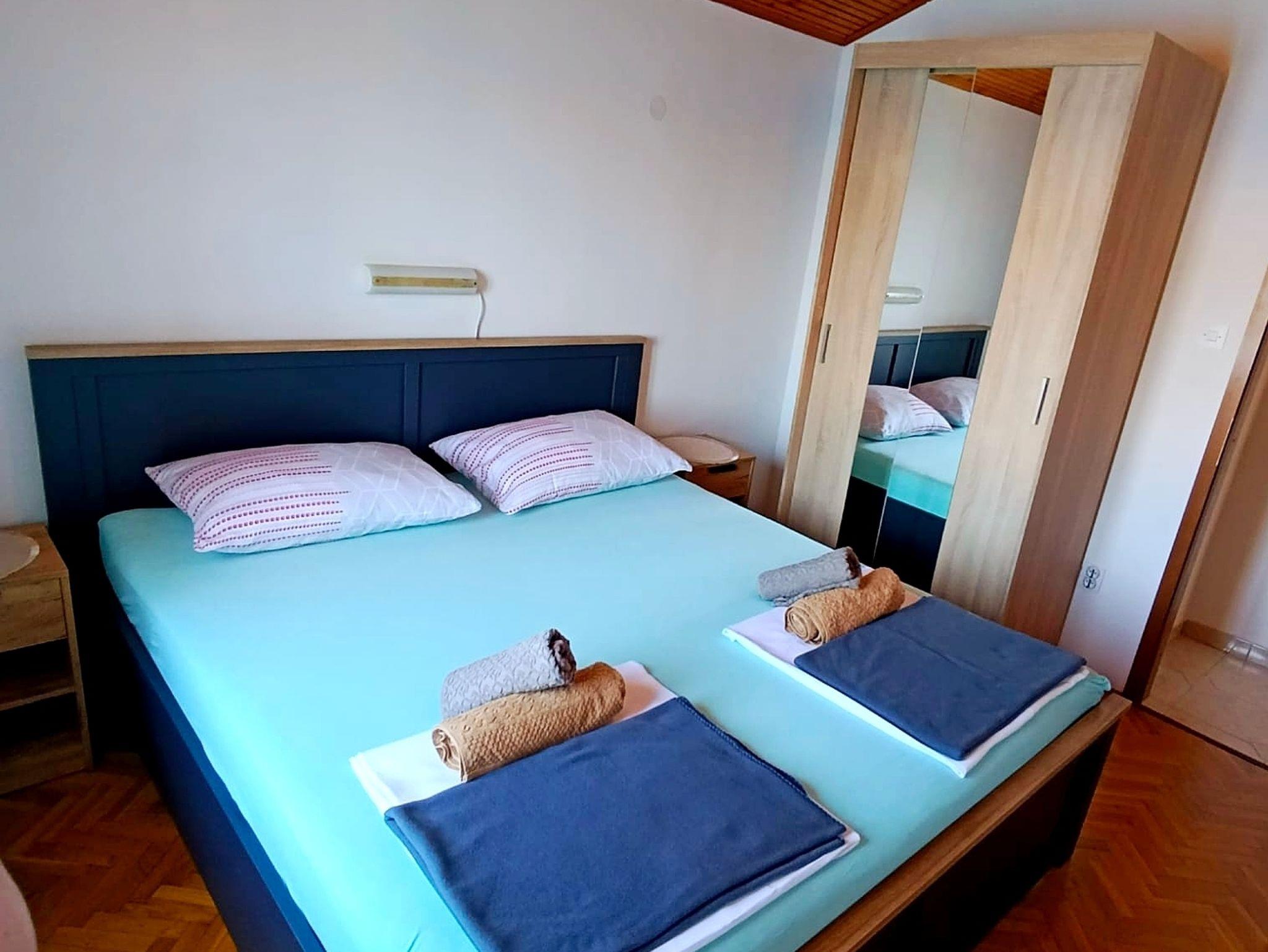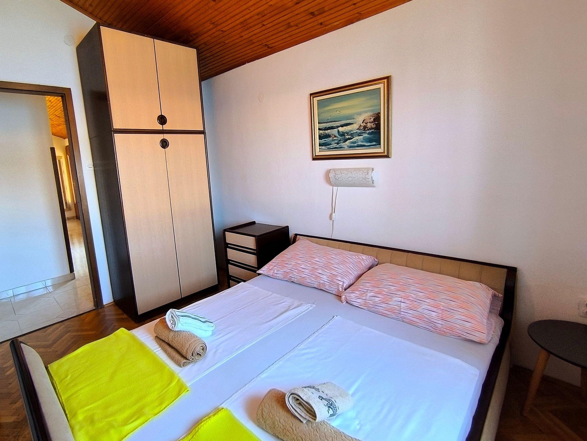 Ferienwohnung bietet Platz für 5 Gäste. Die Betten sind in Schlafzimmern, die es 3 gibt, innerhalb einer Gesamtfläche von 53m2, angeordnet. Die Gäste haben eine eigene Terrasse zur Verfügung, auf der sie in warmen Sommernächten genießen können. Das Apartment bietet Meerblick. IM PREIS INBEGRIFFEN: Kurtaxe, Endreinigung, Klimatisierung, Parkplatz, Internet, Bügeleisen, Bügelbrett, Föhn. VERBINDLICHE ZUSÄTZLICHE KOSTEN: Aufzahlung für Kurzaufenthalte (prozentualer Zuschlag pro Nächtigungsanzahl: 30% - 1, 20% - 2, 10% - 3). UNVERBINDLICHE ZUSÄTZLICHE KOSTEN: Bootsanlegeplatz (12,00 € pro Nacht). Die Verfügbarkeit zusätzlicher Dienstleistungen in Ihrem reservierten Termin und die Preise derselben (falls nicht aufgeführt) müssen im Voraus überprüft werden. Zusätzliche Dienstleistungen die in der Zahlungsaufforderung nicht aufgeführt sind werden direkt beim Vermieter bezahlt, angenommen der Gast nutzt auch diese. Ermäßigung auf den Grundpreis: Gratistag 28=25 (bei einem Aufenthalt von 28 oder mehr Tagen erhalten Sie 3 kostenlose Tage für den Aufenthalt bis 31.12.26).