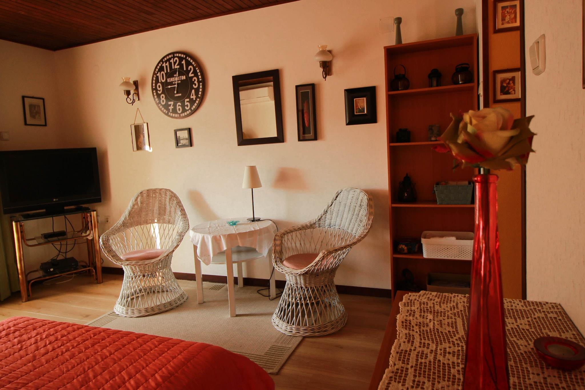 På 1. etage: (Køkken(enkeltsovesofa, Fjernsyn(fladskærm, parabol), spisebord, komfur, kaffemaskine, ovn, køle-fryseskab), soveværelse(dobbeltseng), badeværelse(bruser, håndvask, toilet), balkon) klimaanlæg, parkering