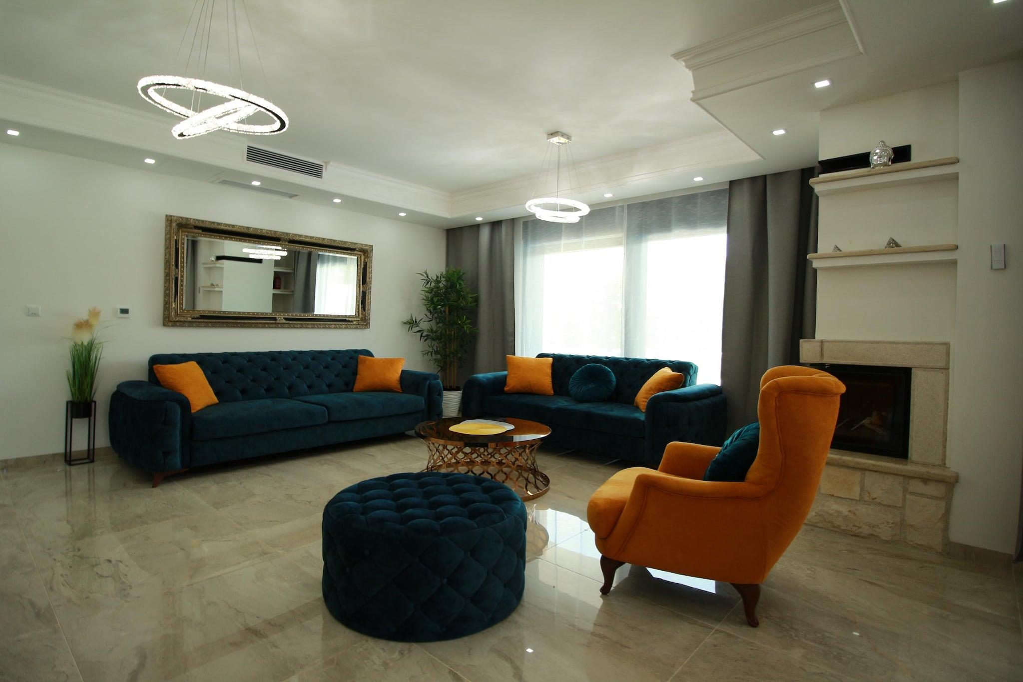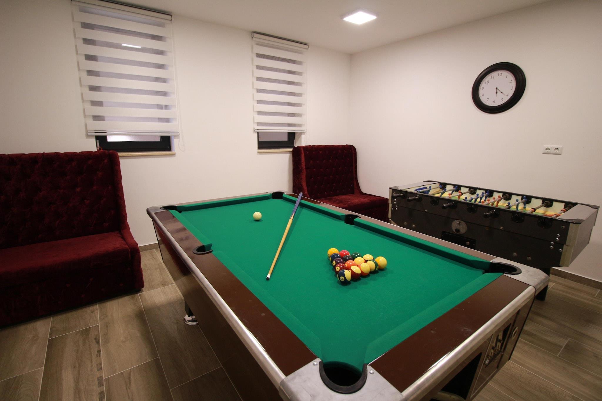 Stueetage: (Stue(Fjernsyn(fladskærm, parabol), pejs, sofahjørne), Køkken(spisebord, brødrister, komfur, kaffemaskine, ovn, mikrobølgeovn, opvaskemaskine , køle-fryseskab), soveværelse(dobbeltseng, Fjernsyn(fladskærm, parabol)), badeværelse(bruser, håndvask, toilet), terrasse(privat)) På 1. etage: (Soveværelse med badeværelse(dobbeltseng, Fjernsyn(fladskærm, parabol), bruser, håndvask, toilet), Soveværelse med badeværelse(dobbeltseng, Fjernsyn(fladskærm, parabol), bruser, håndvask, toilet), Soveværelse med badeværelse(dobbeltseng, Fjernsyn(fladskærm, parabol), bruser, håndvask, toilet), balkon) Kælderetage: (Soveværelse med badeværelse(dobbeltseng, bruser, håndvask, toilet), opholdsrum(Fjernsyn(fladskærm), sofahjørne, bordfodbold, biljard)) bruser, vaskemaskine, klimaanlæg, terrasse(privat), have(privat), havemøbler, solstole, grill, parkering, Parasol, swimmingpool(privat), strygebræt, strygejern, loungemøbler