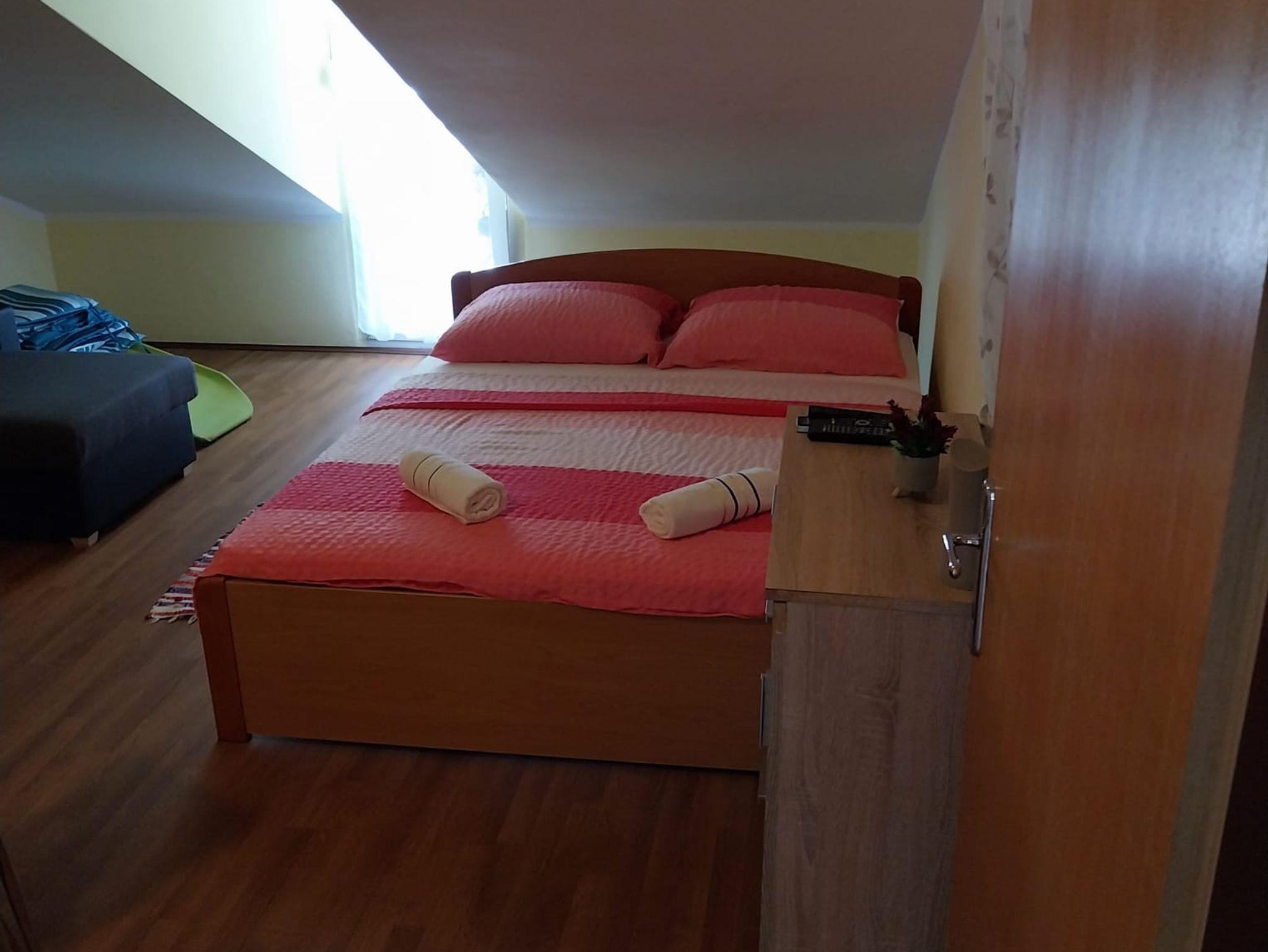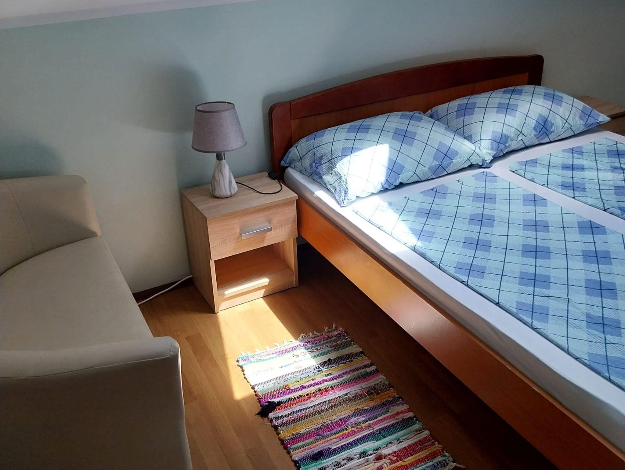 Ferienwohnung bietet Platz für 6 Gäste. Die Betten sind in Schlafzimmern, die es 1 gibt, und in Wohnzimmer, innerhalb einer Gesamtfläche von 40m2, angeordnet. Die Gäste haben eine eigene Terrasse zur Verfügung, auf der sie in warmen Sommernächten genießen können. IM PREIS INBEGRIFFEN: Kurtaxe, Endreinigung, Klimatisierung, Parkplatz, Internet, Bügeleisen, Bügelbrett, Föhn. VERBINDLICHE ZUSÄTZLICHE KOSTEN: Aufzahlung für Kurzaufenthalte (prozentualer Zuschlag pro Nächtigungsanzahl: 30% - 1, 20% - 2, 10% - 3). UNVERBINDLICHE ZUSÄTZLICHE KOSTEN: Wäschewaschen (7,00 € Waschen). Die Verfügbarkeit zusätzlicher Dienstleistungen in Ihrem reservierten Termin und die Preise derselben (falls nicht aufgeführt) müssen im Voraus überprüft werden. Zusätzliche Dienstleistungen die in der Zahlungsaufforderung nicht aufgeführt sind werden direkt beim Vermieter bezahlt, angenommen der Gast nutzt auch diese. Ermäßigung auf den Grundpreis: Gratistag 14=13 (bei einem Aufenthalt von 14 Tagen oder mehr erhalten Sie einen Gratistag für den Aufenthalt bis 31.12.26).