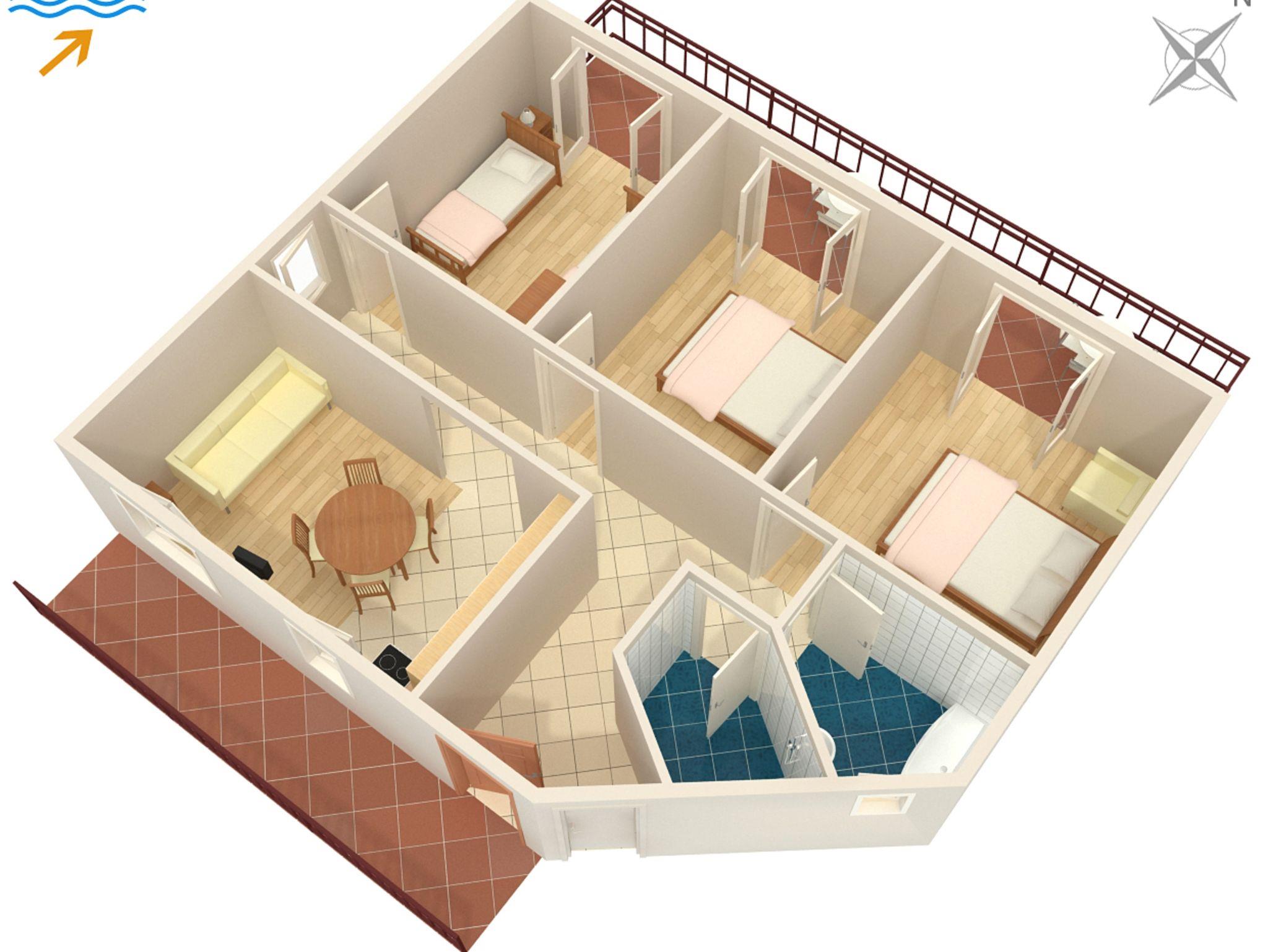 Ferienwohnung bietet Platz für 6 Gäste. Die Betten sind in Schlafzimmern, die es 3 gibt, innerhalb einer Gesamtfläche von 65m2, angeordnet. Die Gäste haben einen eigenen Balkon zur Verfügung, auf der sie in warmen Sommernächten genießen können. Es ist erlaubt, Speisen auf dem Gemeinschafts-Grill vorzubereiten. IM PREIS INBEGRIFFEN: Kurtaxe, Endreinigung, Klimatisierung, Parkplatz, Internet, Kinderbett, Bügeleisen, Bügelbrett. VERBINDLICHE ZUSÄTZLICHE KOSTEN: Aufzahlung für Kurzaufenthalte (prozentualer Zuschlag pro Nächtigungsanzahl: 30% - 1, 20% - 2, 10% - 3). UNVERBINDLICHE ZUSÄTZLICHE KOSTEN: Zusatzbett (20,00 € pro Nacht). Die Verfügbarkeit zusätzlicher Dienstleistungen in Ihrem reservierten Termin und die Preise derselben (falls nicht aufgeführt) müssen im Voraus überprüft werden. Zusätzliche Dienstleistungen die in der Zahlungsaufforderung nicht aufgeführt sind werden direkt beim Vermieter bezahlt, angenommen der Gast nutzt auch diese. Ermäßigung auf den Grundpreis: Gratistag 14=13 (bei einem Aufenthalt von 14 Tagen oder mehr erhalten Sie einen Gratistag für den Aufenthalt bis 31.12.26).