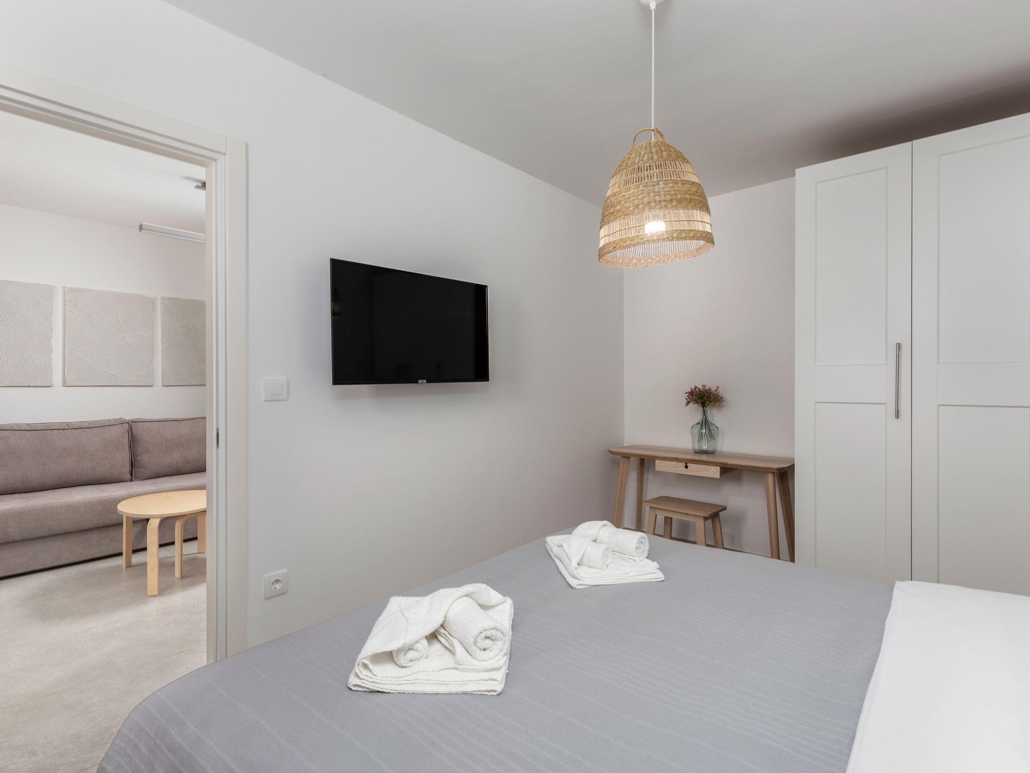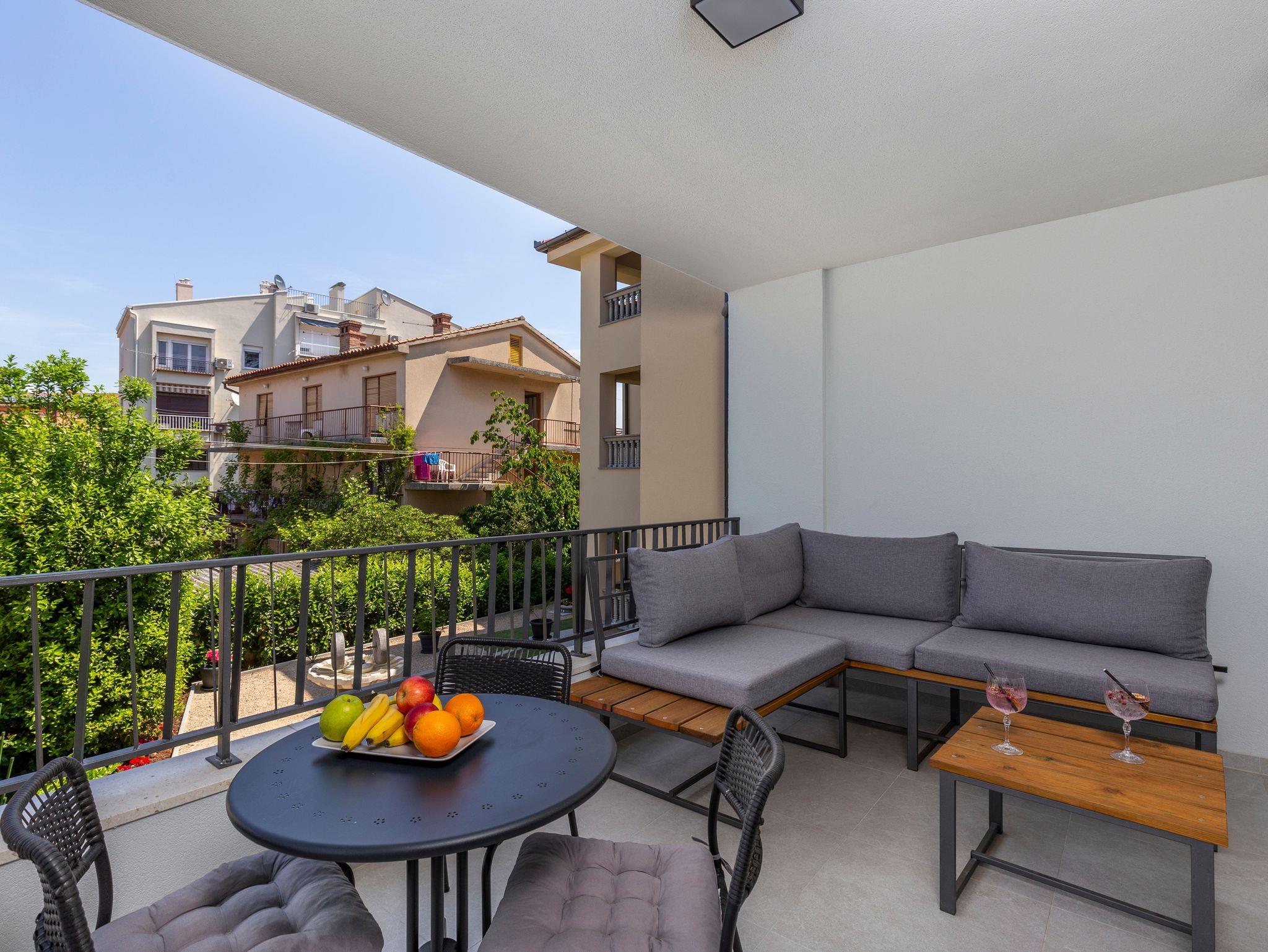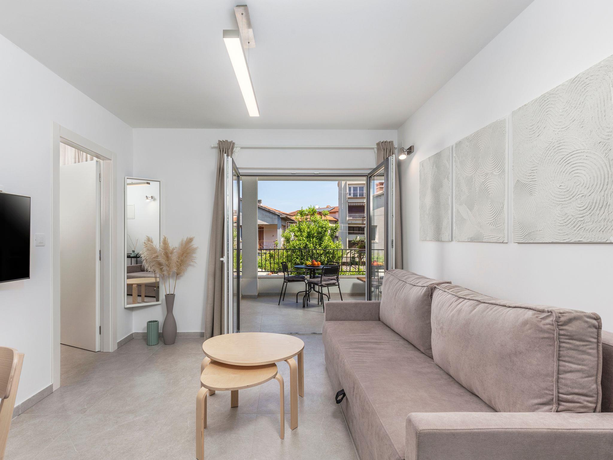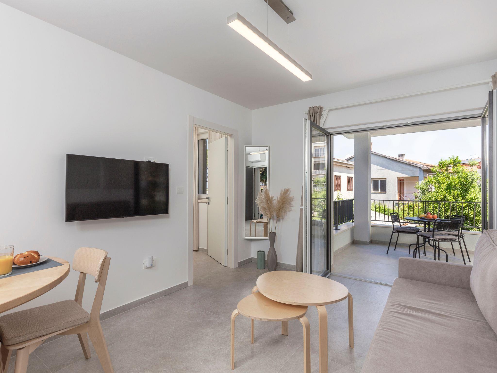 Ferienwohnung bietet Platz für 3 Gäste. Die Betten sind in Schlafzimmern, die es 1 gibt, und in Wohnzimmer, innerhalb einer Gesamtfläche von 34m2, angeordnet. Die Gäste haben eine eigene Terrasse zur Verfügung, auf der sie in warmen Sommernächten genießen können. Das Apartment bietet Meerblick. In der Unterkunftseinheit besteht die Möglichkeit des Mitbringens von Haustieren gegen Aufpreis. IM PREIS INBEGRIFFEN: Kurtaxe, Endreinigung, Klimatisierung, Parkplatz, Internet, Kinderbett, Föhn. VERBINDLICHE ZUSÄTZLICHE KOSTEN: Aufzahlung für Kurzaufenthalte (prozentualer Zuschlag pro Nächtigungsanzahl: 30% - 1, 20% - 2, 10% - 3). UNVERBINDLICHE ZUSÄTZLICHE KOSTEN: Haustiere (15,00 € pro Nacht), Zusatzbett (10,00 € pro Nacht). Die Verfügbarkeit zusätzlicher Dienstleistungen in Ihrem reservierten Termin und die Preise derselben (falls nicht aufgeführt) müssen im Voraus überprüft werden. Zusätzliche Dienstleistungen die in der Zahlungsaufforderung nicht aufgeführt sind werden direkt beim Vermieter bezahlt, angenommen der Gast nutzt auch diese.