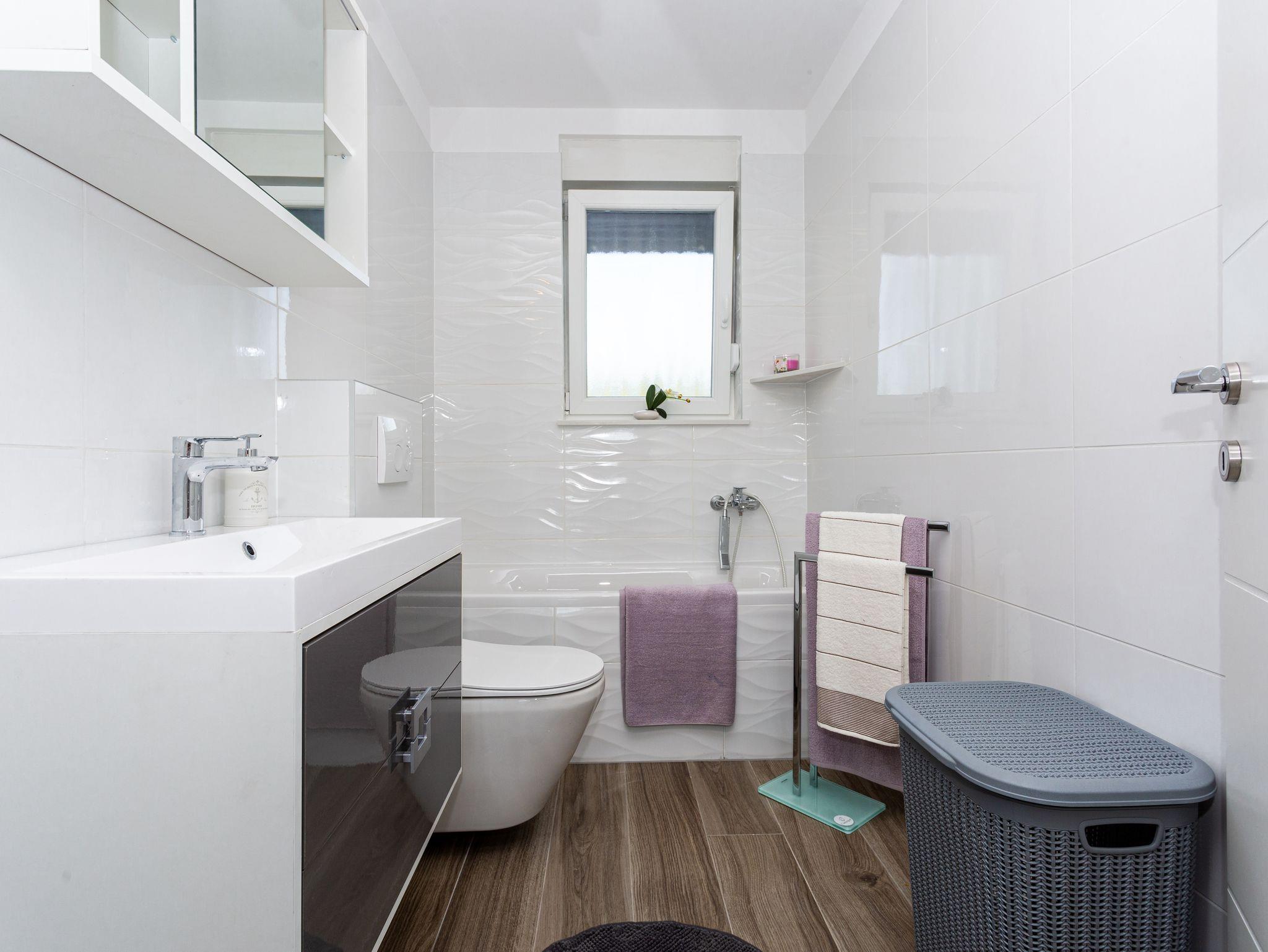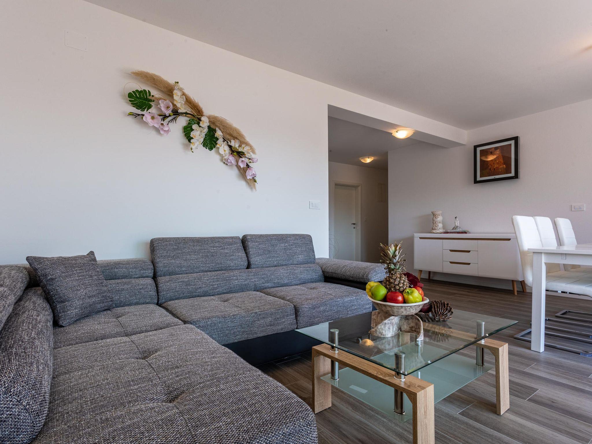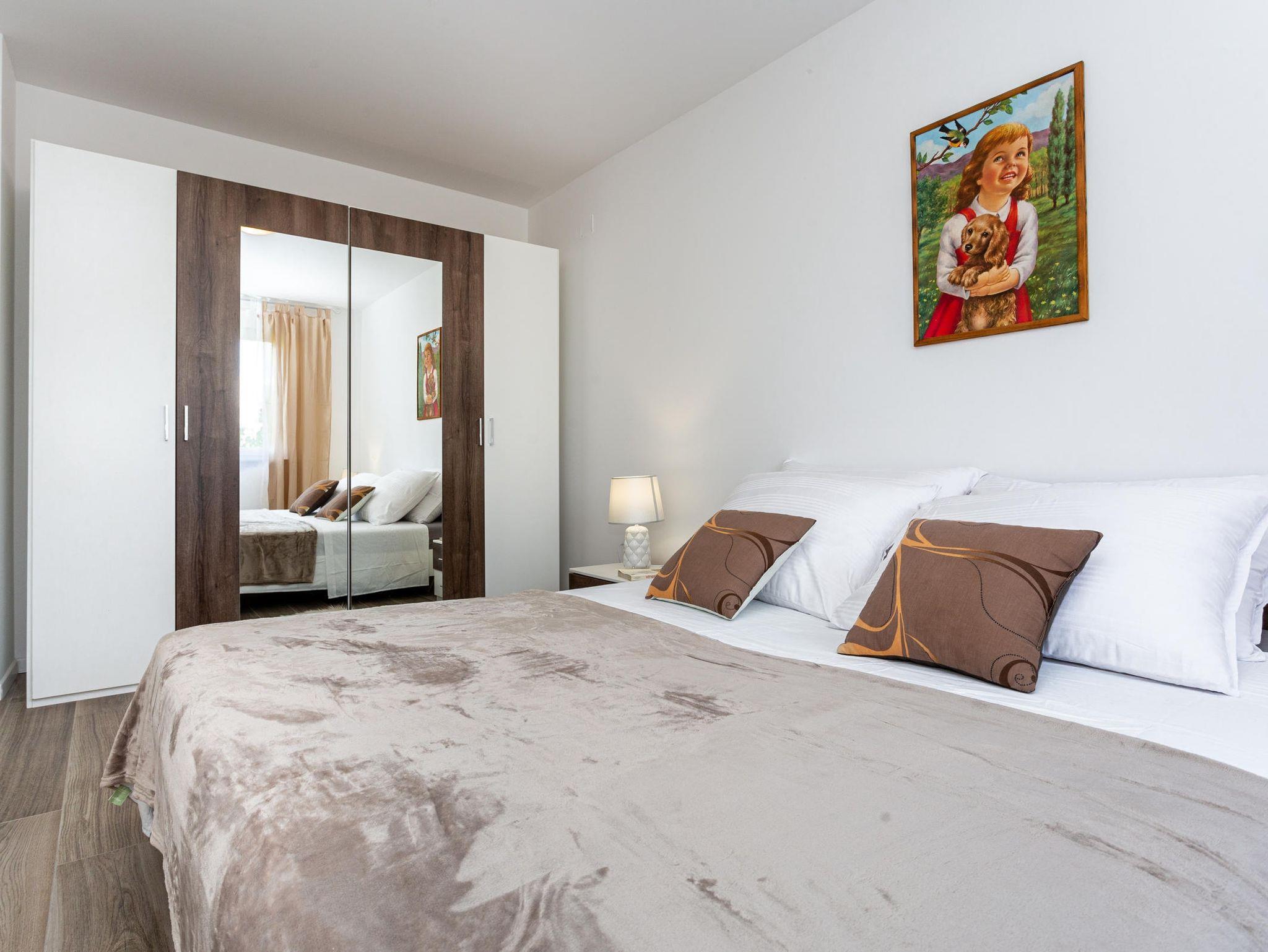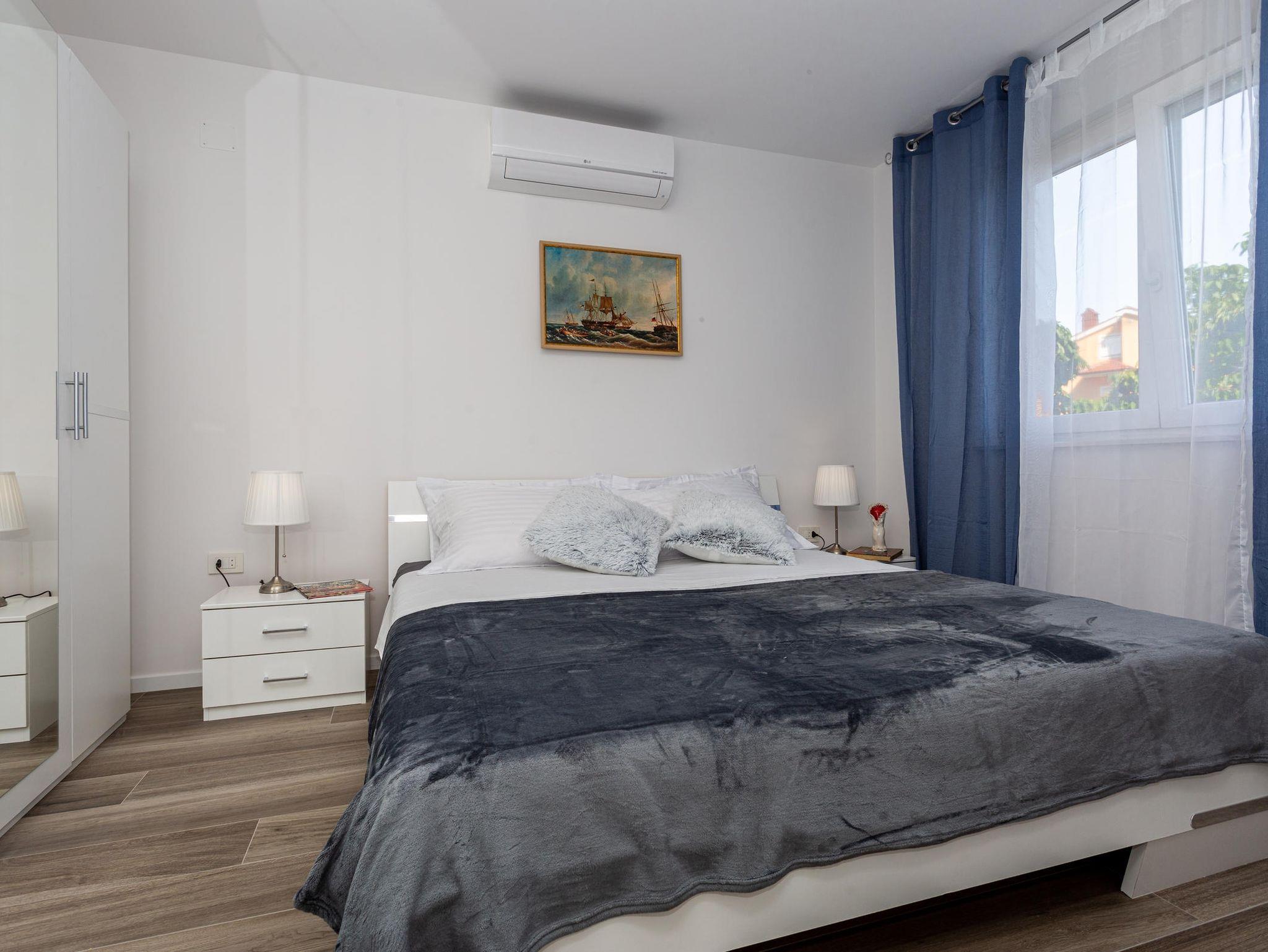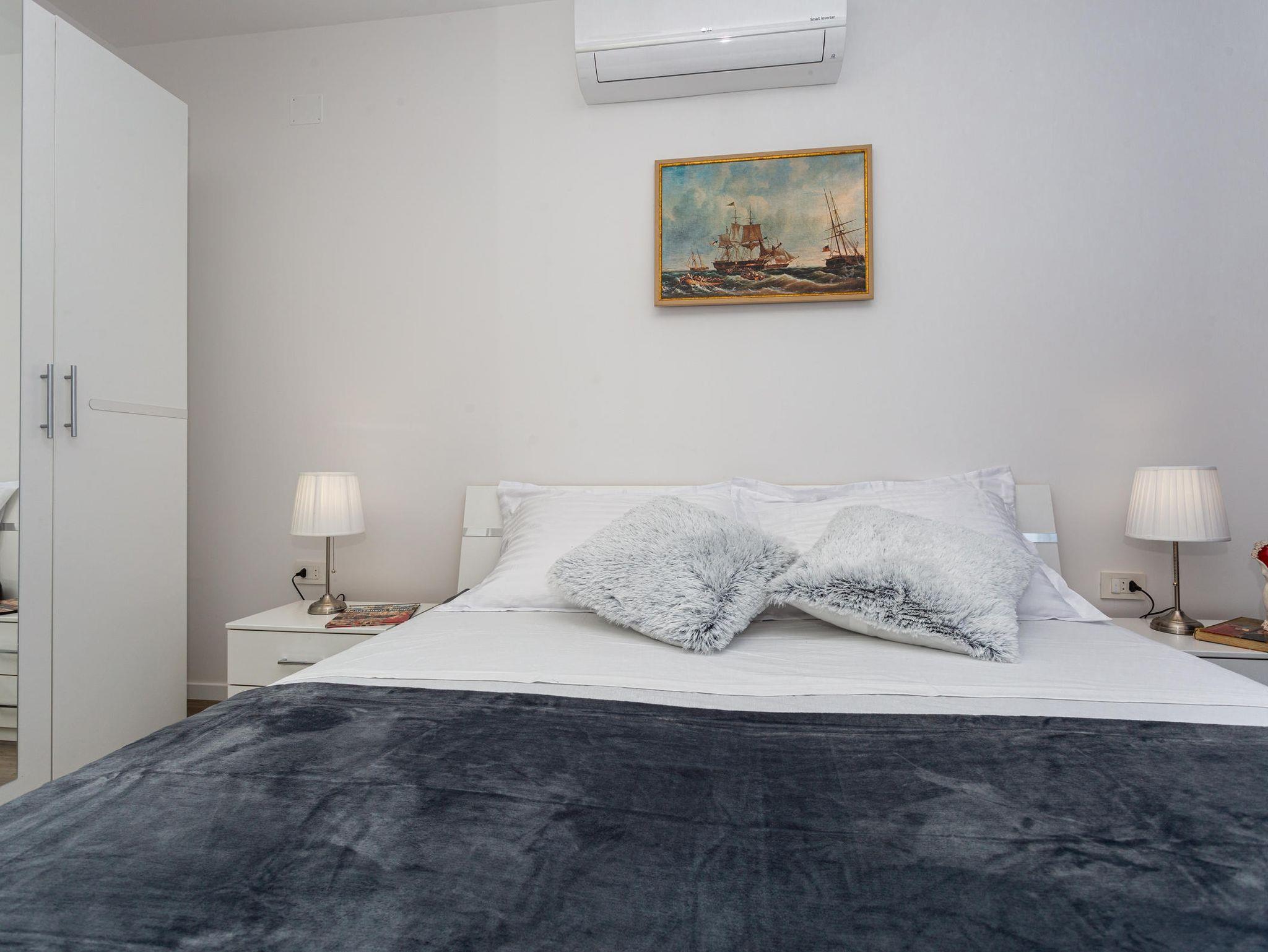 Ferienwohnung bietet Platz für 5 Gäste. Die Betten sind in Schlafzimmern, die es 2 gibt, und in Wohnzimmer, innerhalb einer Gesamtfläche von 76m2, angeordnet. Die Gäste haben eine eigene Terrasse zur Verfügung, auf der sie in warmen Sommernächten genießen können. Das Apartment bietet Meerblick. Es ist erlaubt, Speisen auf dem Gemeinschafts-Grill vorzubereiten. In der Unterkunftseinheit besteht die Möglichkeit des Mitbringens von Haustieren gegen Aufpreis. IM PREIS INBEGRIFFEN: Kurtaxe, Endreinigung, Klimatisierung, Parkplatz, Internet, Bügeleisen, Föhn. VERBINDLICHE ZUSÄTZLICHE KOSTEN: Aufzahlung für Kurzaufenthalte (prozentualer Zuschlag pro Nächtigungsanzahl: 30% - 1, 20% - 2, 10% - 3). UNVERBINDLICHE ZUSÄTZLICHE KOSTEN: Haustiere (15,00 € pro Nacht). Die Verfügbarkeit zusätzlicher Dienstleistungen in Ihrem reservierten Termin und die Preise derselben (falls nicht aufgeführt) müssen im Voraus überprüft werden. Zusätzliche Dienstleistungen die in der Zahlungsaufforderung nicht aufgeführt sind werden direkt beim Vermieter bezahlt, angenommen der Gast nutzt auch diese.