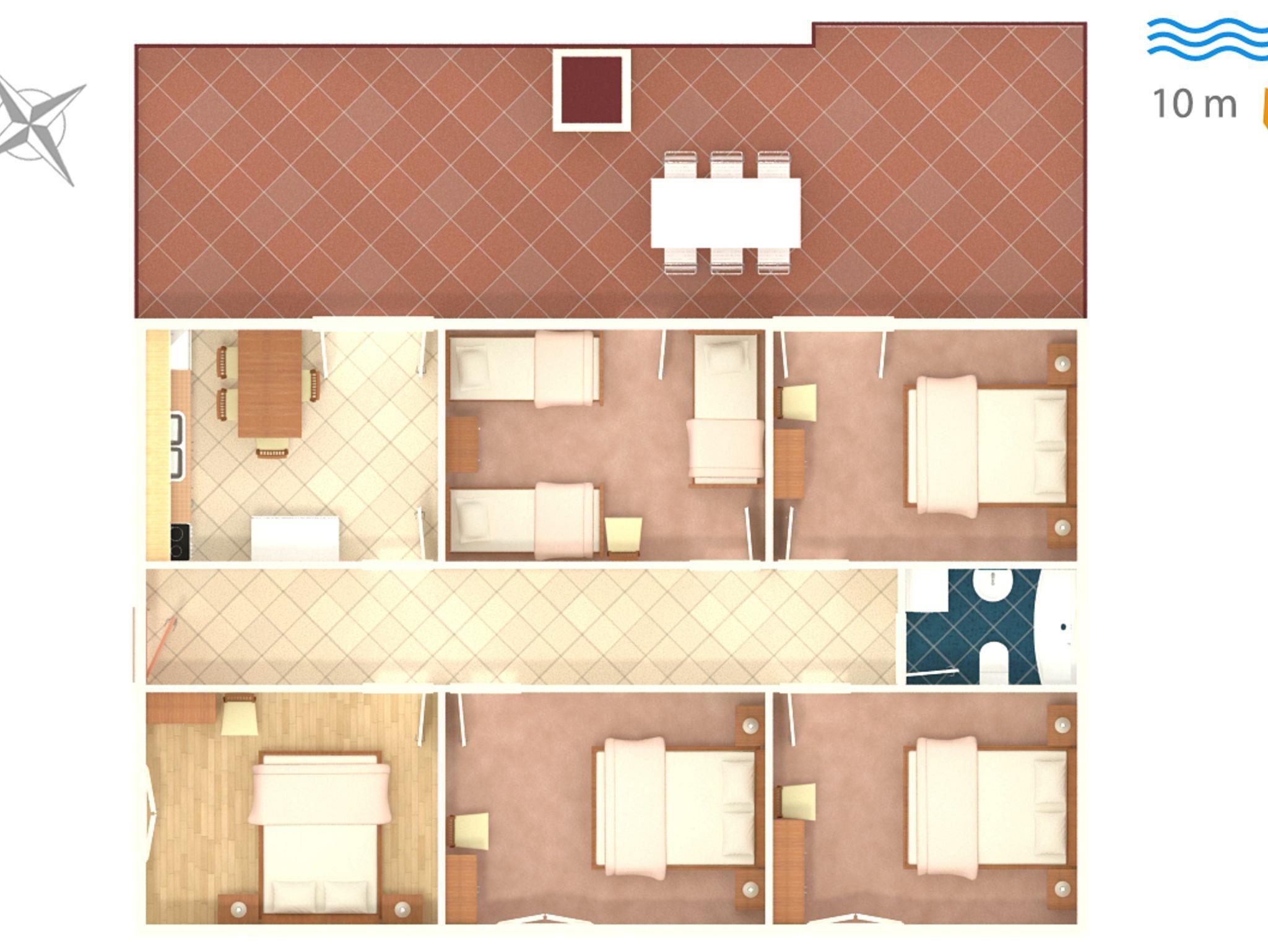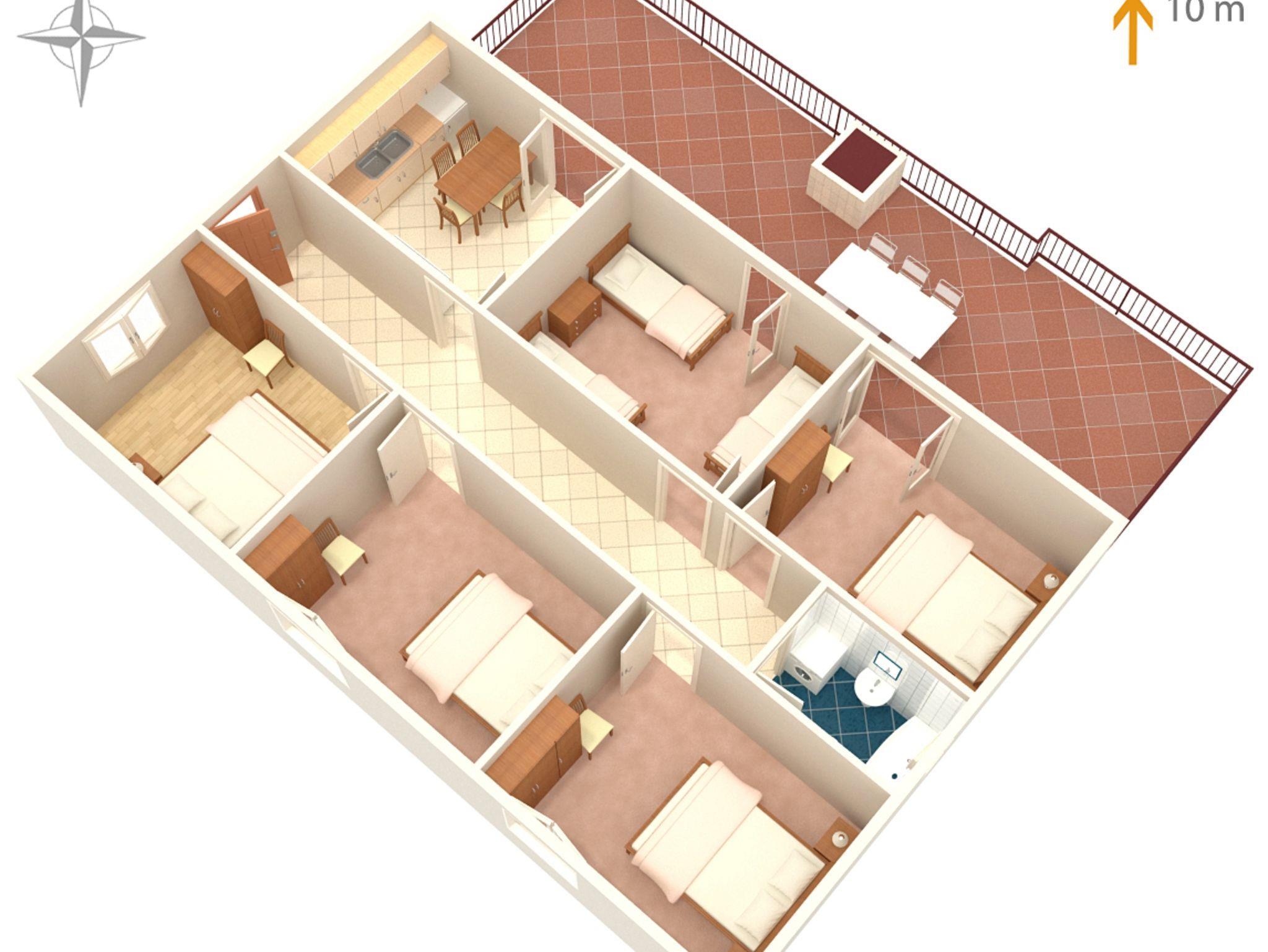 Ferienwohnung bietet Platz für 10 Gäste. Die Betten sind in Schlafzimmern, die es 5 gibt, innerhalb einer Gesamtfläche von 78m2, angeordnet. Die Gäste haben eine eigene Terrasse zur Verfügung, auf der sie in warmen Sommernächten genießen können. Das Apartment bietet Meerblick. Es ist erlaubt, Speisen auf dem Gemeinschafts-Grill vorzubereiten. IM PREIS INBEGRIFFEN: Kurtaxe, Endreinigung, Parkplatz, Internet. VERBINDLICHE ZUSÄTZLICHE KOSTEN: Aufzahlung für Kurzaufenthalte (prozentualer Zuschlag pro Nächtigungsanzahl: 30% - 1, 20% - 2, 10% - 3). UNVERBINDLICHE ZUSÄTZLICHE KOSTEN: Klimatisierung (5,00 € pro Nacht). Die Verfügbarkeit zusätzlicher Dienstleistungen in Ihrem reservierten Termin und die Preise derselben (falls nicht aufgeführt) müssen im Voraus überprüft werden. Zusätzliche Dienstleistungen die in der Zahlungsaufforderung nicht aufgeführt sind werden direkt beim Vermieter bezahlt, angenommen der Gast nutzt auch diese.