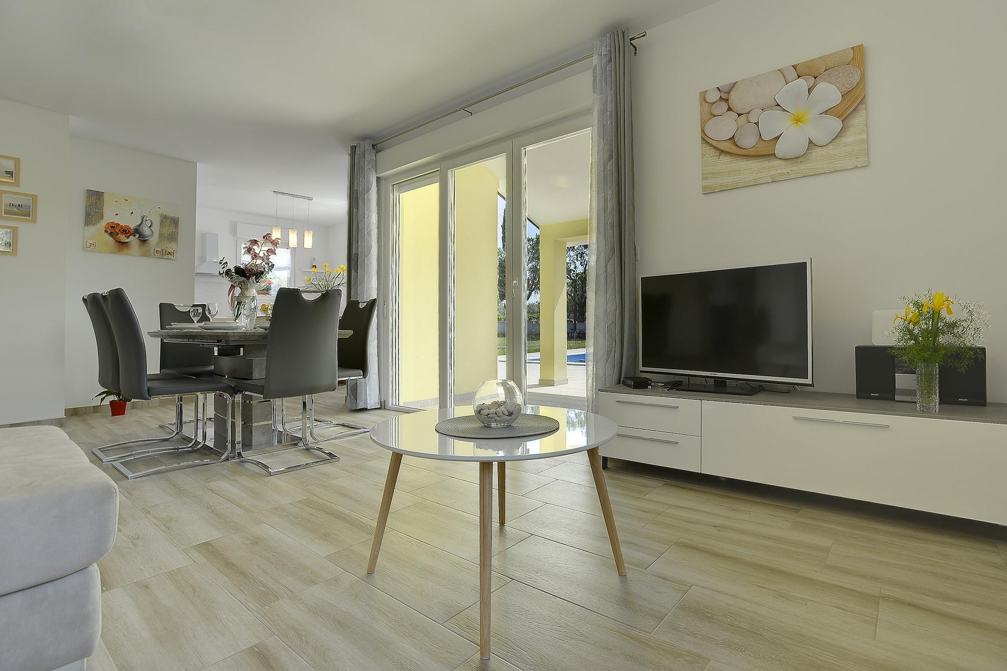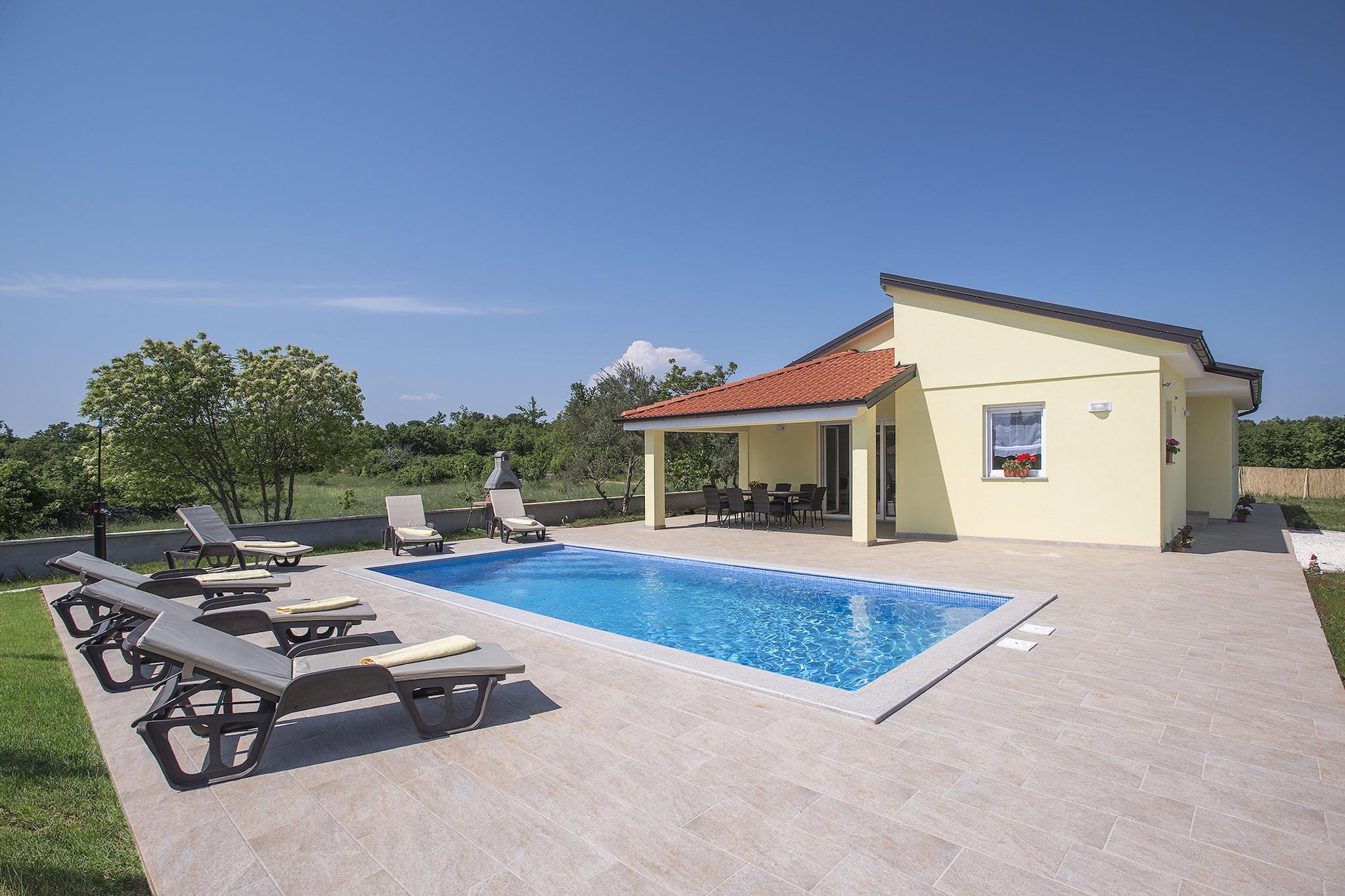 Denne moderne en-etages villa med swimmingpool er omgivet af natur og ligger i den rolige landsby Filipana nær Marcana. Den nærmeste strand er 10 km væk. I den vedlagte have finder du swimmingpoolen med en solterrasse, hvor du kan nyde dit privatliv. Børnene kan underholde sig på sving eller på trampolin. Der er også en overdækket terrasse med et spisebord, hvor du kan tilbringe aftenen grillning mens du nyder et glas fin istrisk vin. Villaen er velplejet og smagfuldt indrettet. Du har til din rådighed en stue med opholdsområde, et åbent køkken med spisebord, tre soveværelser, to badeværelser og et separat toilet.