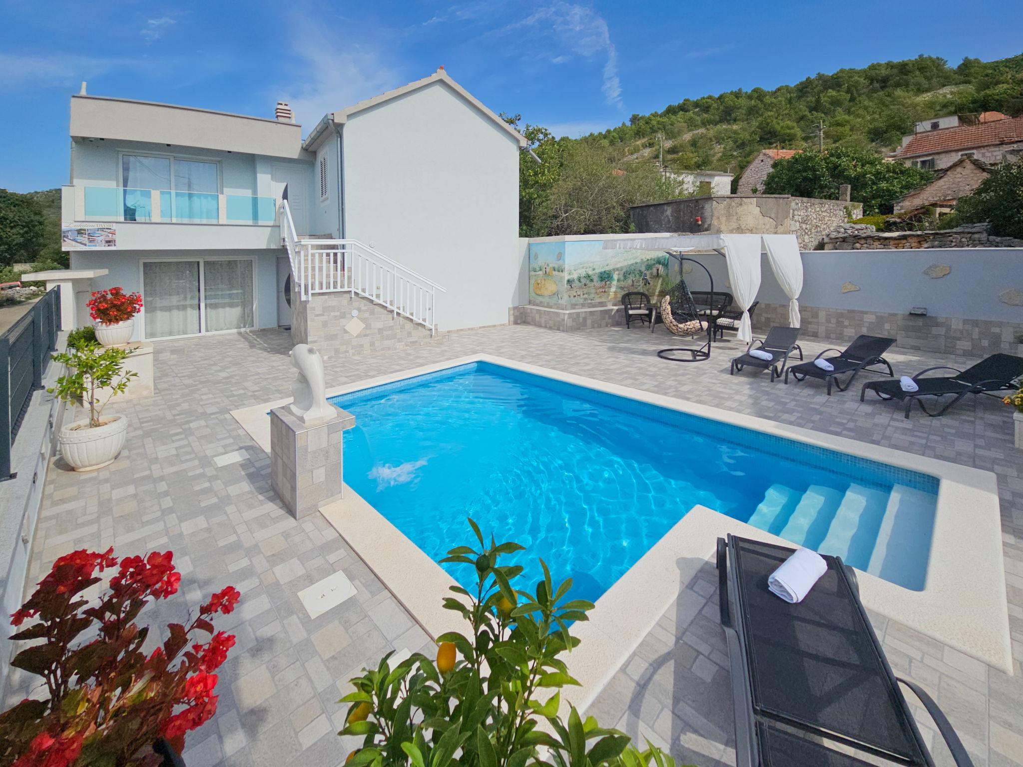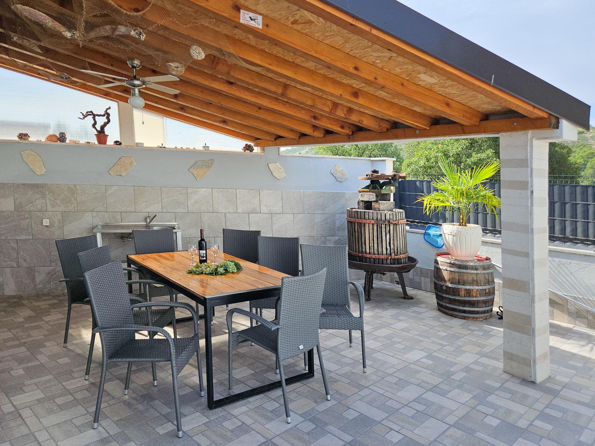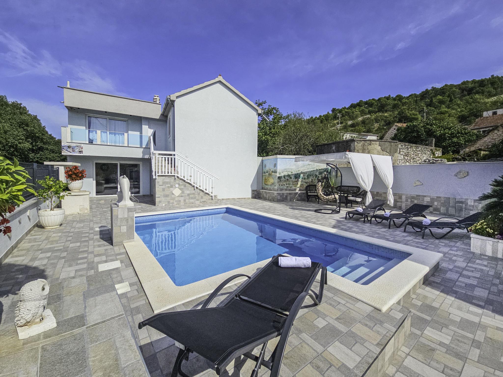Single-family house "Vinovac". In the hamlet Vinovac 11 km from the centre of Marina, in a quiet, sunny position, 11 km from the sea. Private: property 400 m2 (fenced), swimming pool angular (6 x 3 m, 20 m2, depth 150 cm, seasonal availability: 01.May. - 01.Oct.) with internal staircase. Outdoor shower, terrace (150 m2), garden furniture, barbecue house, pool maintenance by the owner/gardener. In the house: internet access, washing machine. Parking (for 2 cars) at the house on the premises. Shop 11 km, restaurant 11 km, bus stop 100 m, pebble beach 11 km, rocky beach 11 km. Marina 11 km, tennis 20 km.