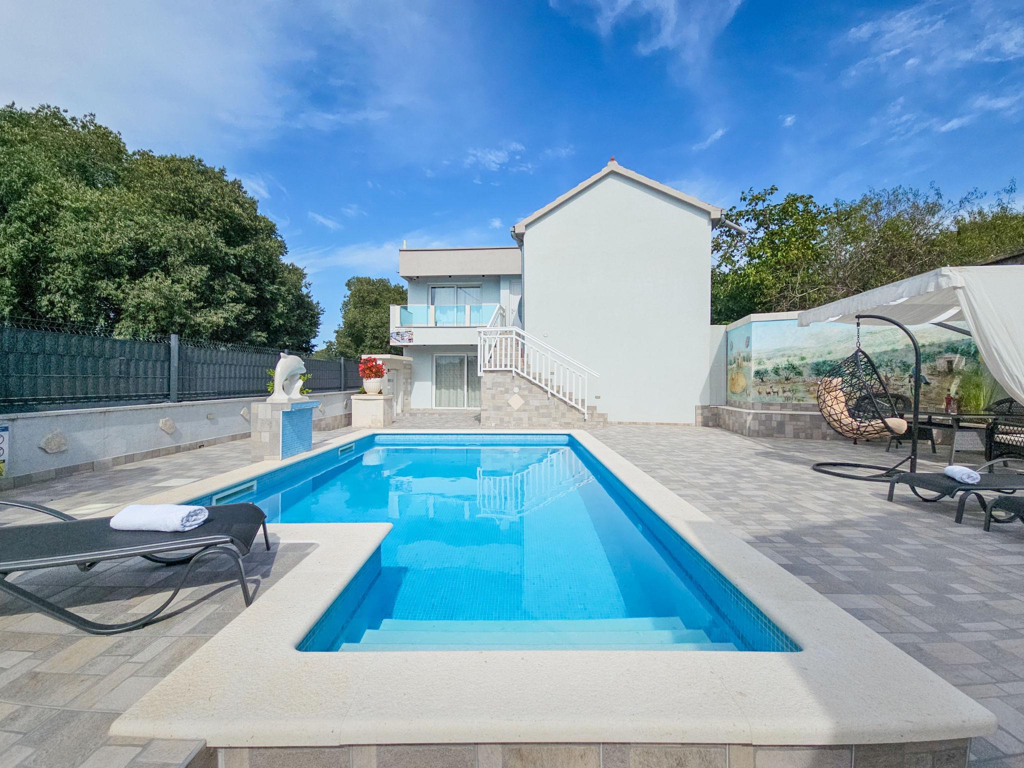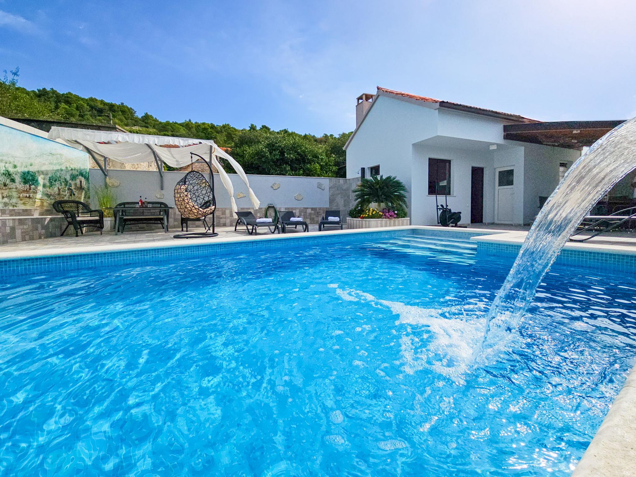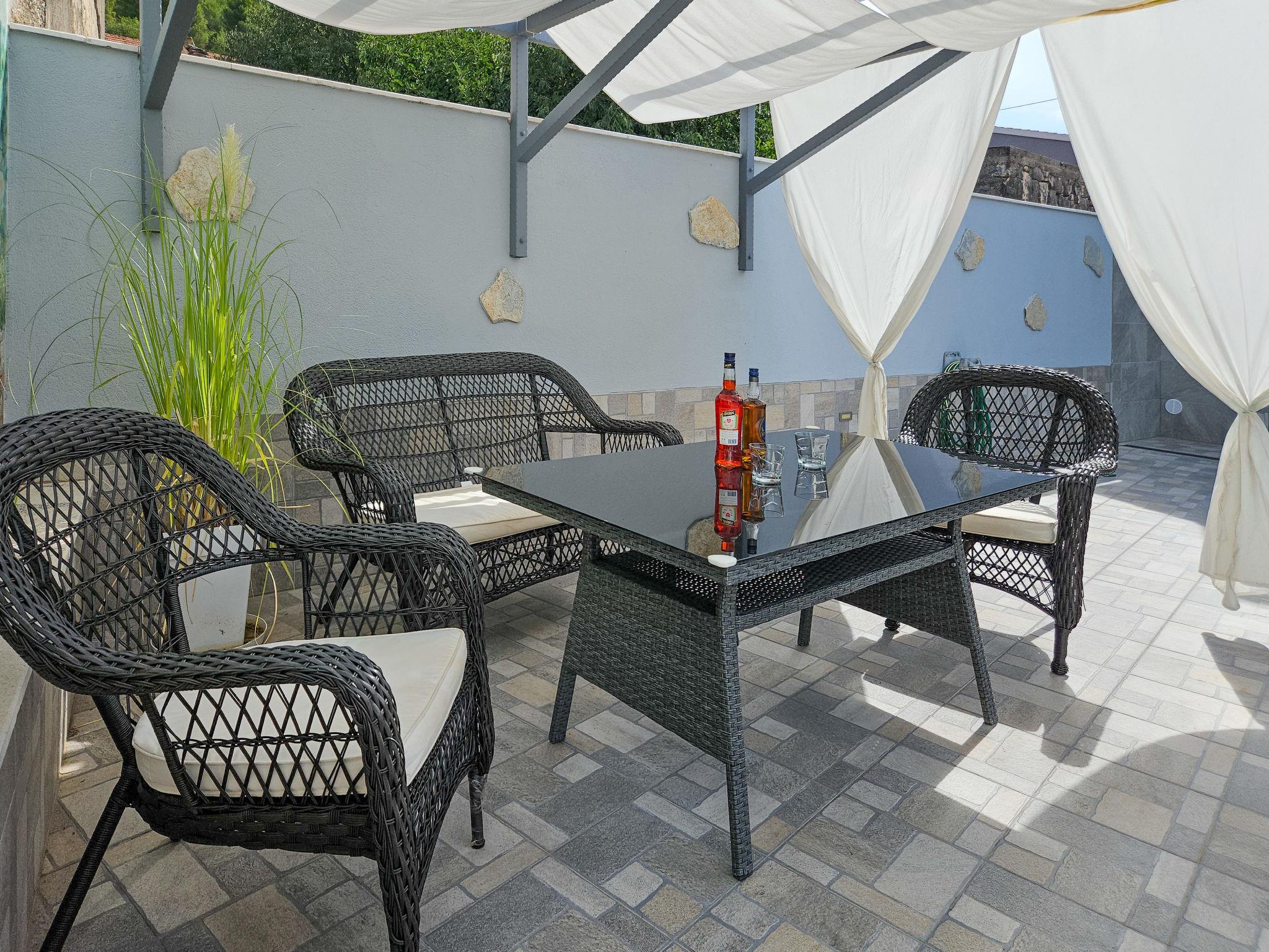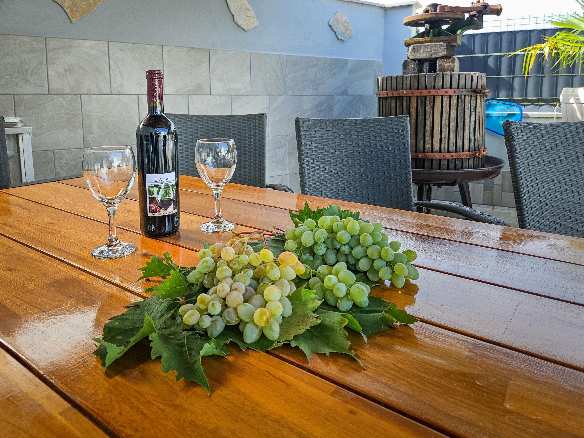 Single-family house "Vinovac". In the hamlet Vinovac 11 km from the centre of Marina, in a quiet, sunny position, 11 km from the sea. Private: property 400 m2 (fenced), swimming pool angular (6 x 3 m, 20 m2, depth 150 cm, seasonal availability: 01.May. - 01.Oct.) with internal staircase. Outdoor shower, terrace (150 m2), garden furniture, barbecue house, pool maintenance by the owner/gardener. In the house: internet access, washing machine. Parking (for 2 cars) at the house on the premises. Shop 11 km, restaurant 11 km, bus stop 100 m, pebble beach 11 km, rocky beach 11 km. Marina 11 km, tennis 20 km.