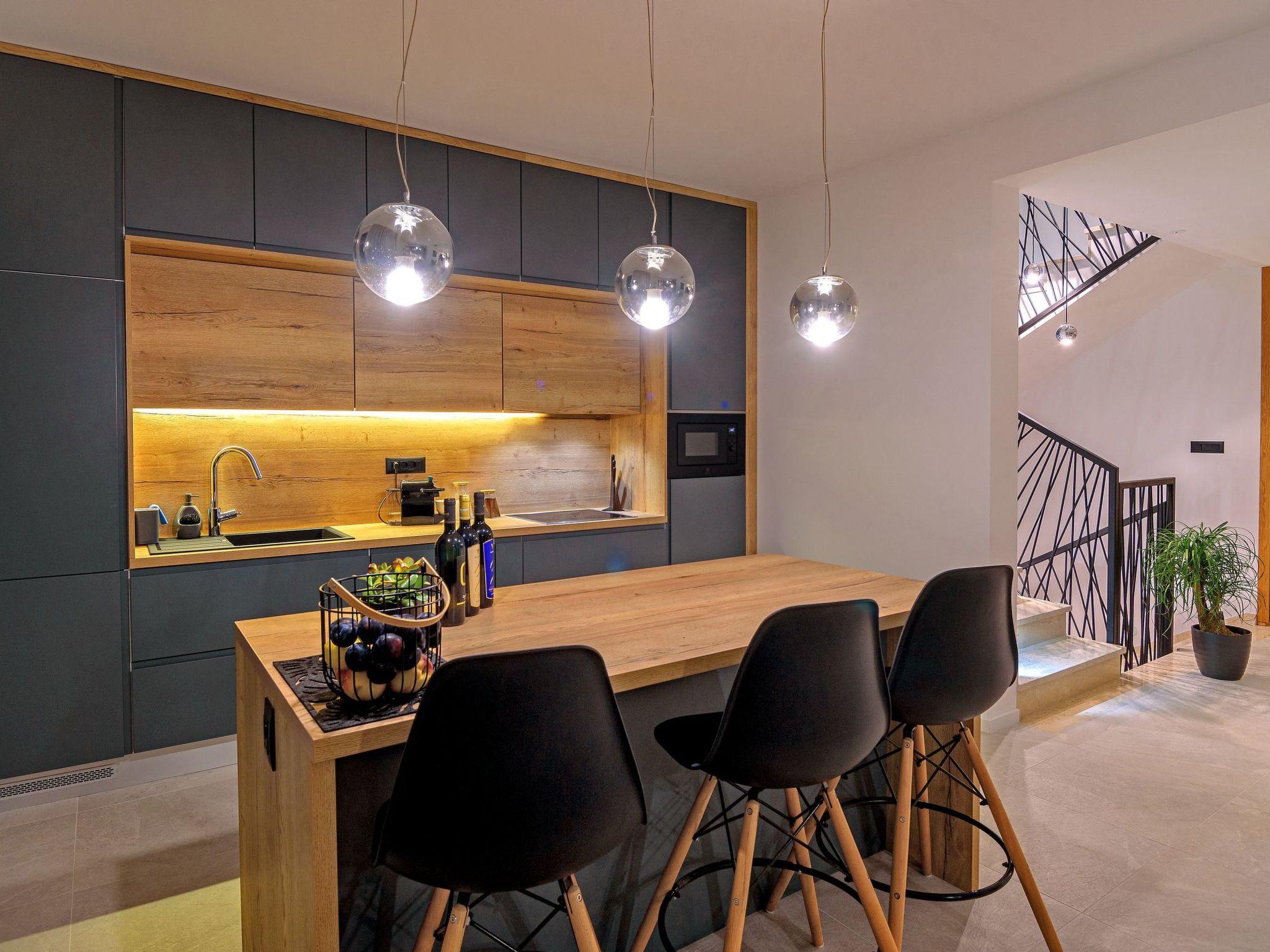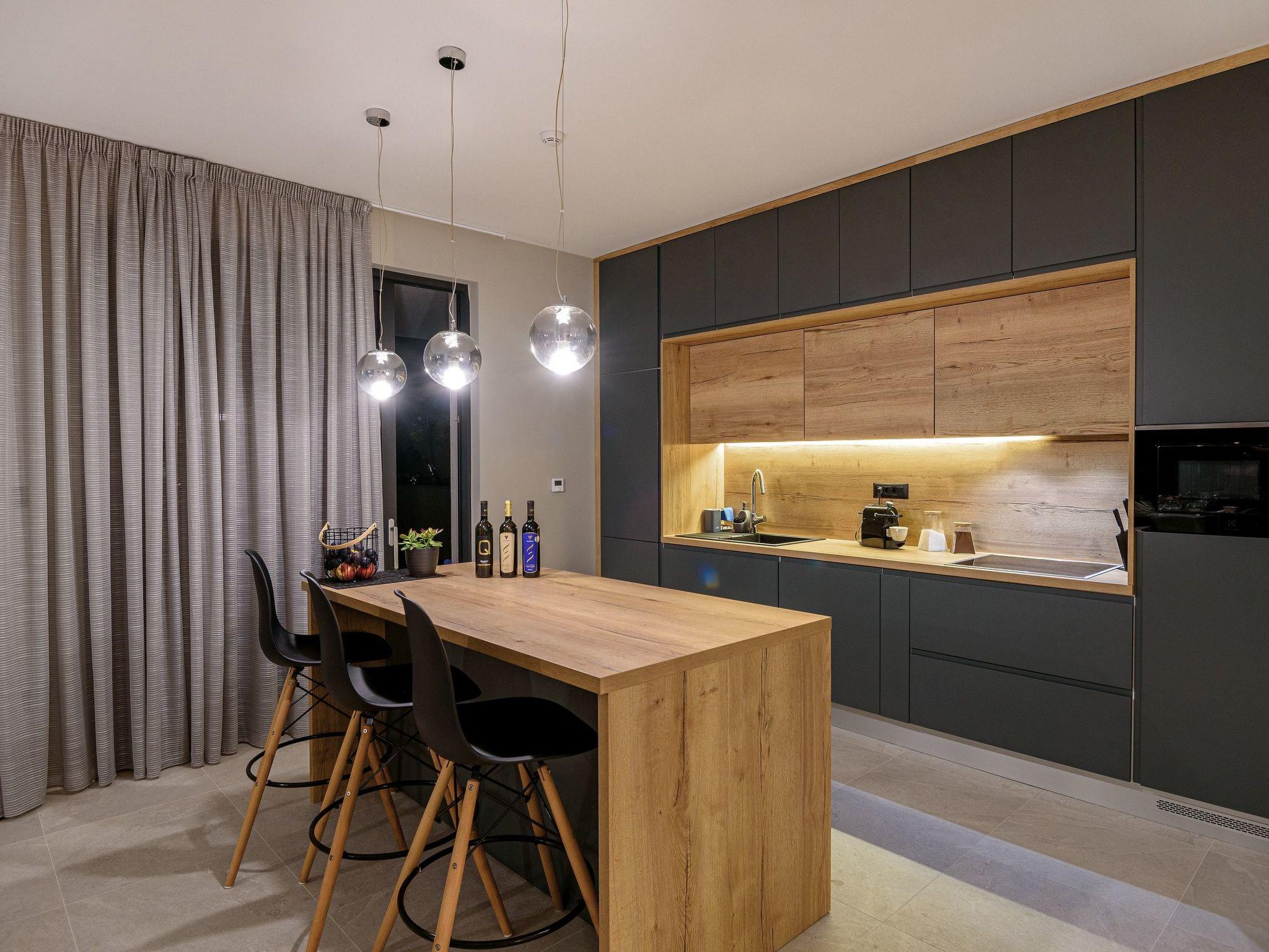 Outdoor dining room area features a stone barbecue grill and is ideal for morning coffee or for dinner under the stars. Living room is connected to the terrace by large glass walls, so you can enjoy the views while resting on our custom made, comfortable sofas. A top-notch kitchen connects to the dining area with an indoor dining room table.