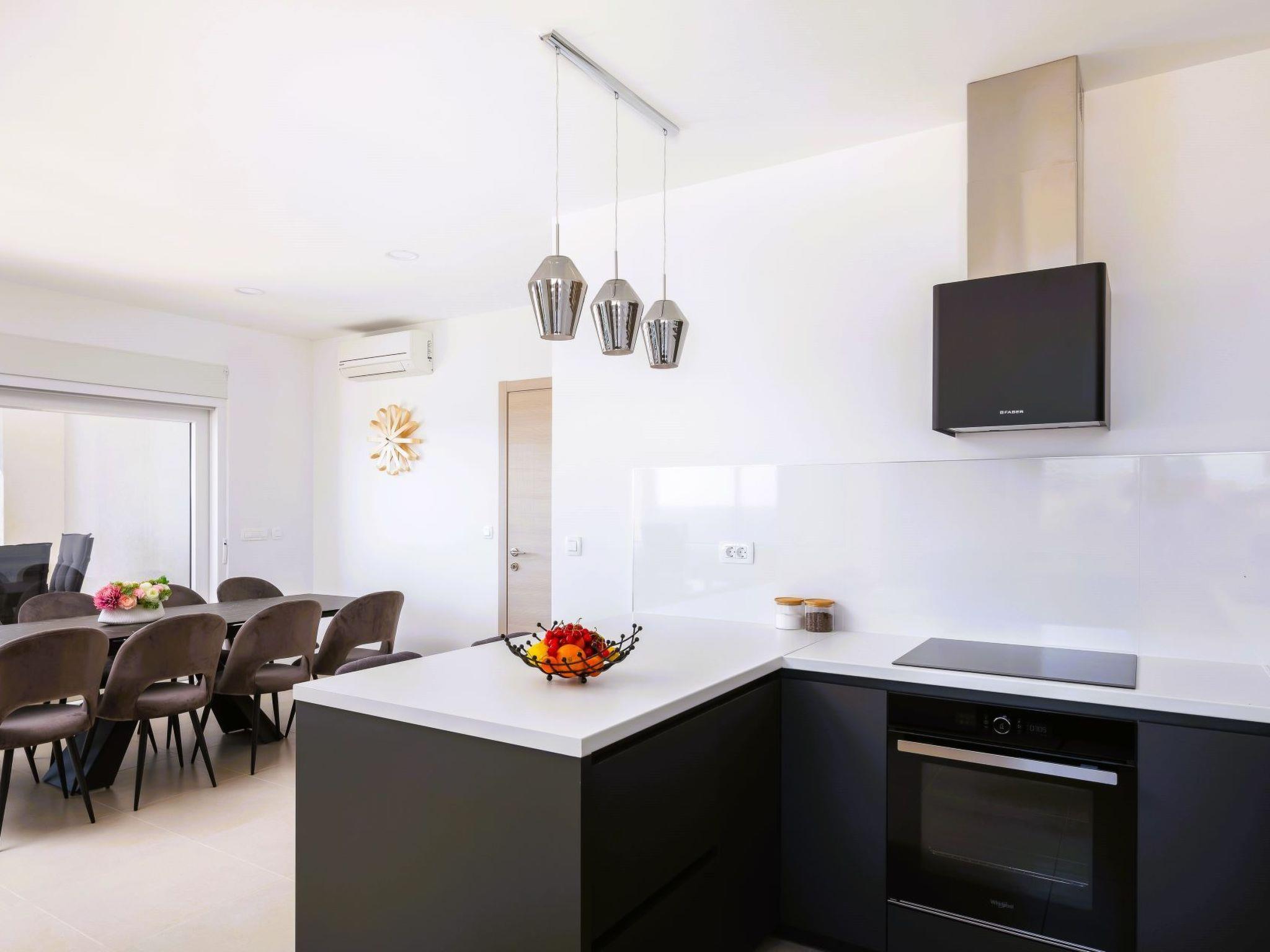Inside, the villa is fully equipped to meet your needs, featuring air conditioning throughout to provide a cool retreat from the warm Mediterranean climate. With four well-appointed bedrooms and five bathrooms, each guest is assured privacy and convenience. The house features a washing machine for your sole use, ensuring that all the comforts of home are at your fingertips. The kitchen is equipped with modern appliances including a dishwasher, a coffee machine compatible with capsules/pods, and an electric kettle, all designed to make your stay as comfortable and hassle-free as possible.