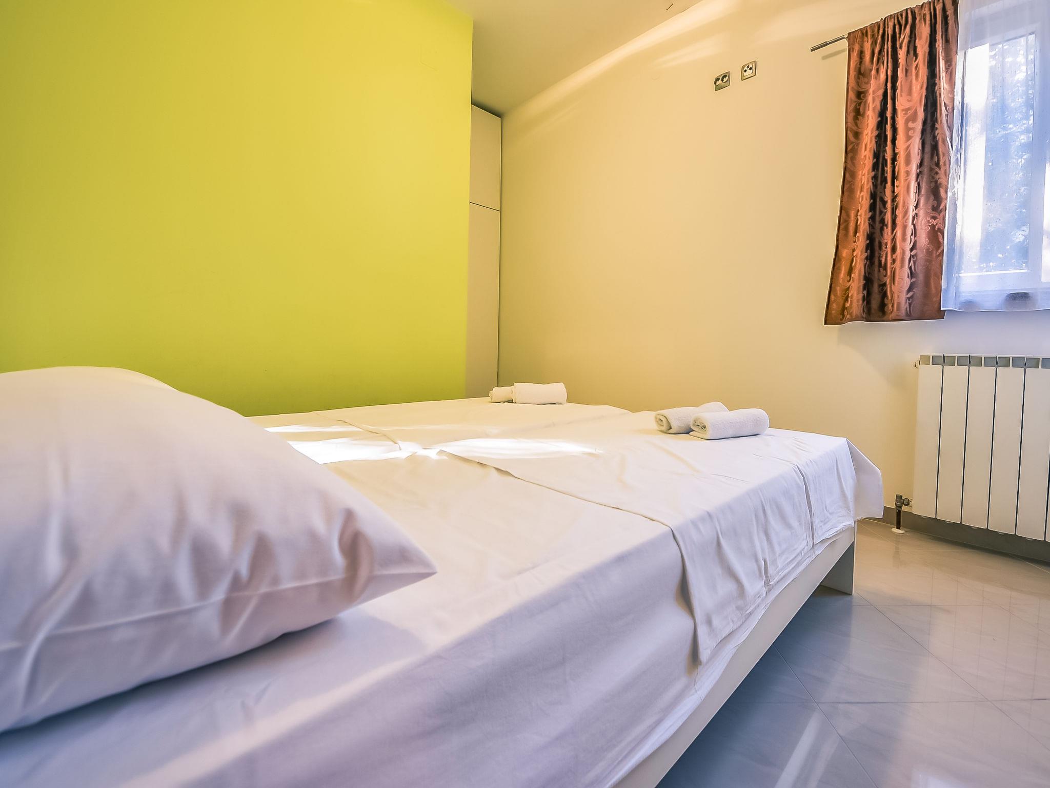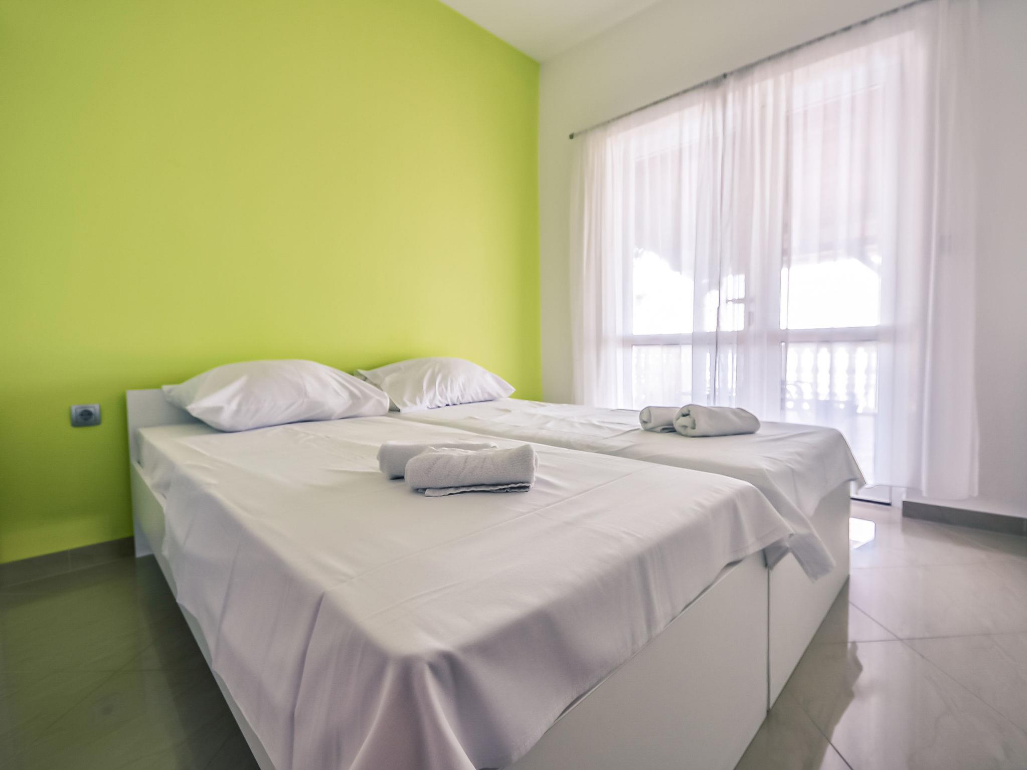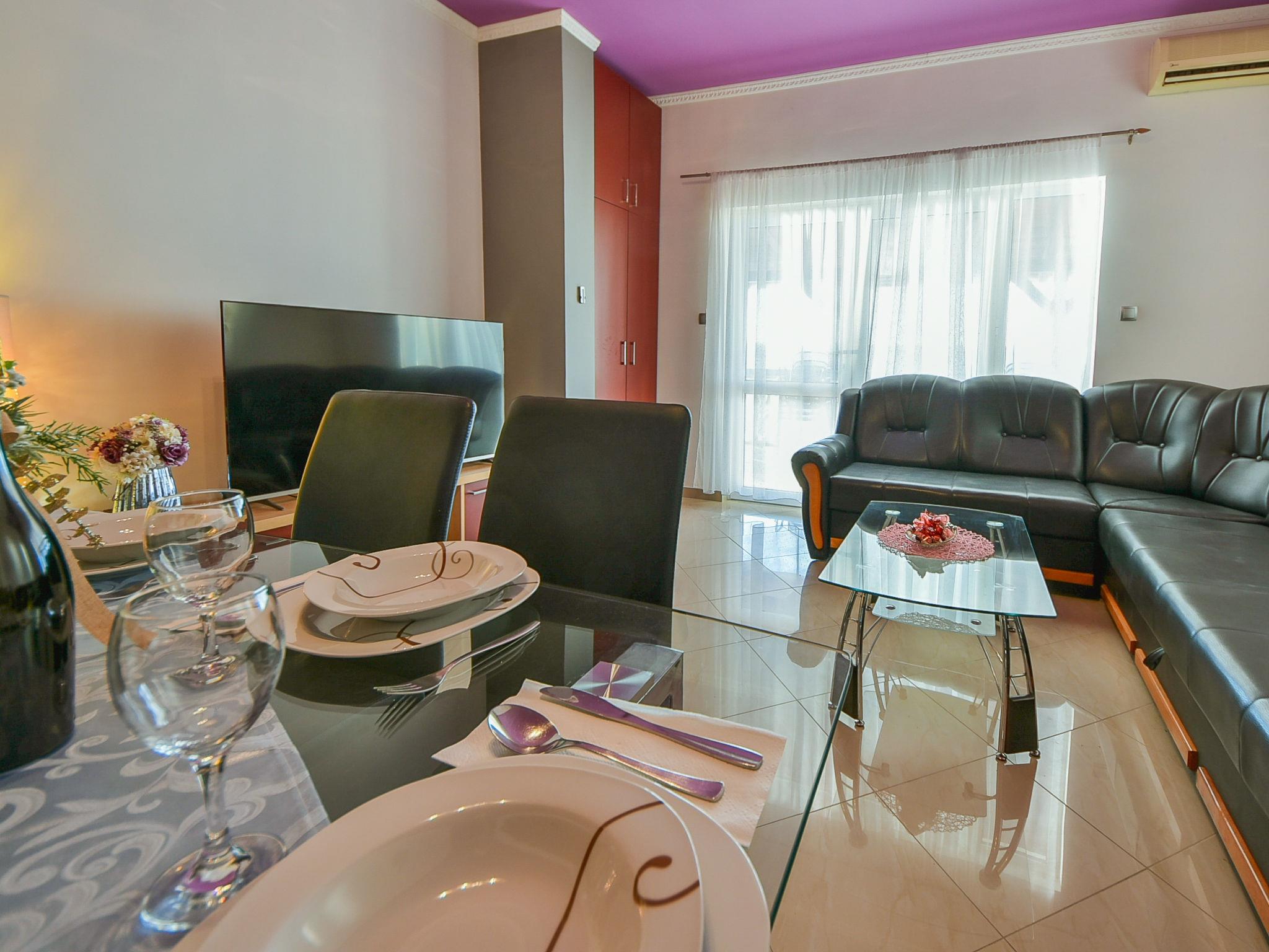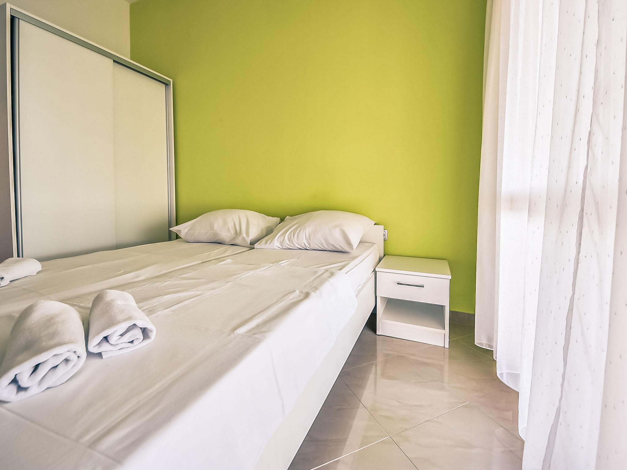 4-room apartment 80 m2 on 1st floor, south-west facing position. Living/dining room with satellite TV (flat screen), air conditioning. Exit to the terrace. 1 room with 1 double bed (2 x 80 cm, length 200 cm). Exit to the terrace. 2 rooms, each room with 1 double bed (2 x 80 cm, length 200 cm). Open kitchen (4 hot plates, oven, dishwasher, microwave, freezer). Shower/WC. No heating option. Terrace 25 m2, roofed. Terrace furniture. View of the sea. Facilities: washing machine. Internet (WiFi, free).