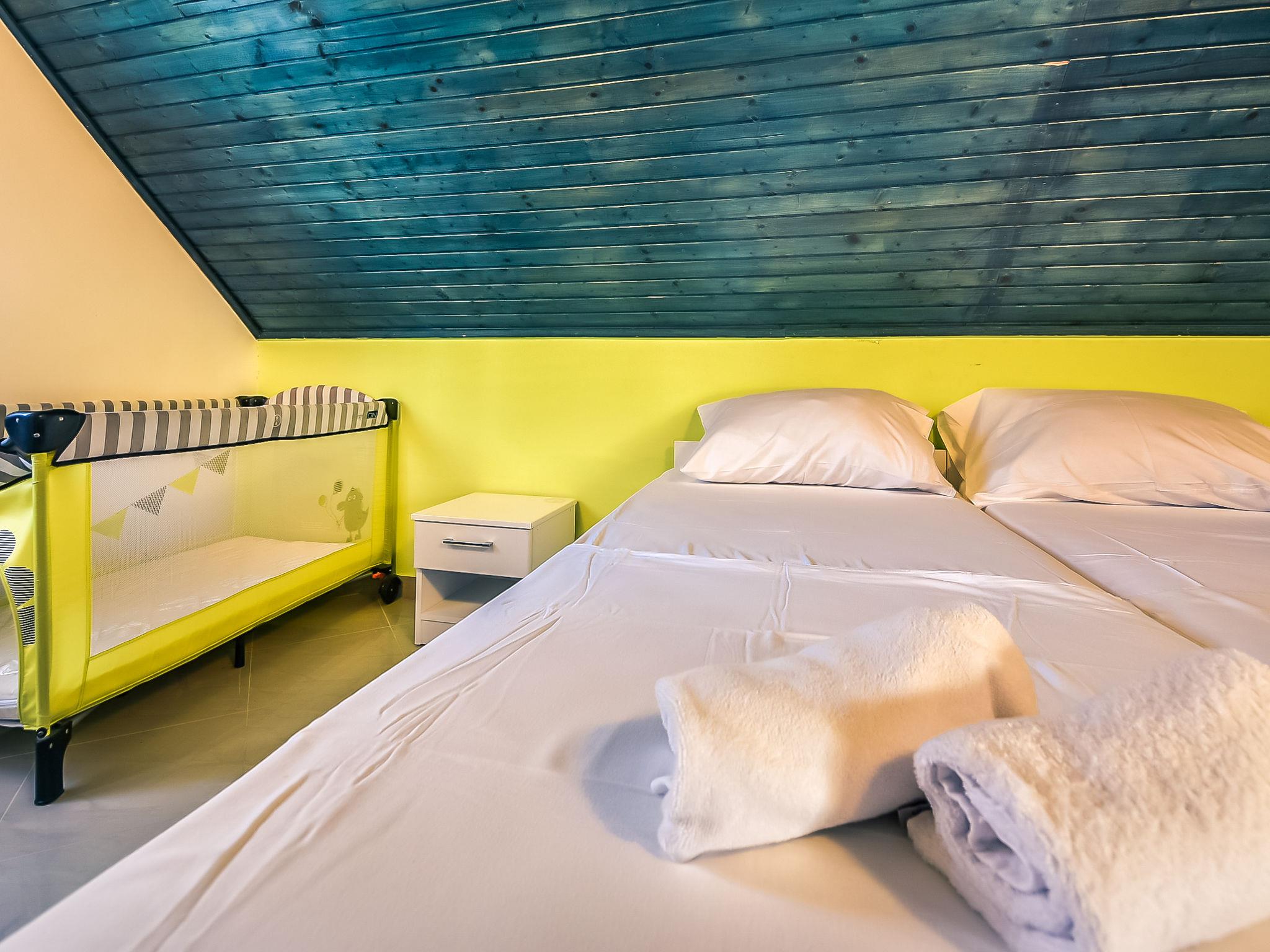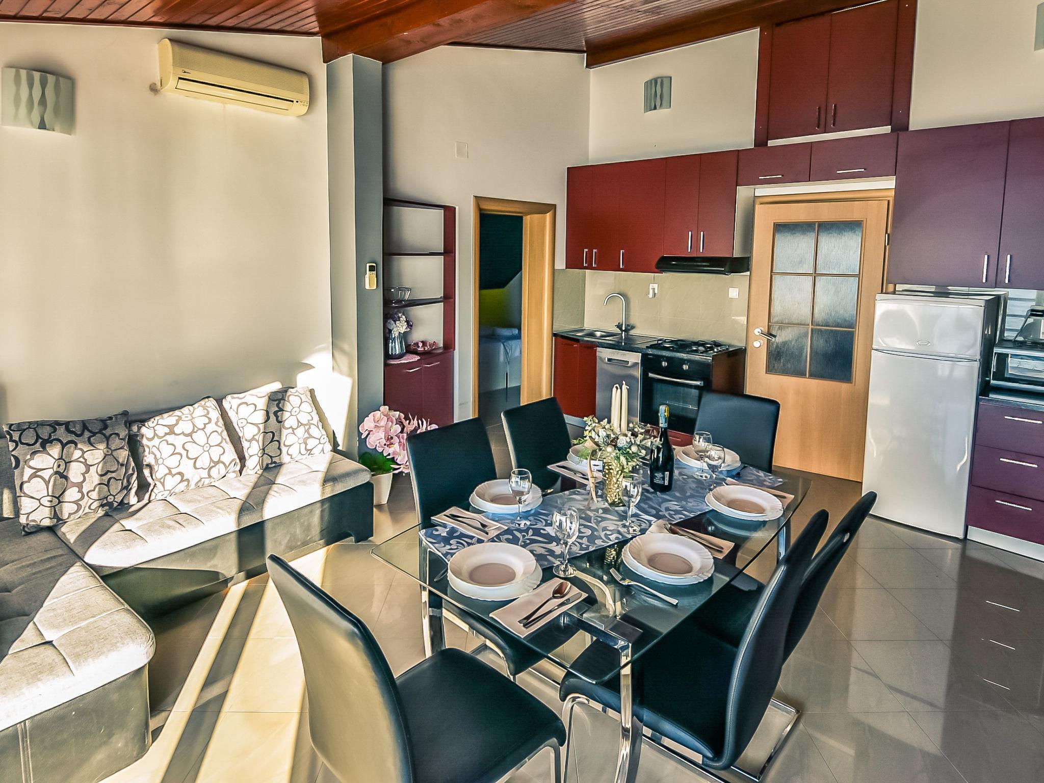 4-room apartment 80 m2 on 2nd floor, south-west facing position. Living/dining room with satellite TV (flat screen), air conditioning. Exit to the balcony. 2 rooms with sloping ceilings, each room with 1 double bed (2 x 80 cm, length 200 cm). 1 room with 2 beds (80 cm, length 200 cm). Open kitchen (4 hot plates, oven, dishwasher, microwave, freezer). 2 showers/WC. No heating option. Balcony 8 m2. Balcony furniture. View of the sea. Facilities: washing machine. Internet (WiFi, free).